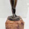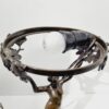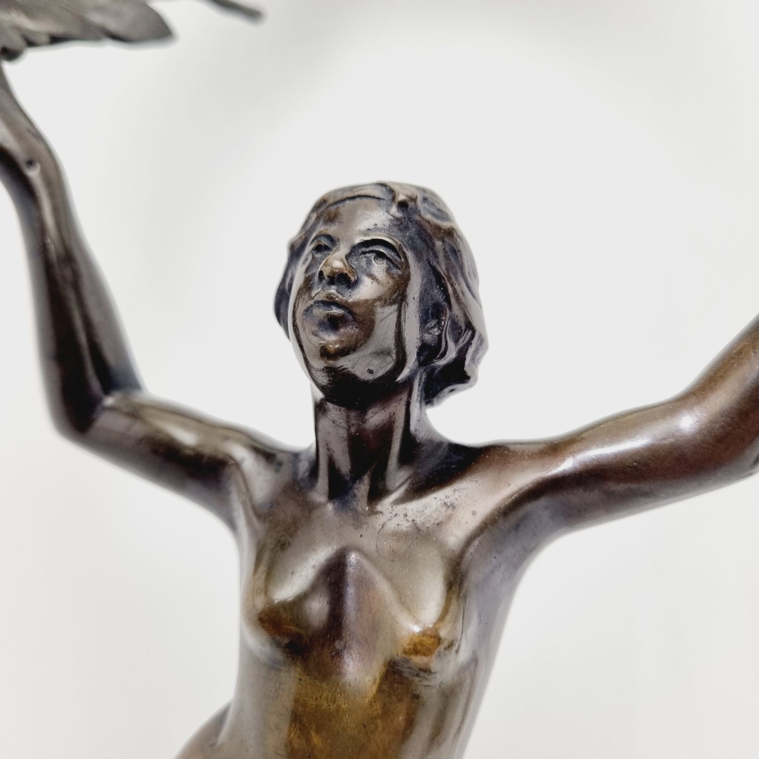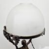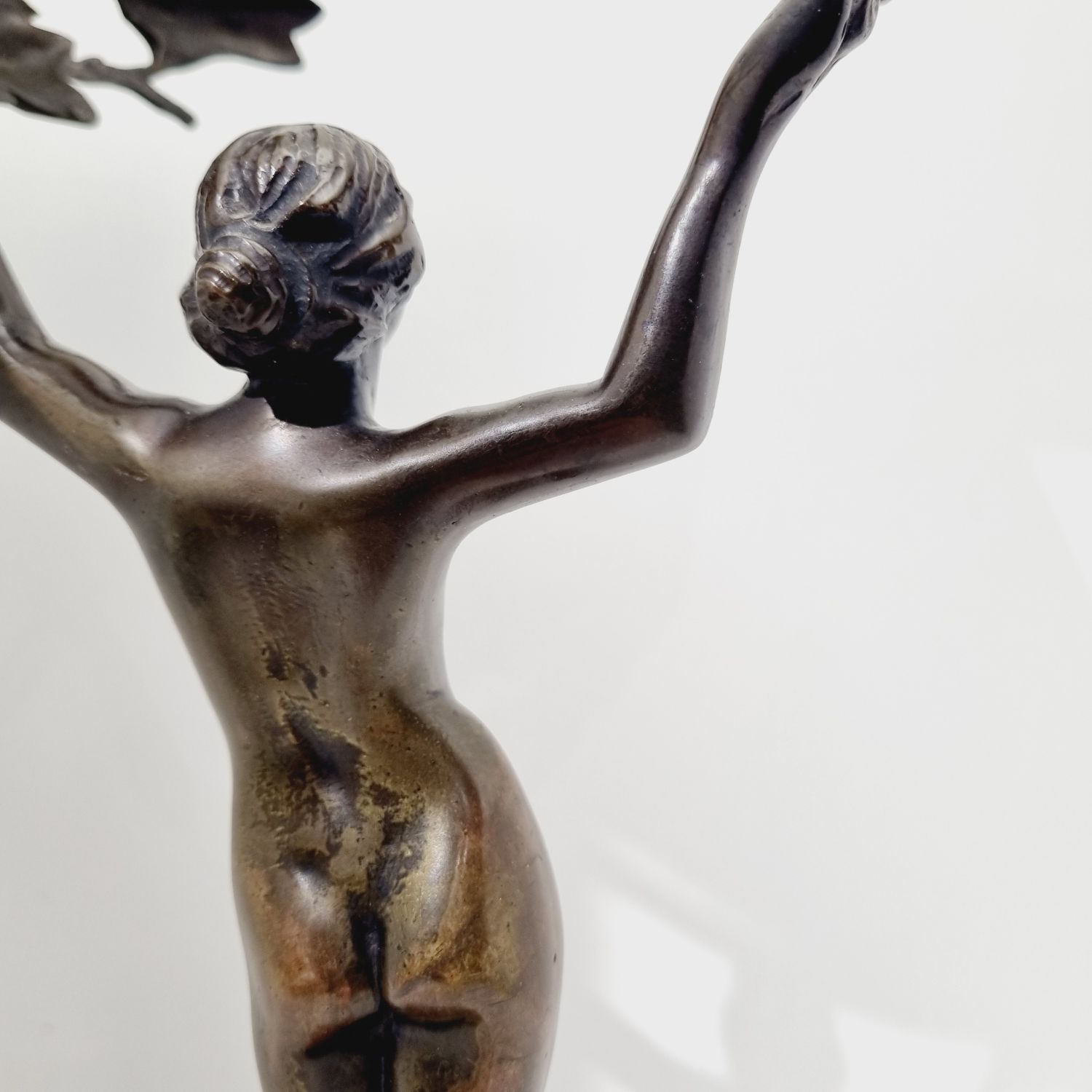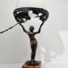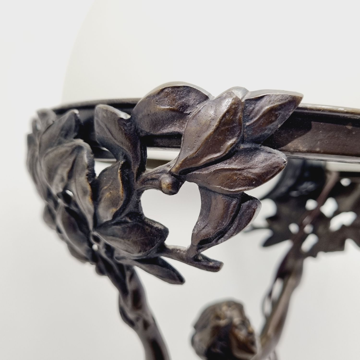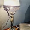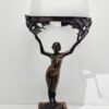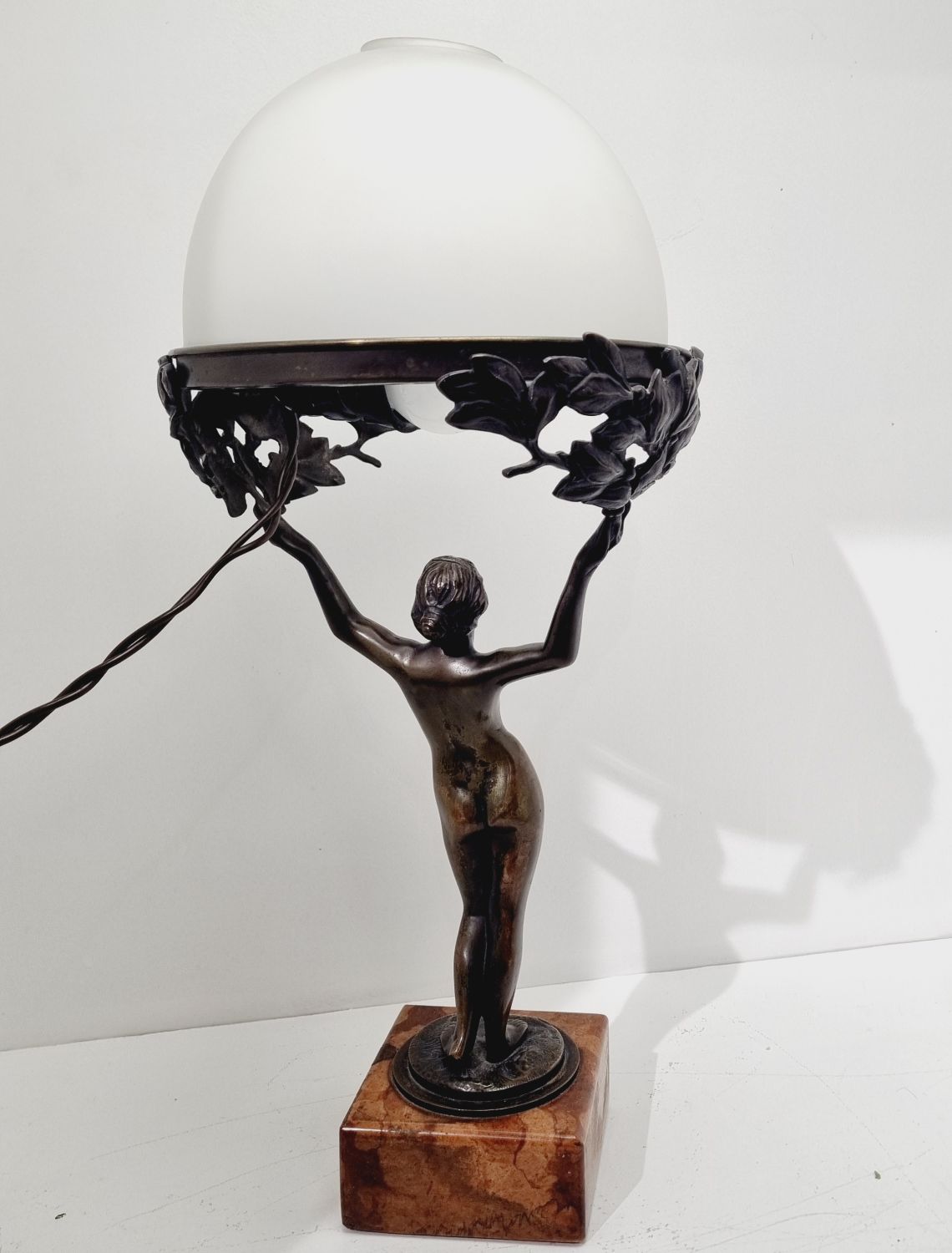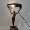 Szecessziós asztali lámpa bronzból, amely az 1920-as években készült. Díszes, organikus formavilág, ívelt vonalak, stilizált női alak, hangsúlyos növényi ornamentika jellemzi. Működőképes. A búra nem eredeti. Méretei: 33 x 19 x 3 cm.