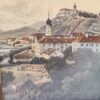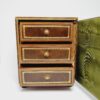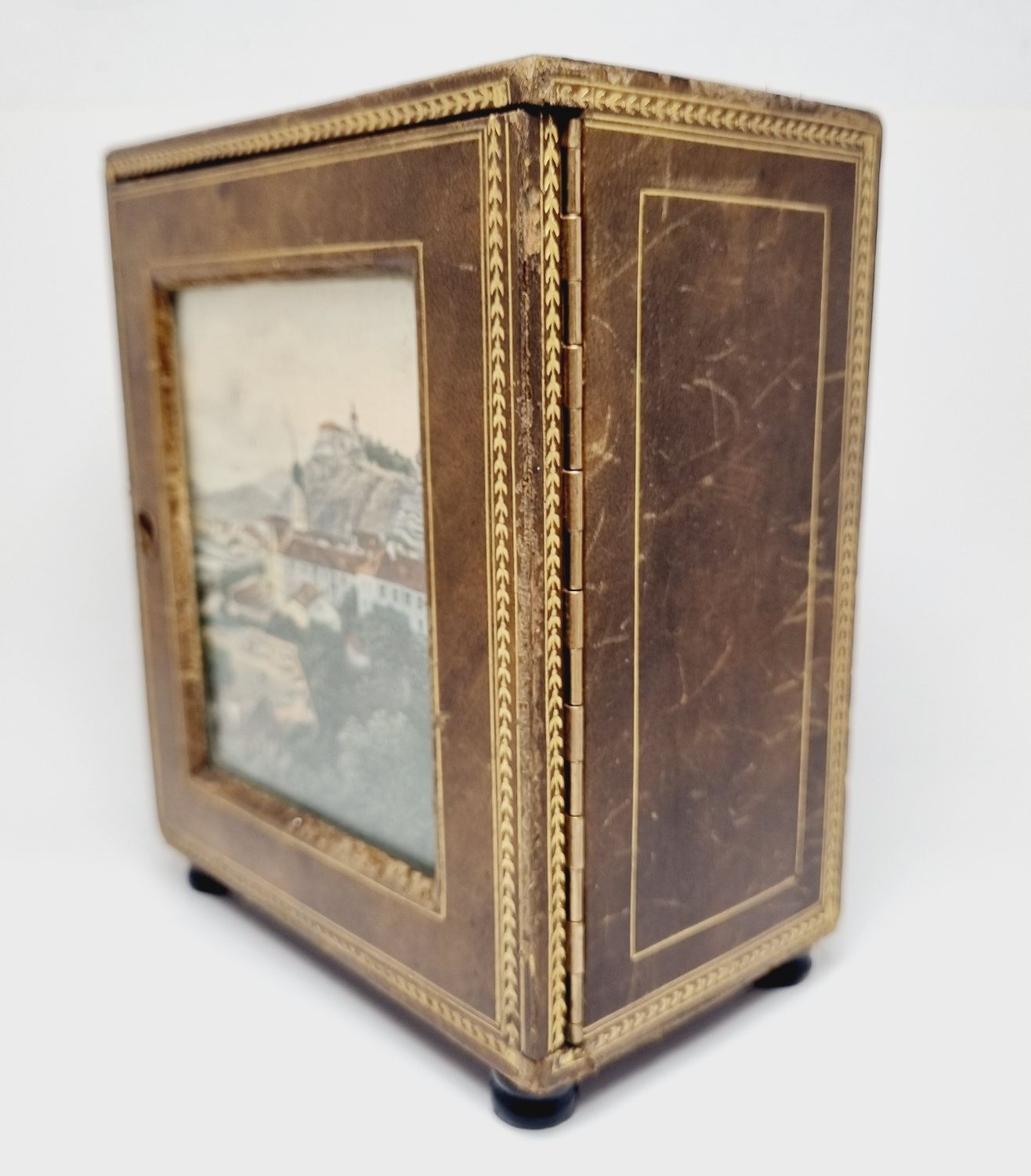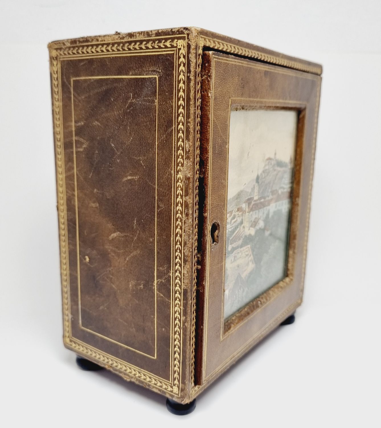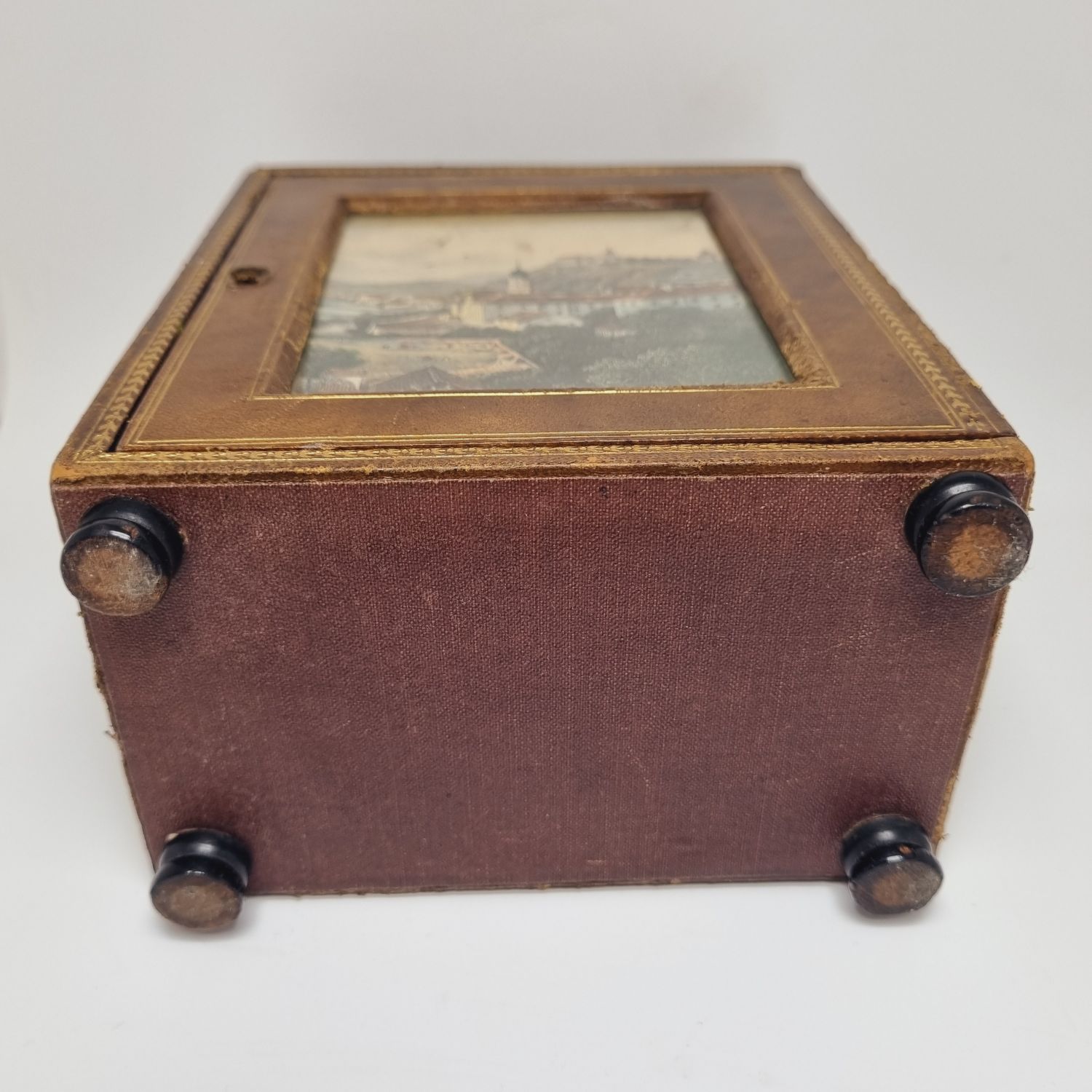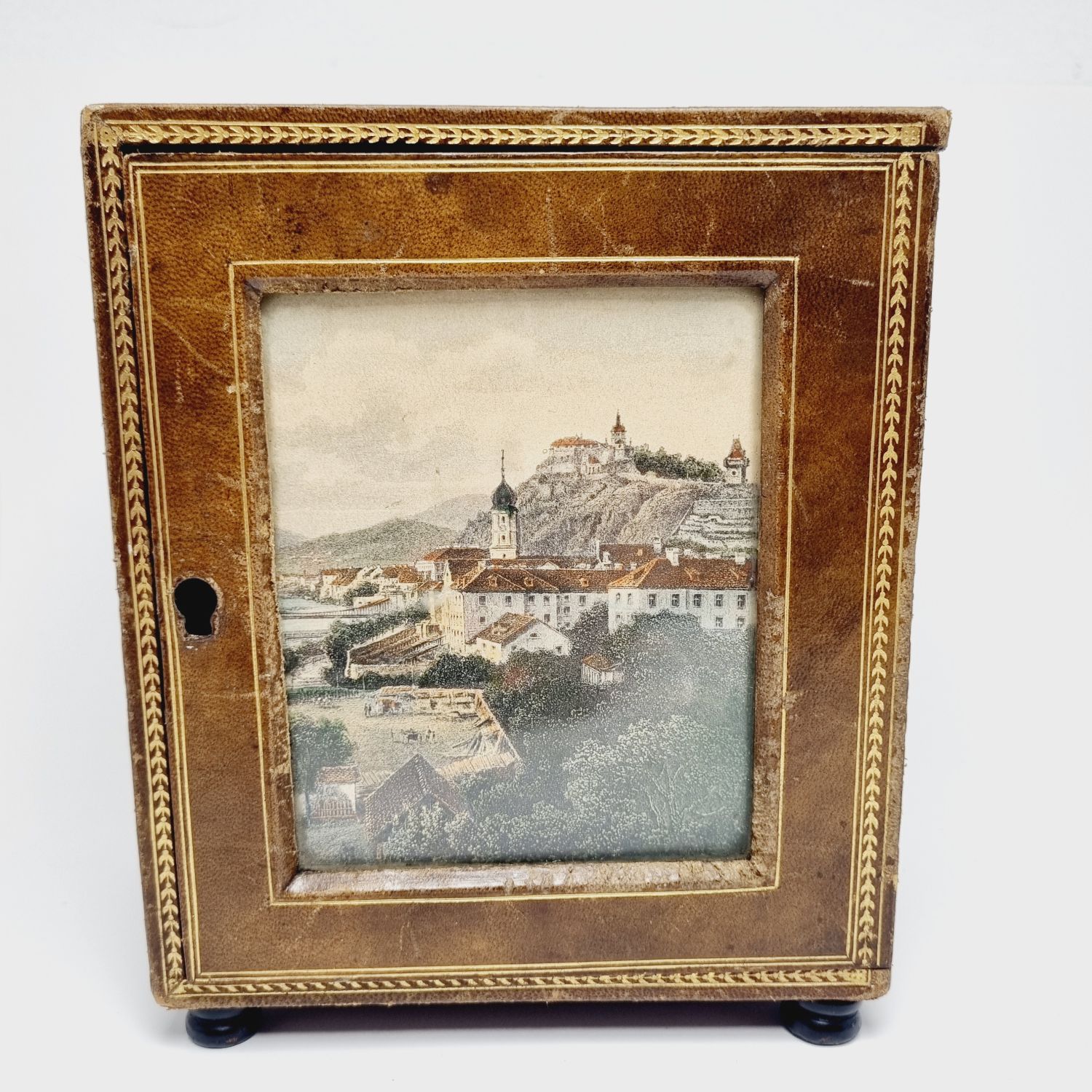Ékszertartó dobozka a XX.század elejéről. 3 fiókos, tükrében városkép, amely papírnyomat. Bájos, antik hatást keltő egyedi darab. Korának megfelelő állapotú. Méretei: 16 x 13 x 8 cm.