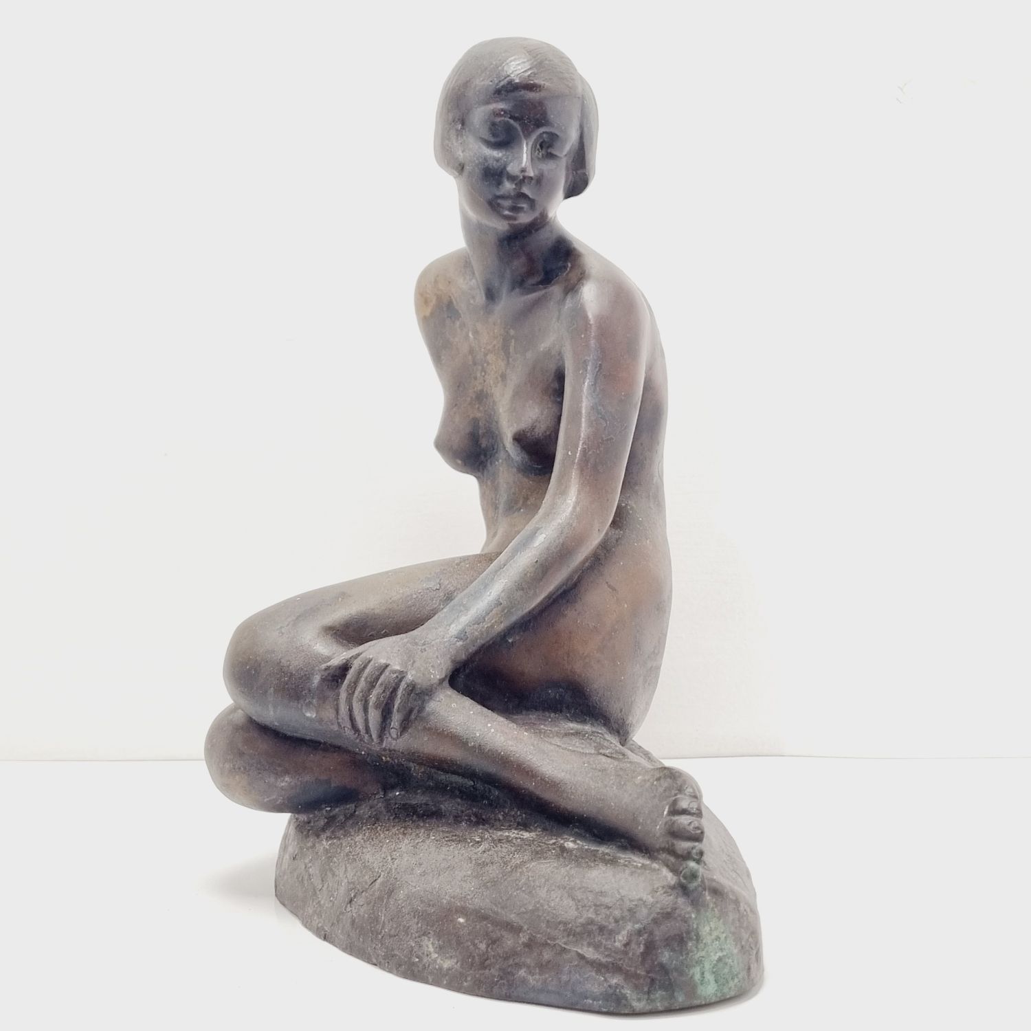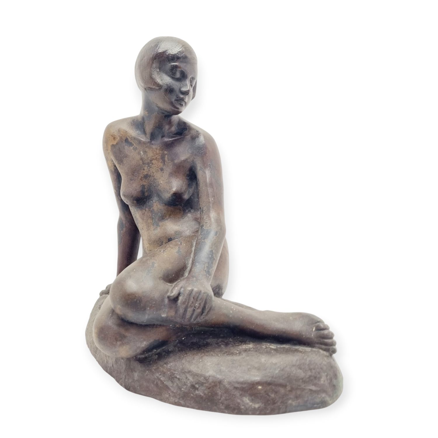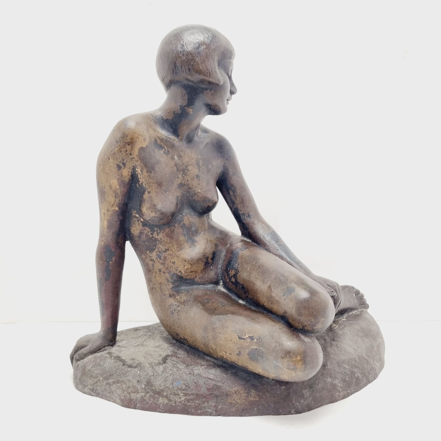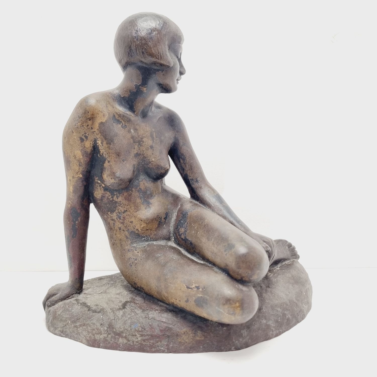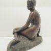 Kövön ülő nő, amely a századfordulón készült. Anyaga öntöttvas bronzírozva. Jelzett. Felülete kissé kopott. Nyugalmat árasztó, letisztult formavilágú art deco stílusú műalkotás. Méretei: 26 x 27 x 16 cm.