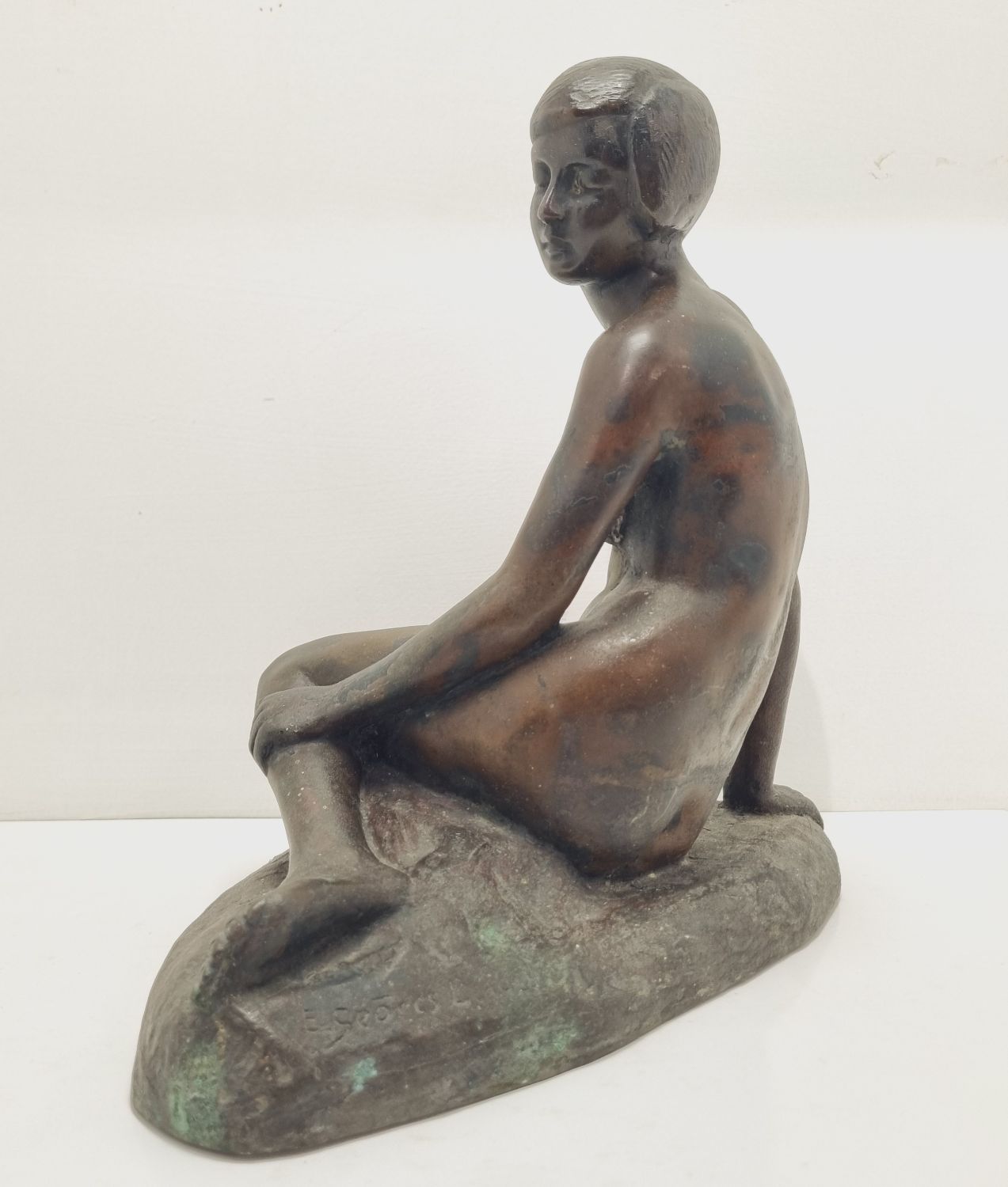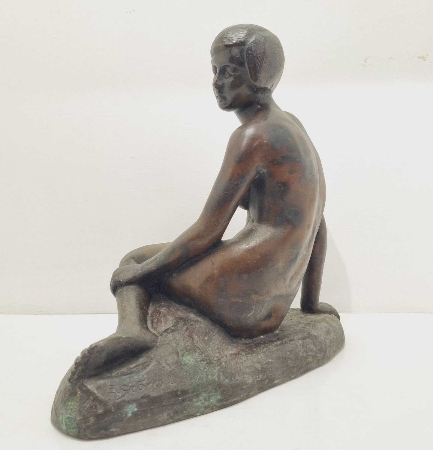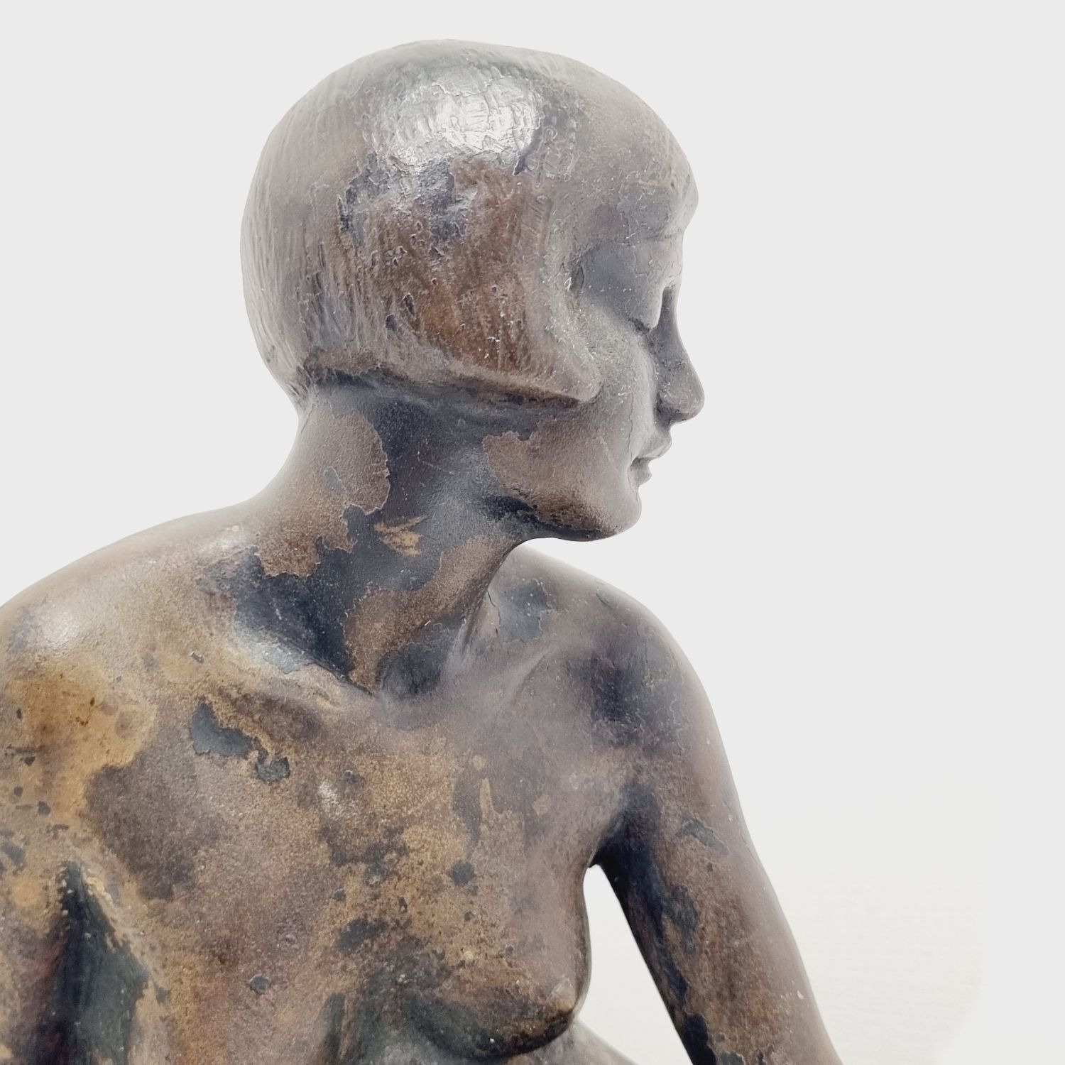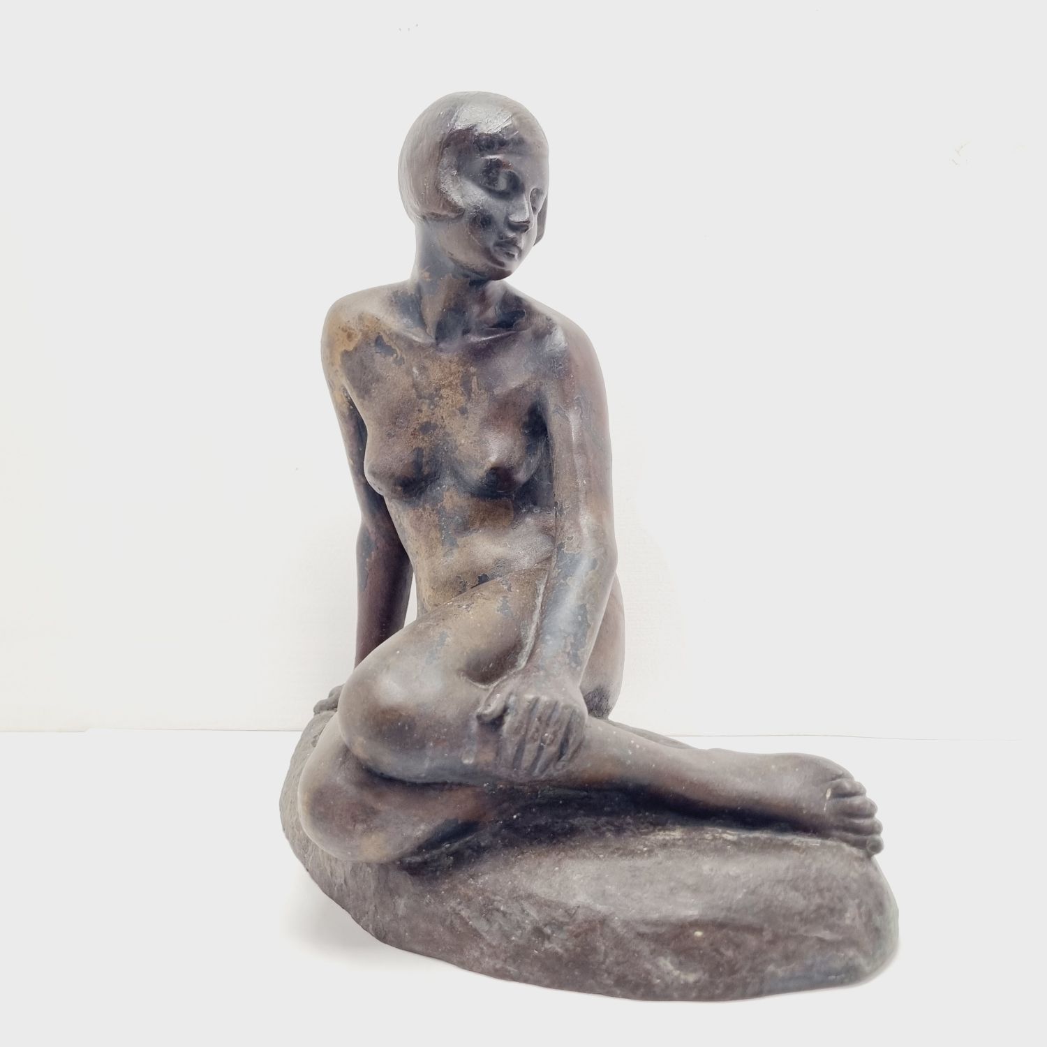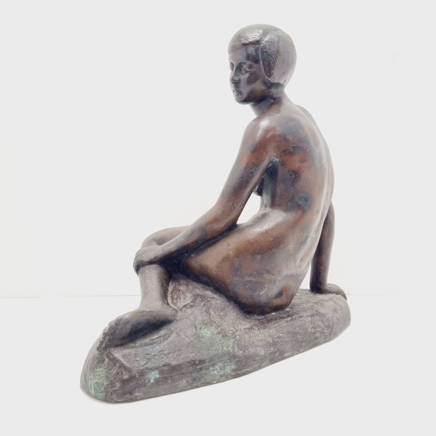 Kövön ülő nő, amely a századfordulón készült. Anyaga öntöttvas bronzírozva. Jelzett. Felülete kissé kopott. Nyugalmat árasztó, letisztult formavilágú art deco stílusú műalkotás. Méretei: 26 x 27 x 16 cm.