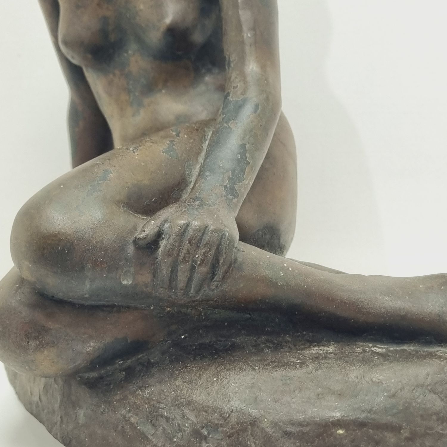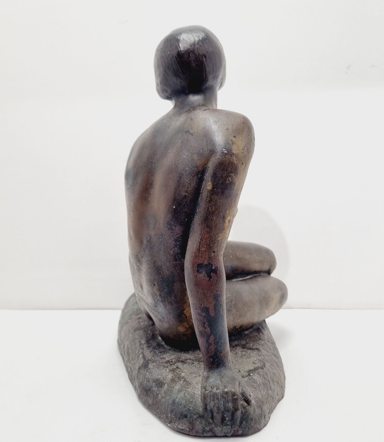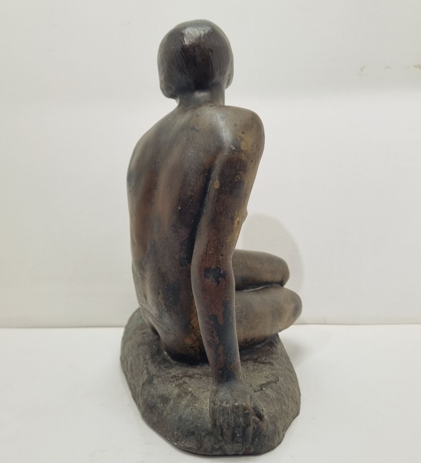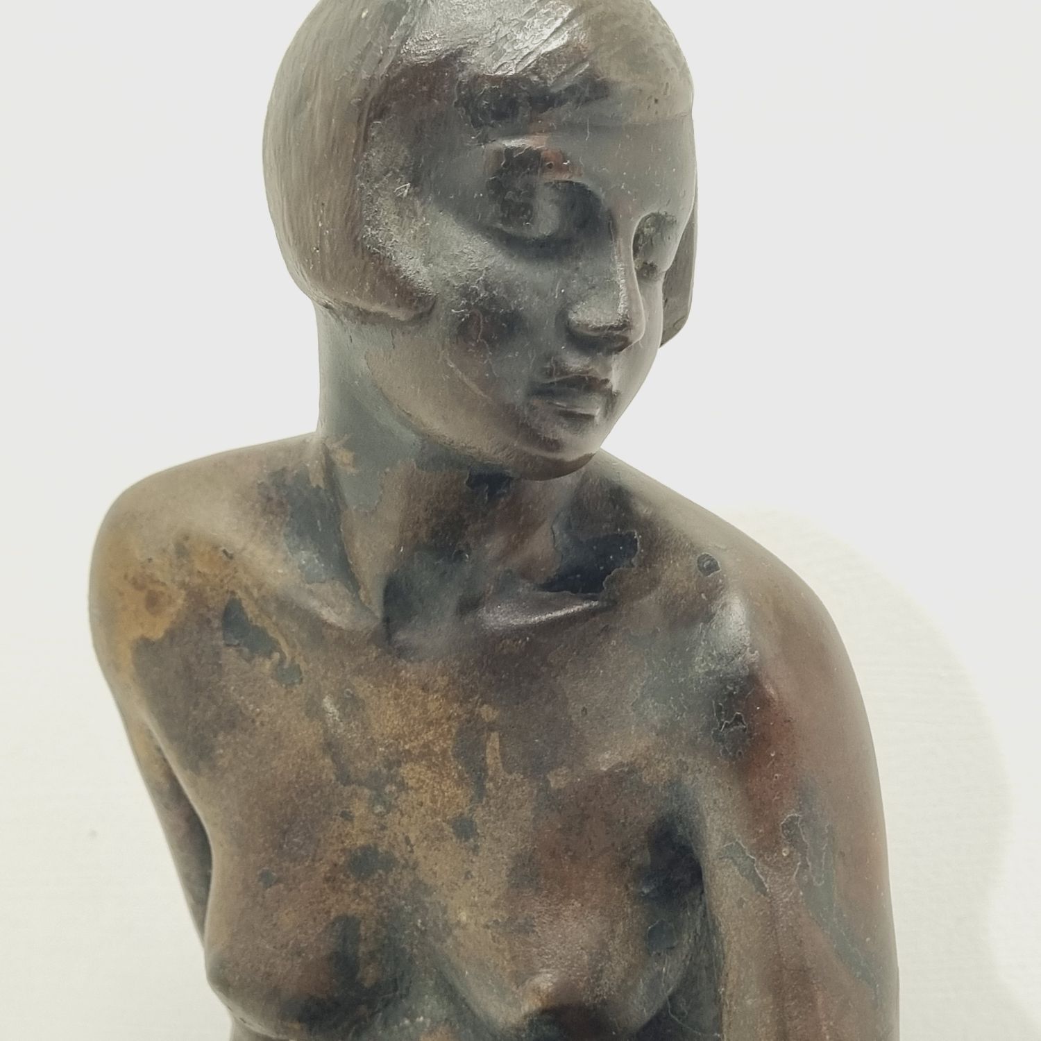 Kövön ülő nő, amely a századfordulón készült. Anyaga öntöttvas bronzírozva. Jelzett. Felülete kissé kopott. Nyugalmat árasztó, letisztult formavilágú art deco stílusú műalkotás. Méretei: 26 x 27 x 16 cm.