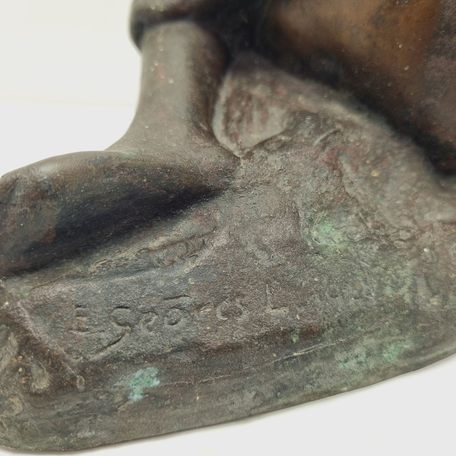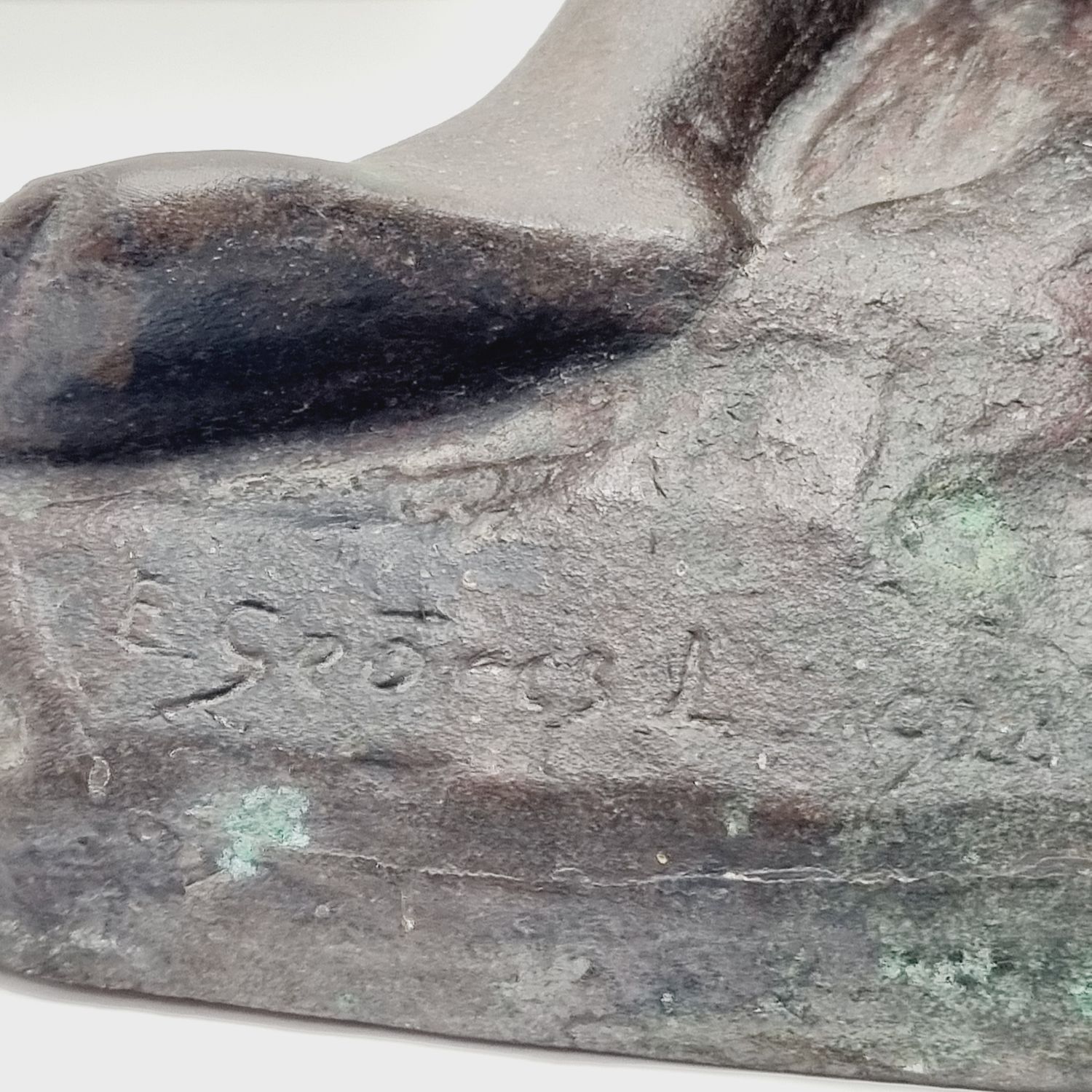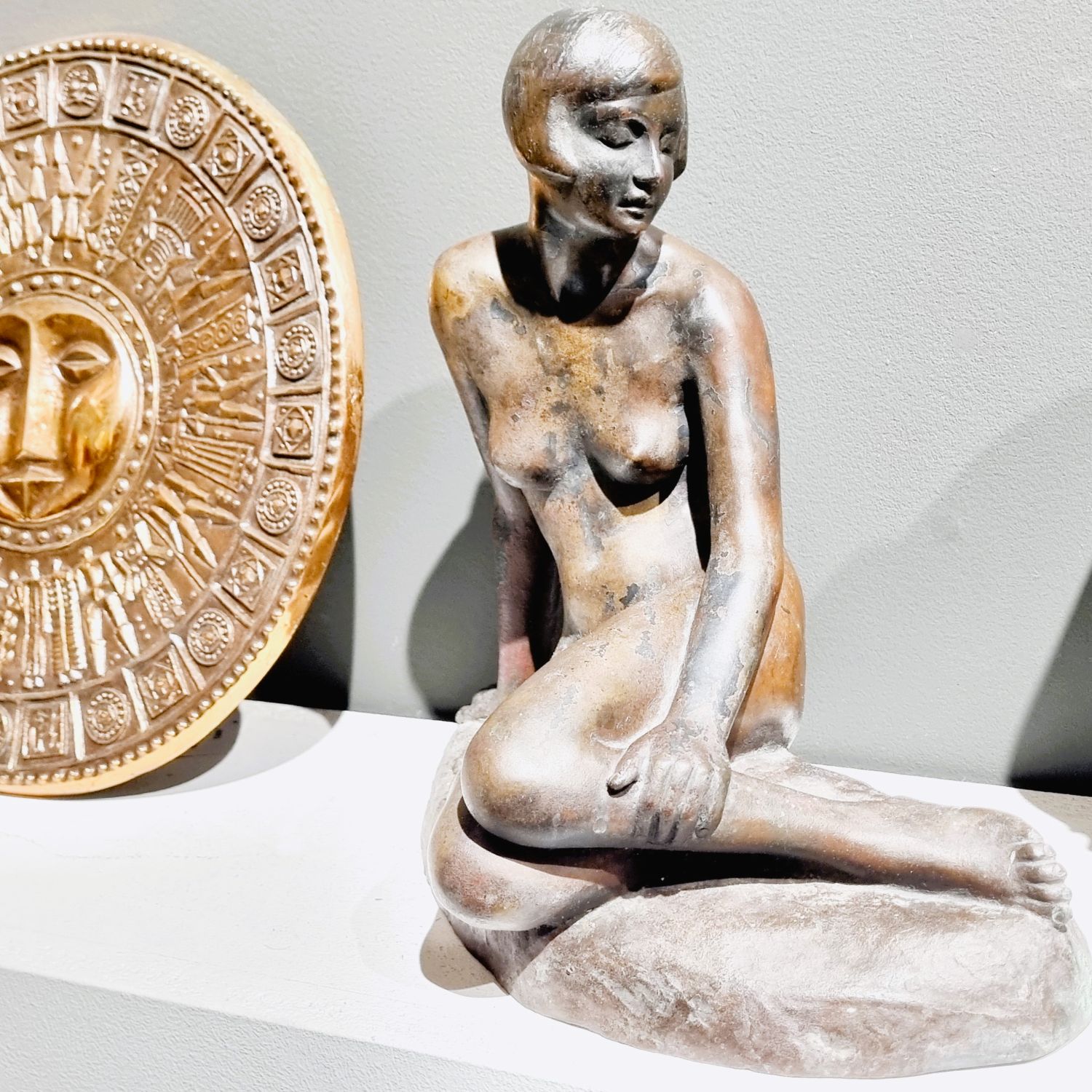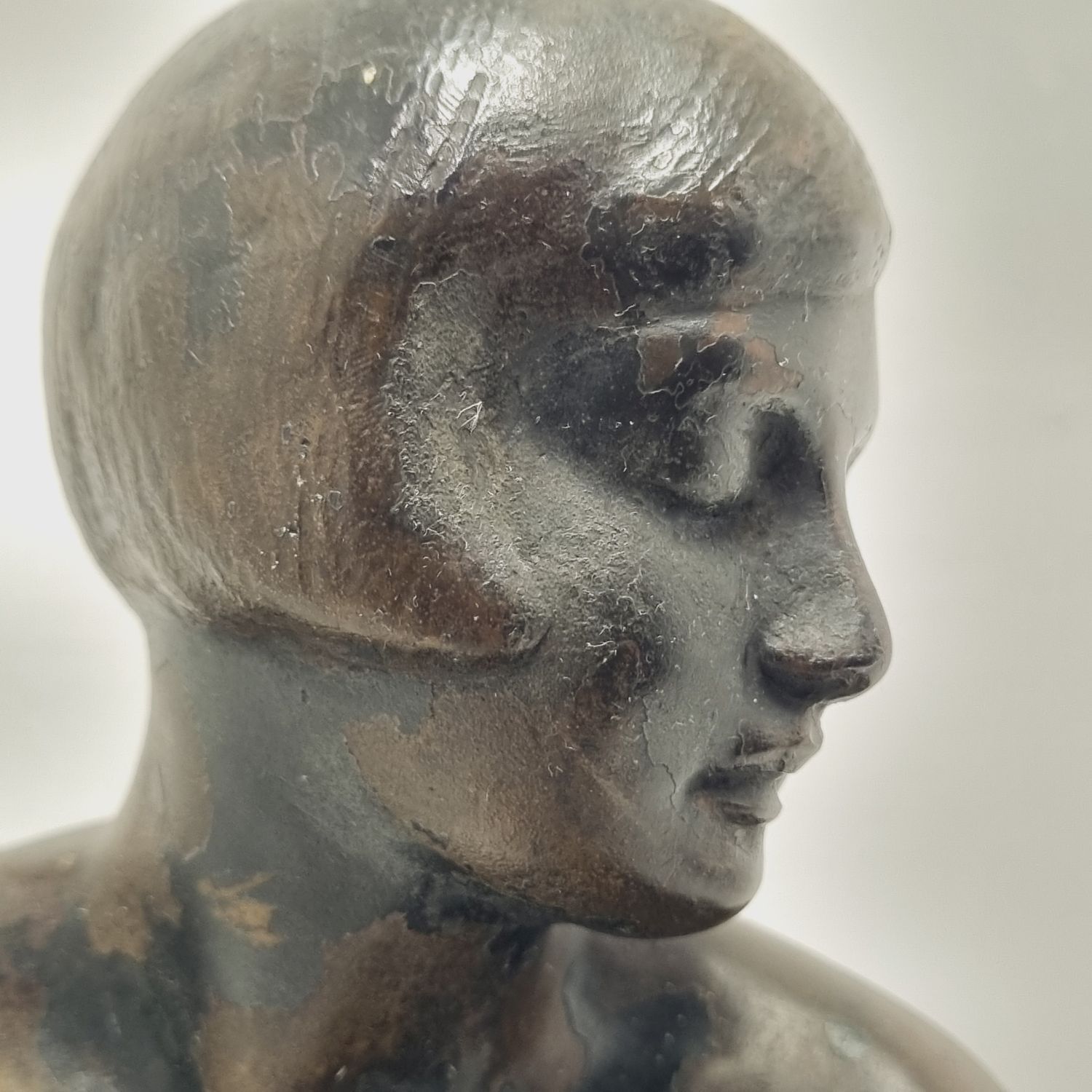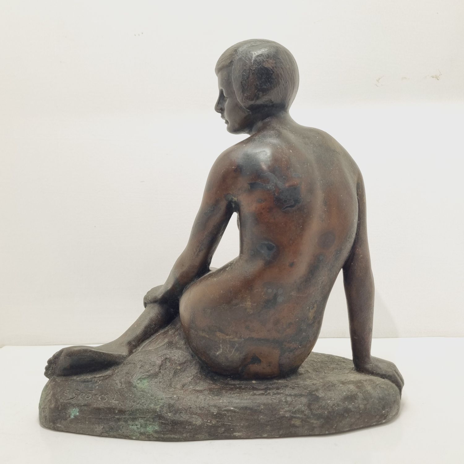 Kövön ülő nő, amely a századfordulón készült. Anyaga öntöttvas bronzírozva. Jelzett. Felülete kissé kopott. Nyugalmat árasztó, letisztult formavilágú art deco stílusú műalkotás. Méretei: 26 x 27 x 16 cm.