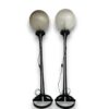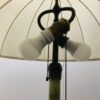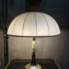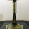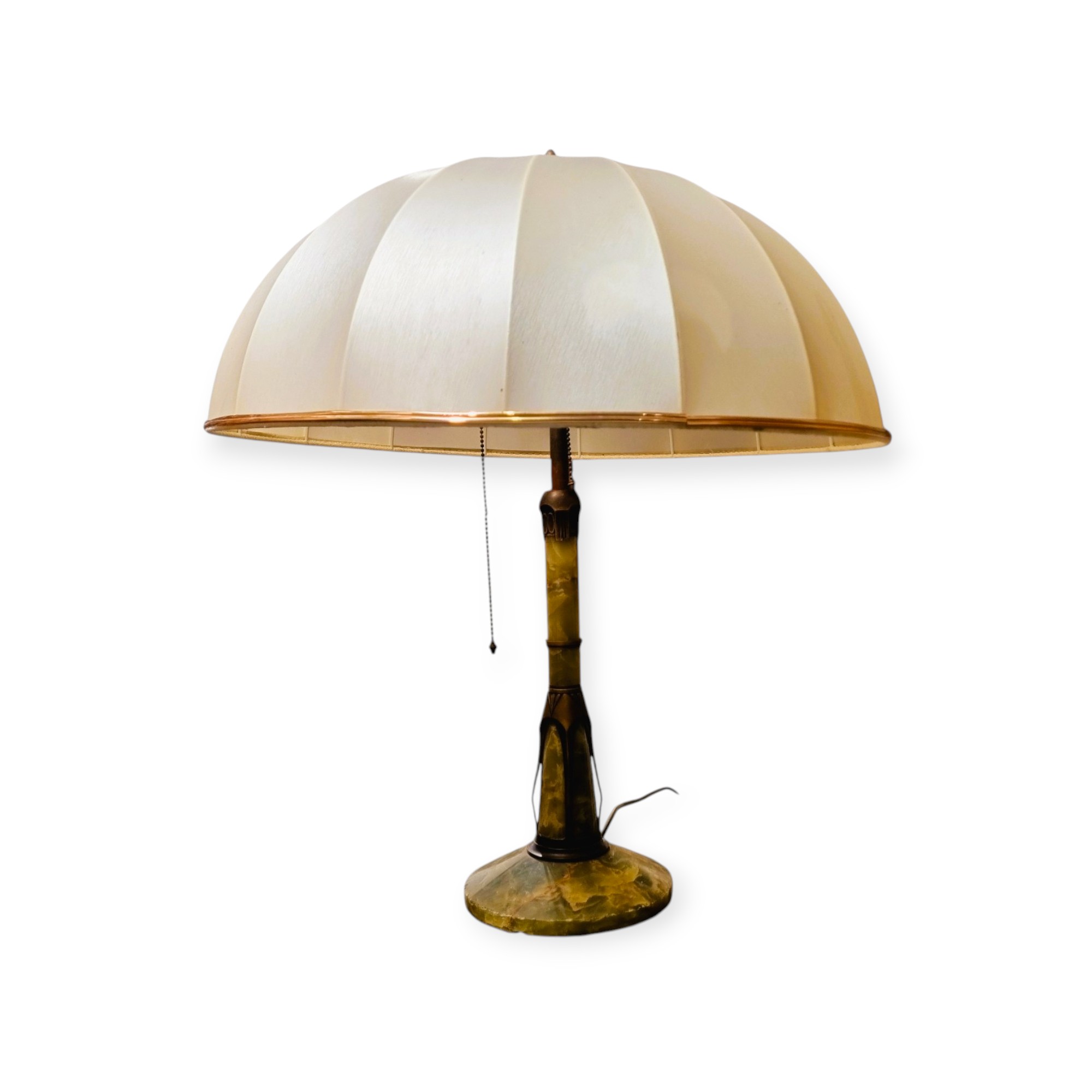 Szecessziós asztali lámpa réz veretes márvány hatású onyx lámpatesttel és elegáns pezsgő színű, arany szegéllyel díszített selyem búrával.