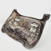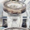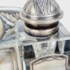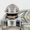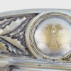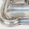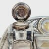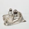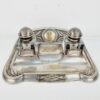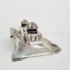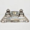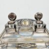 Szecessziós asztali tintatartó az 1910-es évek elejéről. Mongrammal jelölt, ezüstözött fém. Hangsúlyos, hullámzó ornamentika,lágy növényi formák jellemzik. Korának megfelelő állapotú. Méretei: 11 x 25 x 18 cm.