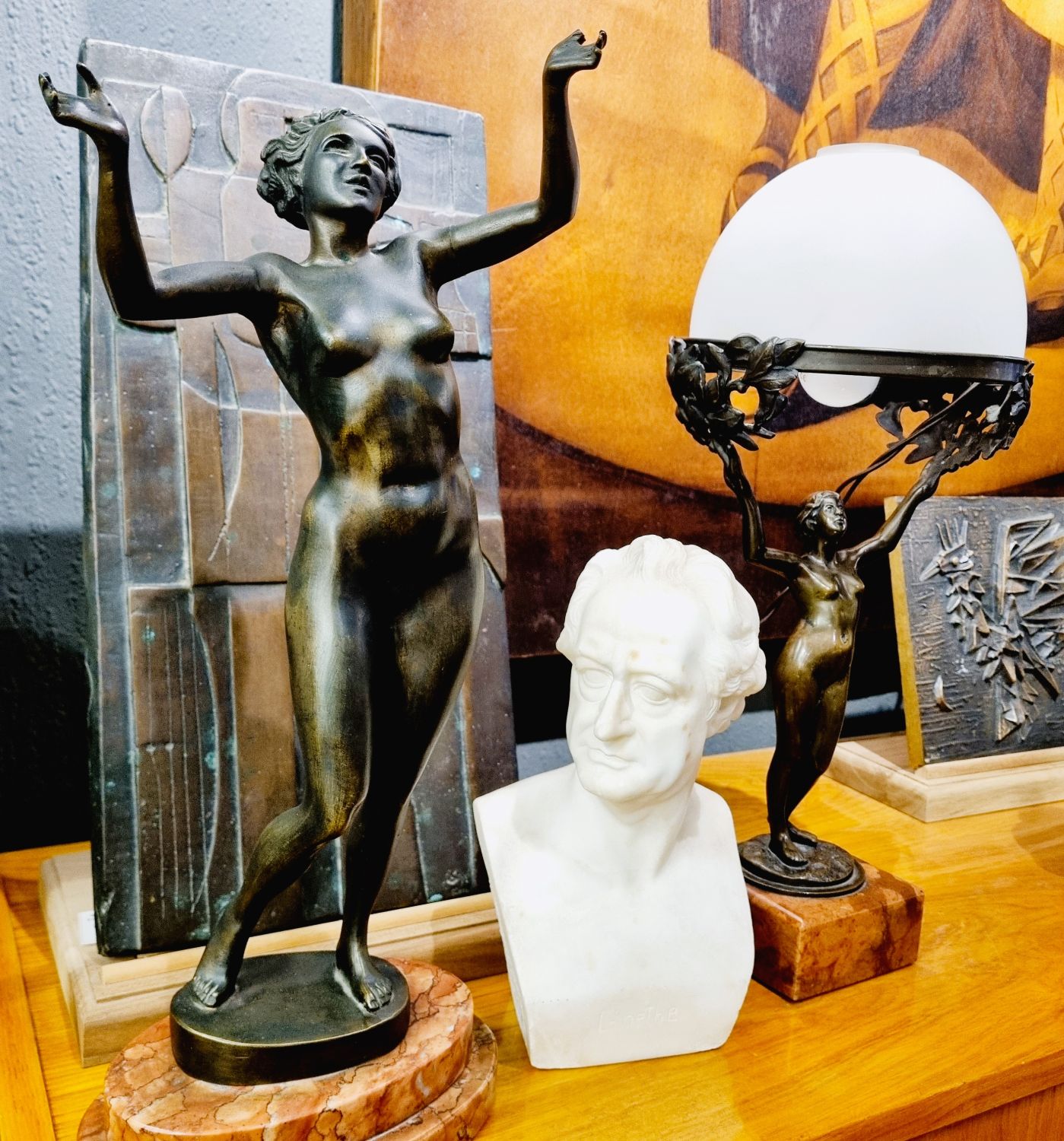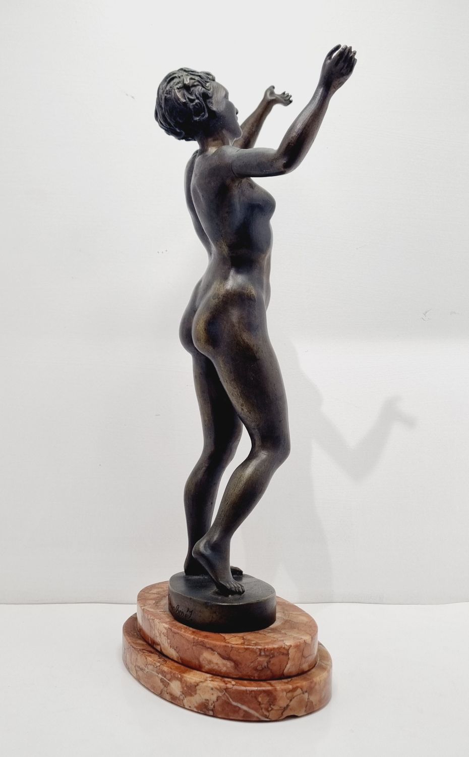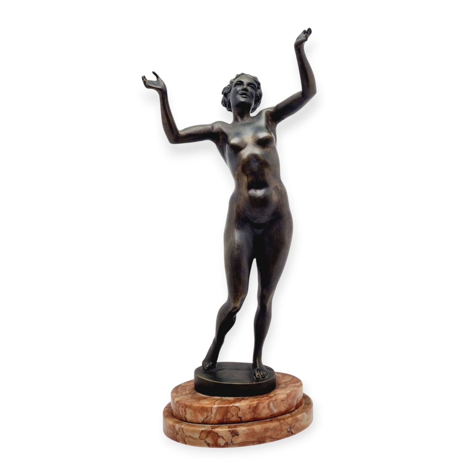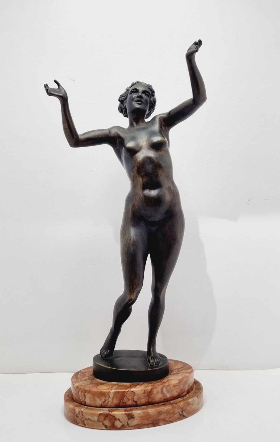 Szentgyörgyi István: Női akt bronz alkotása az 1930-as években készült. A modell múzsaként inspirálta az alkotót – allegórikusan megjelenítve ezzel -a női test szépségét. Patinás antik darab. Korának megfelelő állapotban . Méretei : 43x18x12cm