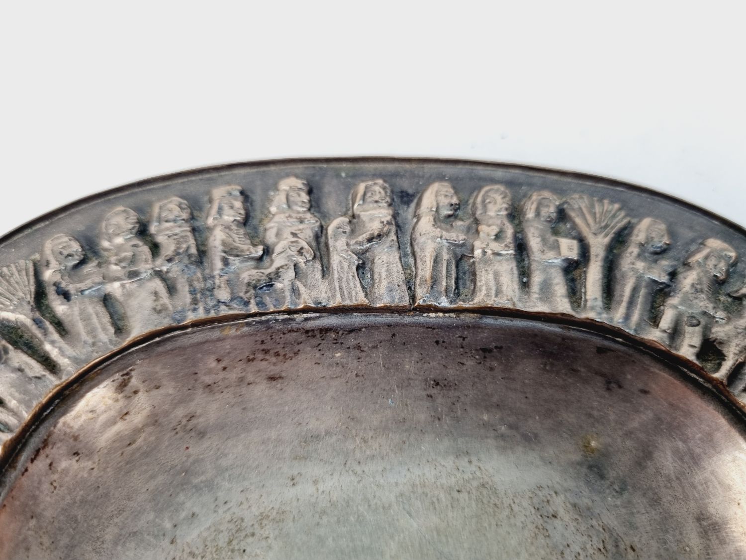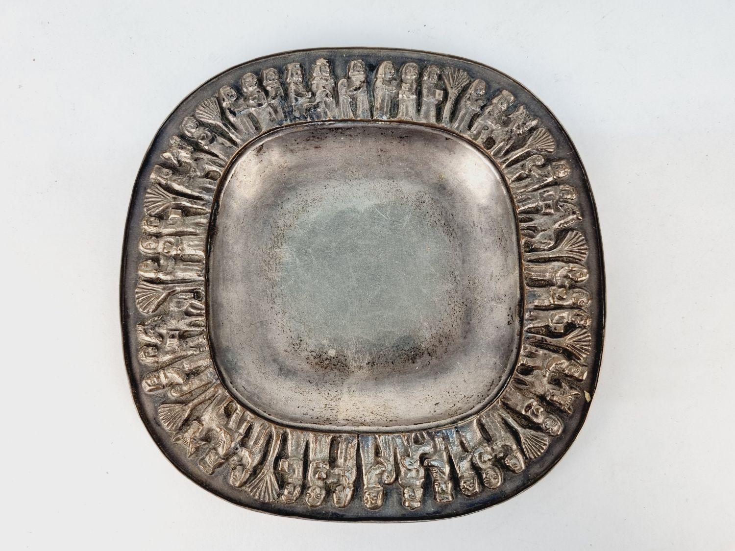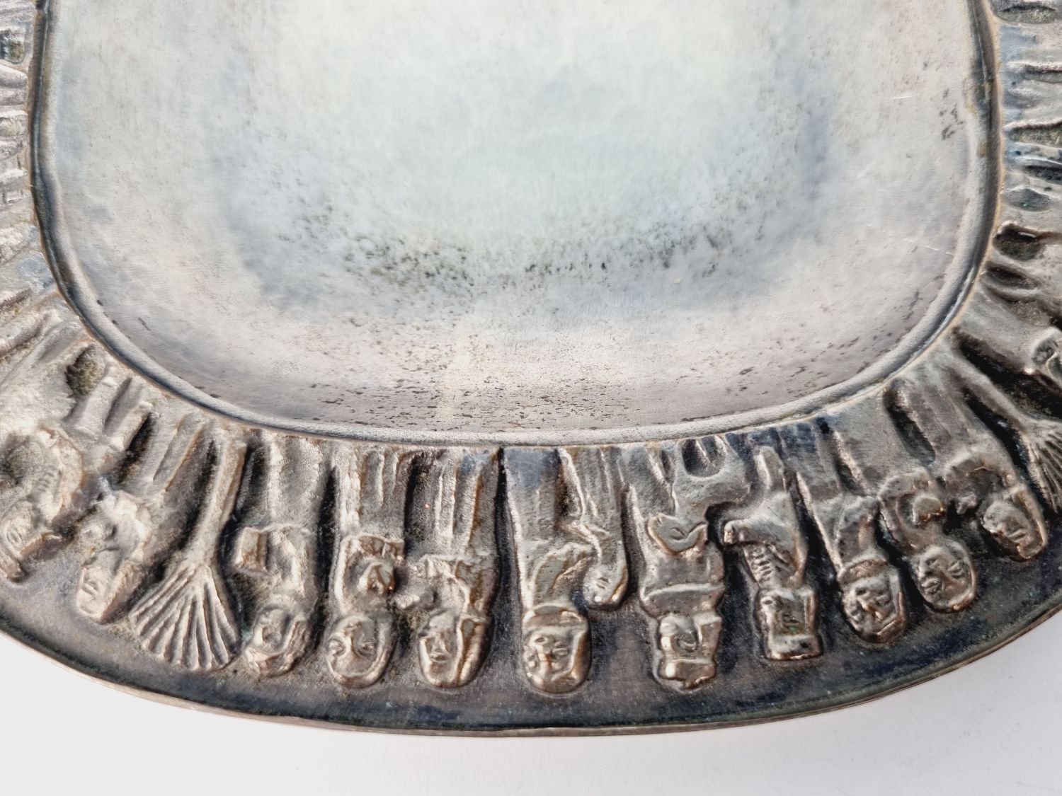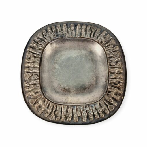 Tevan Margit iparművész alkotása az 1930-as évekből. Gazdagon domborított figurális dísztál, ezüstözött fémből készült. Jelzett, korának megfelelő állapotban van.Méretei15x15x1 cm