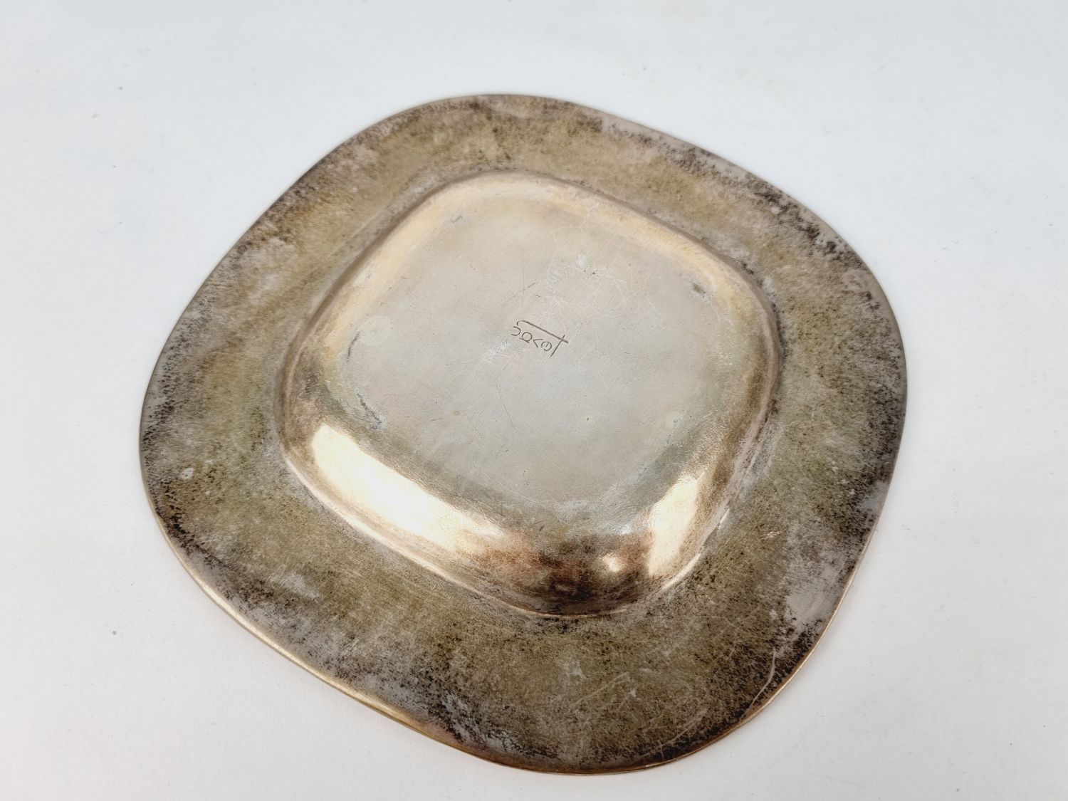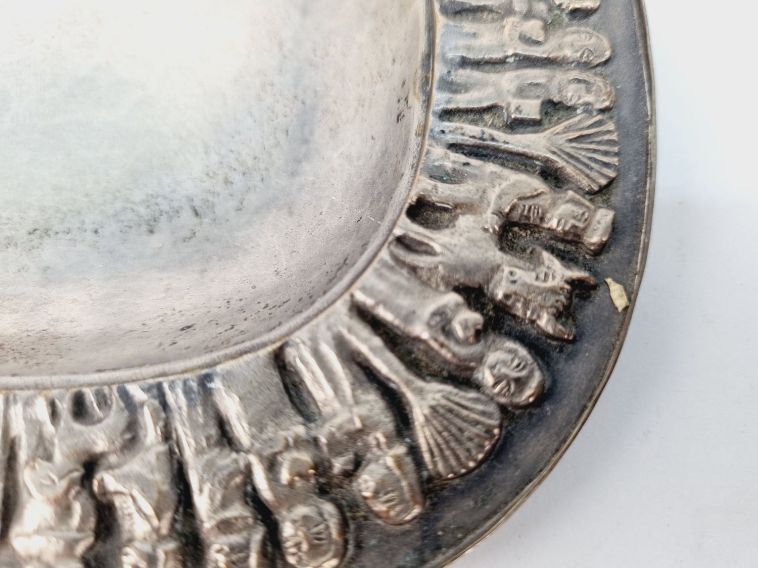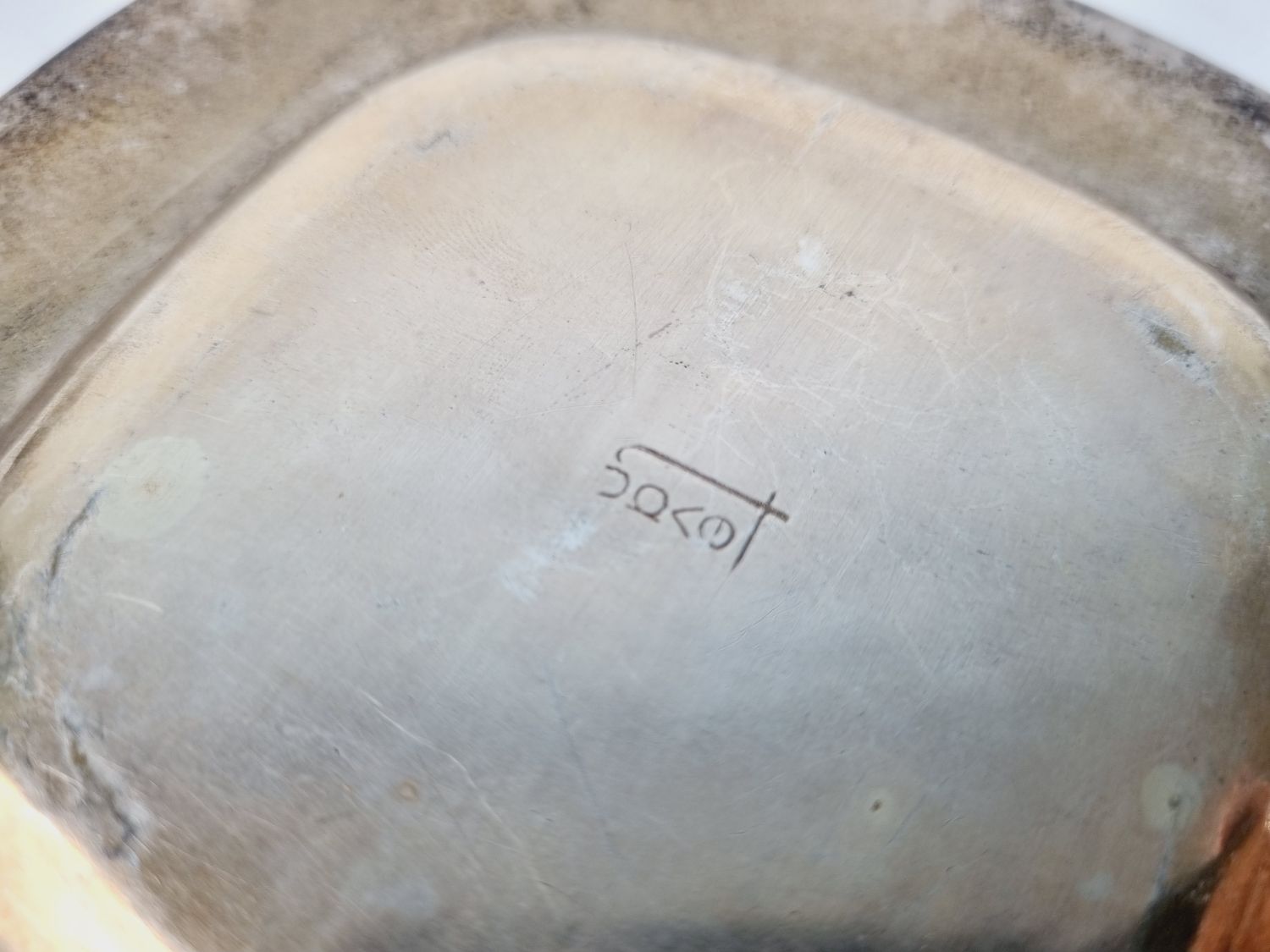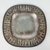 Tevan Margit iparművész alkotása az 1930-as évekből. Gazdagon domborított figurális dísztál, ezüstözött fémből készült. Jelzett, korának megfelelő állapotban van.Méretei15x15x1 cm