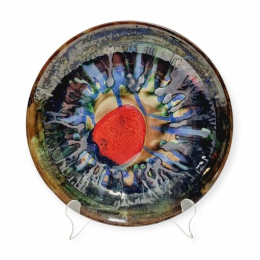 Nagyméretű Városlődi kerámia dísztál az 1970-es évekből. Élénkszínű csurgatott mázas, dekoratív lakberendezési kiegészítő. Azonos színű textiliákkal izgalmas látványt nyúthat az enteriőrben. Méretei: 35 x 35 x 6 cm.