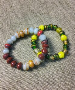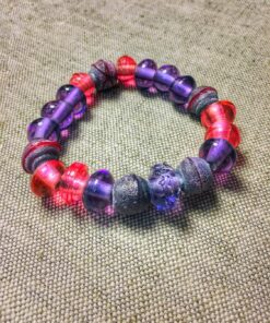 Modern design ékszer karkötő, elasztikus szíjra fűzött piros és borostyán színű üveg gyöngyökkel, Vaszil Gabriella üvegművésztől.