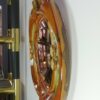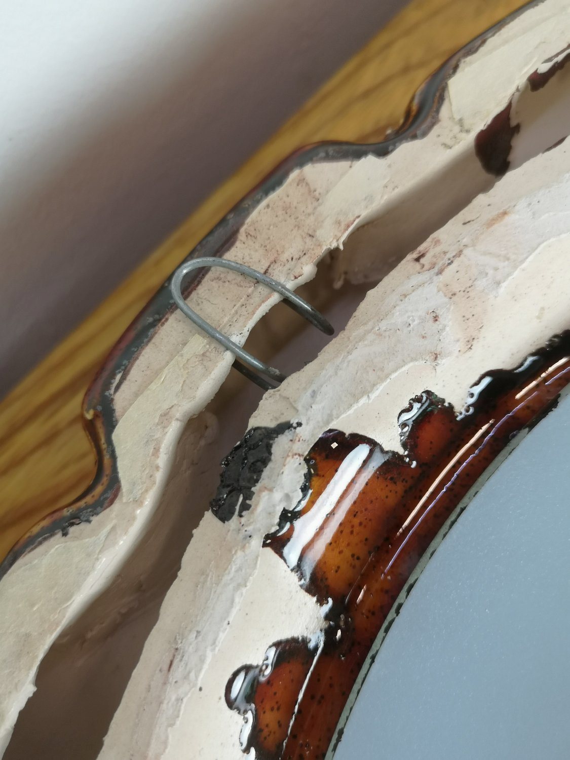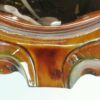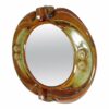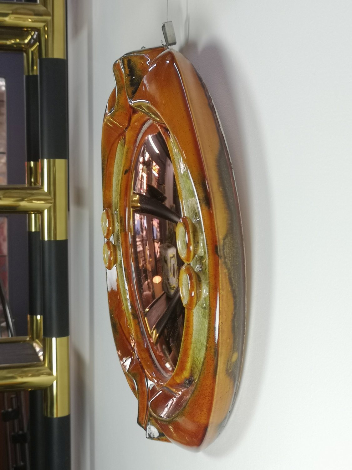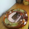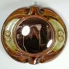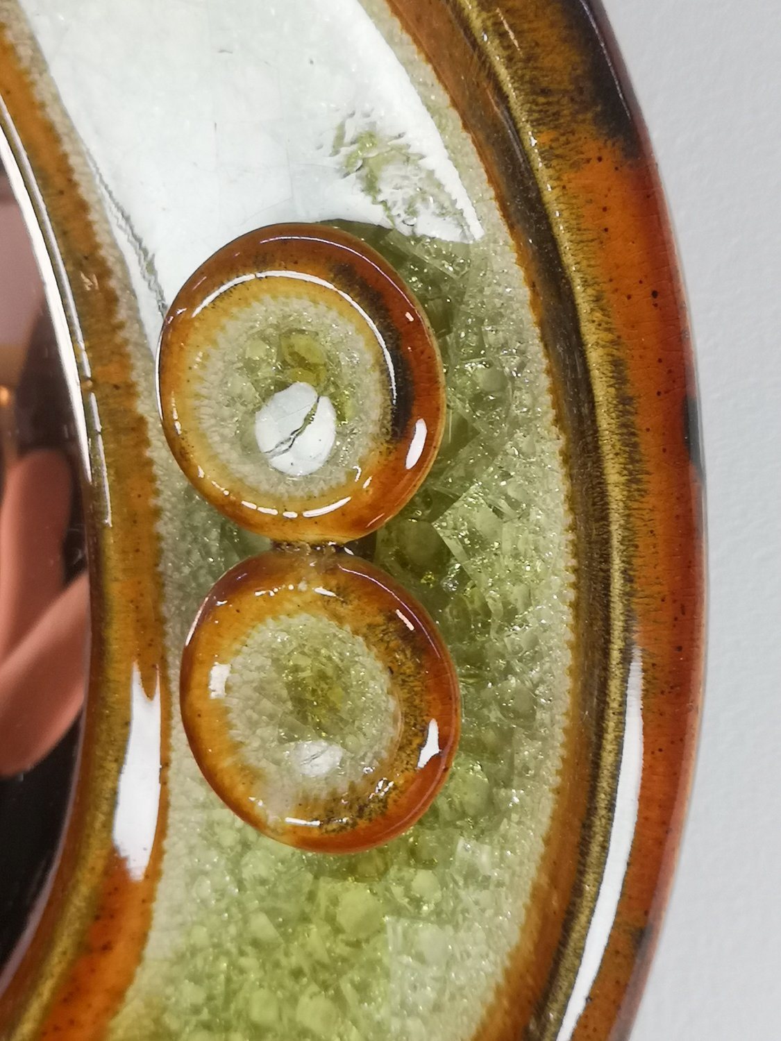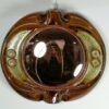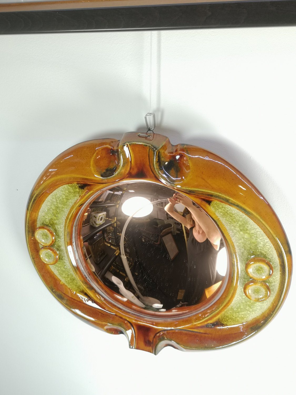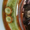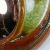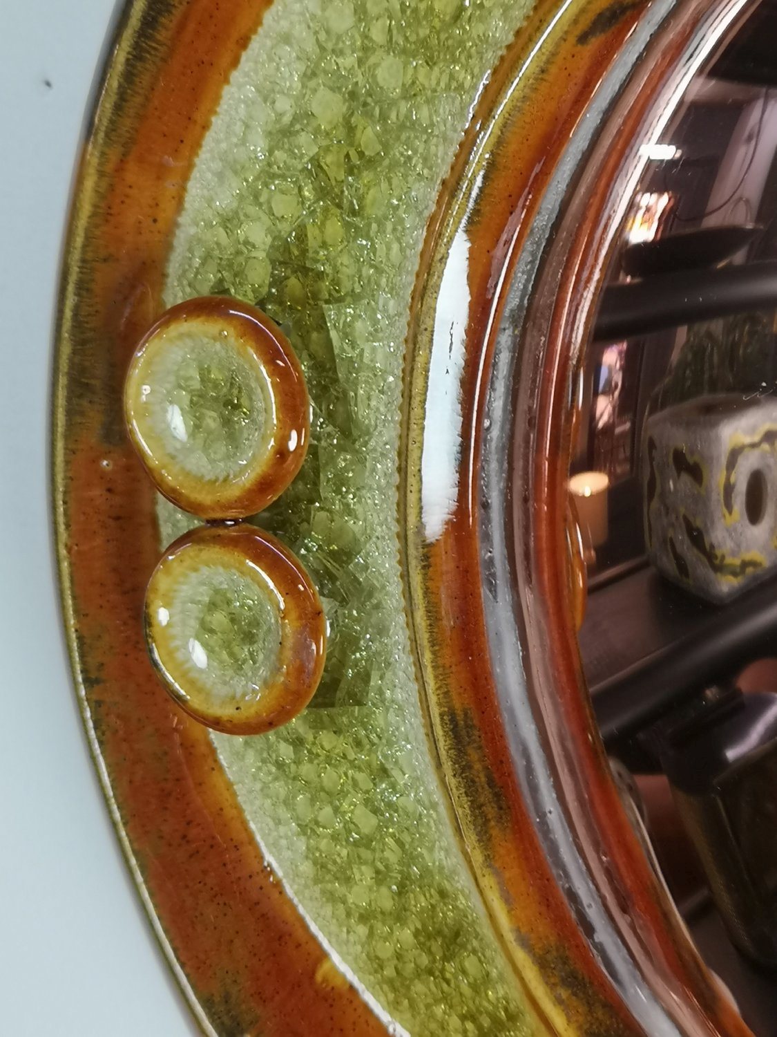 Különleges Végvári Gyula egyedi almát formáló színezett tükörbetétes kerámia falidekoráció. Végvári Gyula 1958–1967 között a hódmezővásárhelyi Majolikagyár tervezője volt. 1961-ben a Magyar Kerámikusok Társasága és a Művészeti Alap, majd a Magyar Alkotóművészek Országos Egyesületének tagja volt. Végvári Gyula egyedi technikájú kísérleti mázairól volt ismert, üvegbetéttel és oxidos égetésnek eredménye ez az élénk zöld színű üveghatású máz. Ez az ritka kerámia falidekoráció alma formájával és élénk színeivel egy igazán dekoratív darab.
