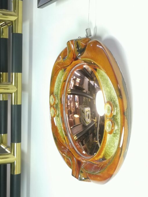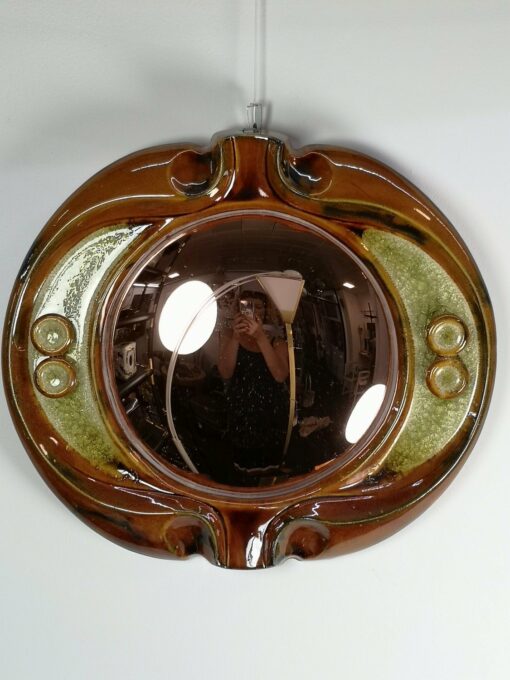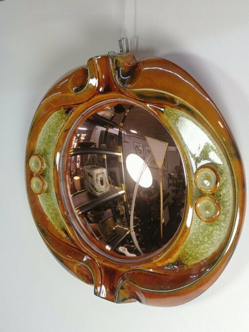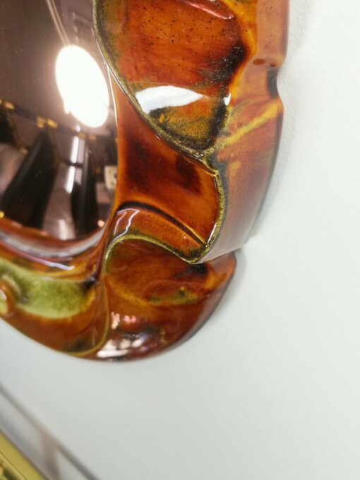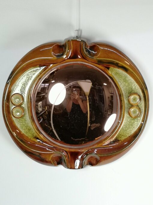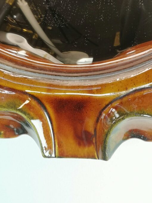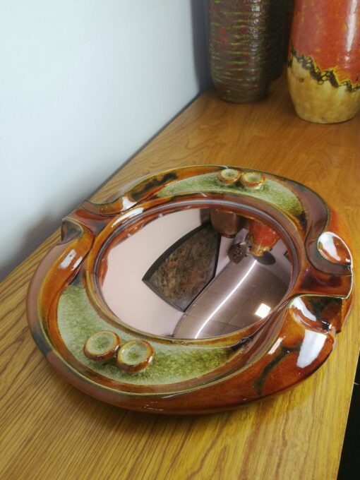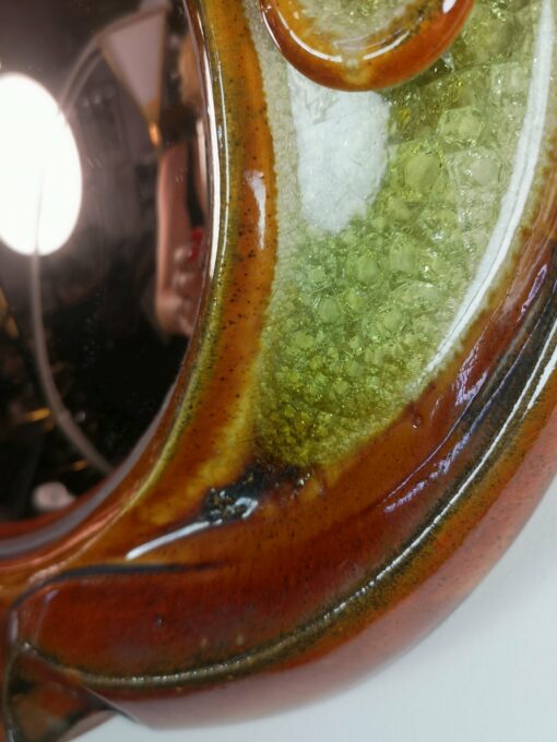 Különleges Végvári Gyula egyedi almát formáló színezett tükörbetétes kerámia falidekoráció. Végvári Gyula 1958–1967 között a hódmezővásárhelyi Majolikagyár tervezője volt. 1961-ben a Magyar Kerámikusok Társasága és a Művészeti Alap, majd a Magyar Alkotóművészek Országos Egyesületének tagja volt. Végvári Gyula egyedi technikájú kísérleti mázairól volt ismert, üvegbetéttel és oxidos égetésnek eredménye ez az élénk zöld színű üveghatású máz. Ez az ritka kerámia falidekoráció alma formájával és élénk színeivel egy igazán dekoratív darab.