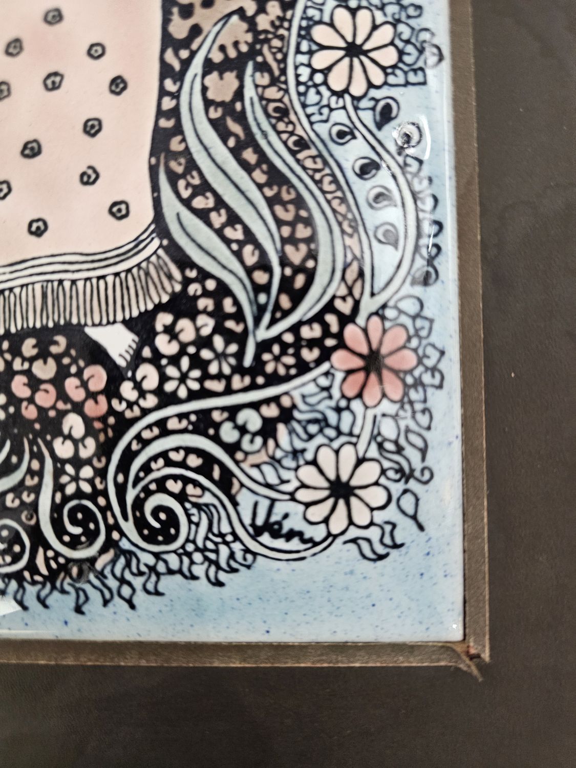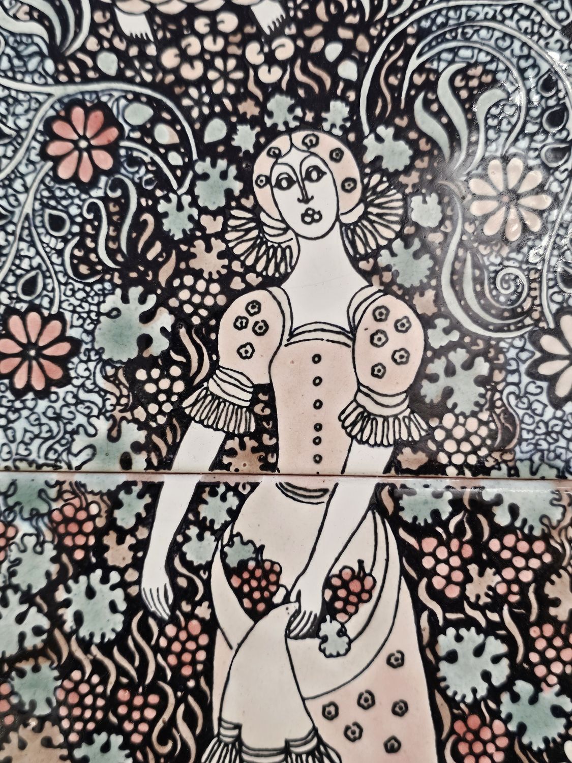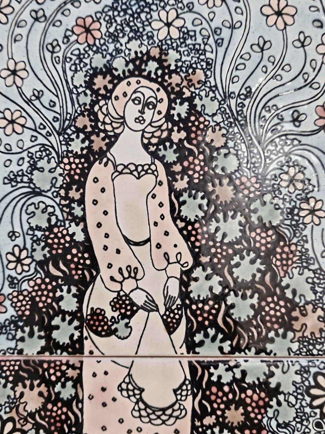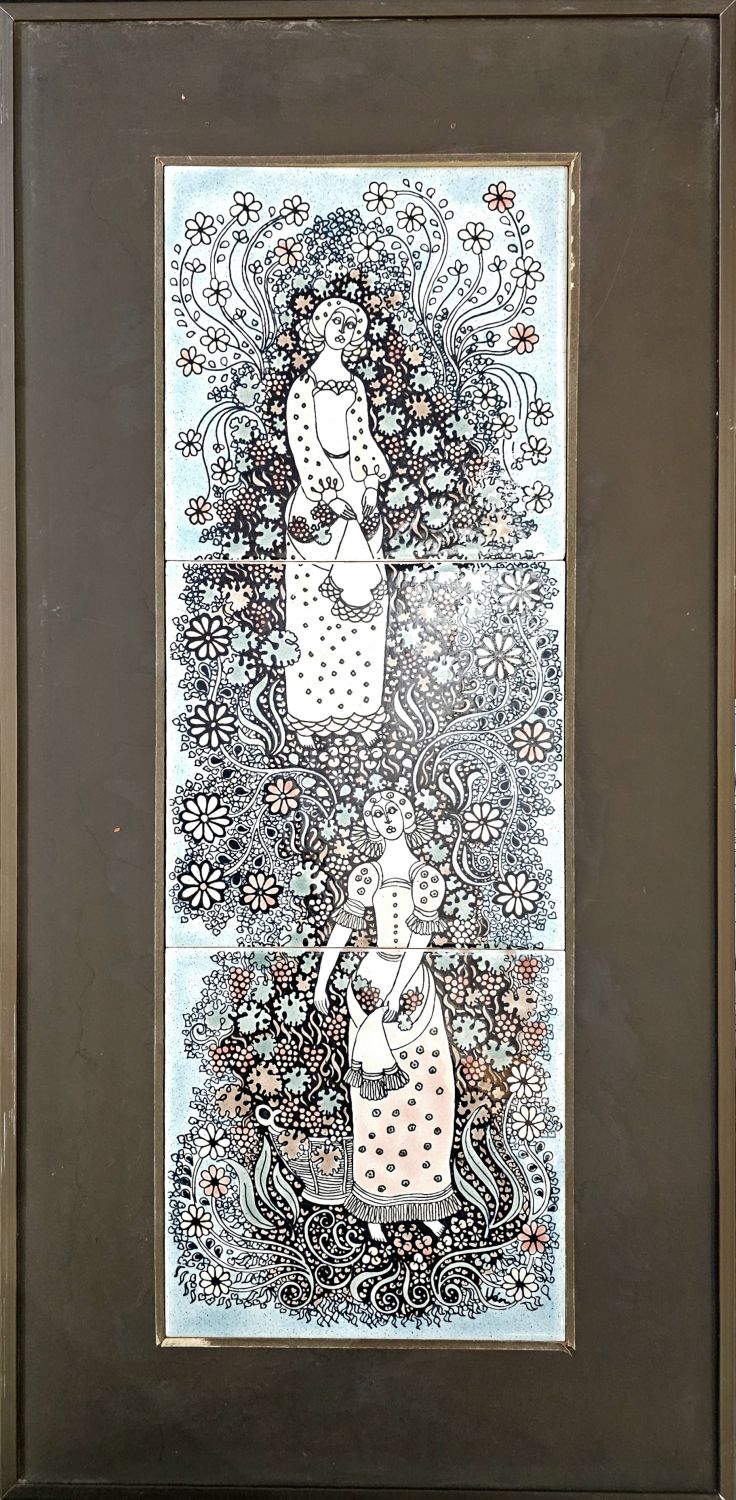 Vén Edit : Háromcsempés fali relief az 1970-es évekből. Dekoratív növényi ornamentika keretezi a művet, fazekas mázzal szinezve. Szecesszióból merített lírai hangulatot áraszt. Hibátlan. mérete: 58x27cm kerettel