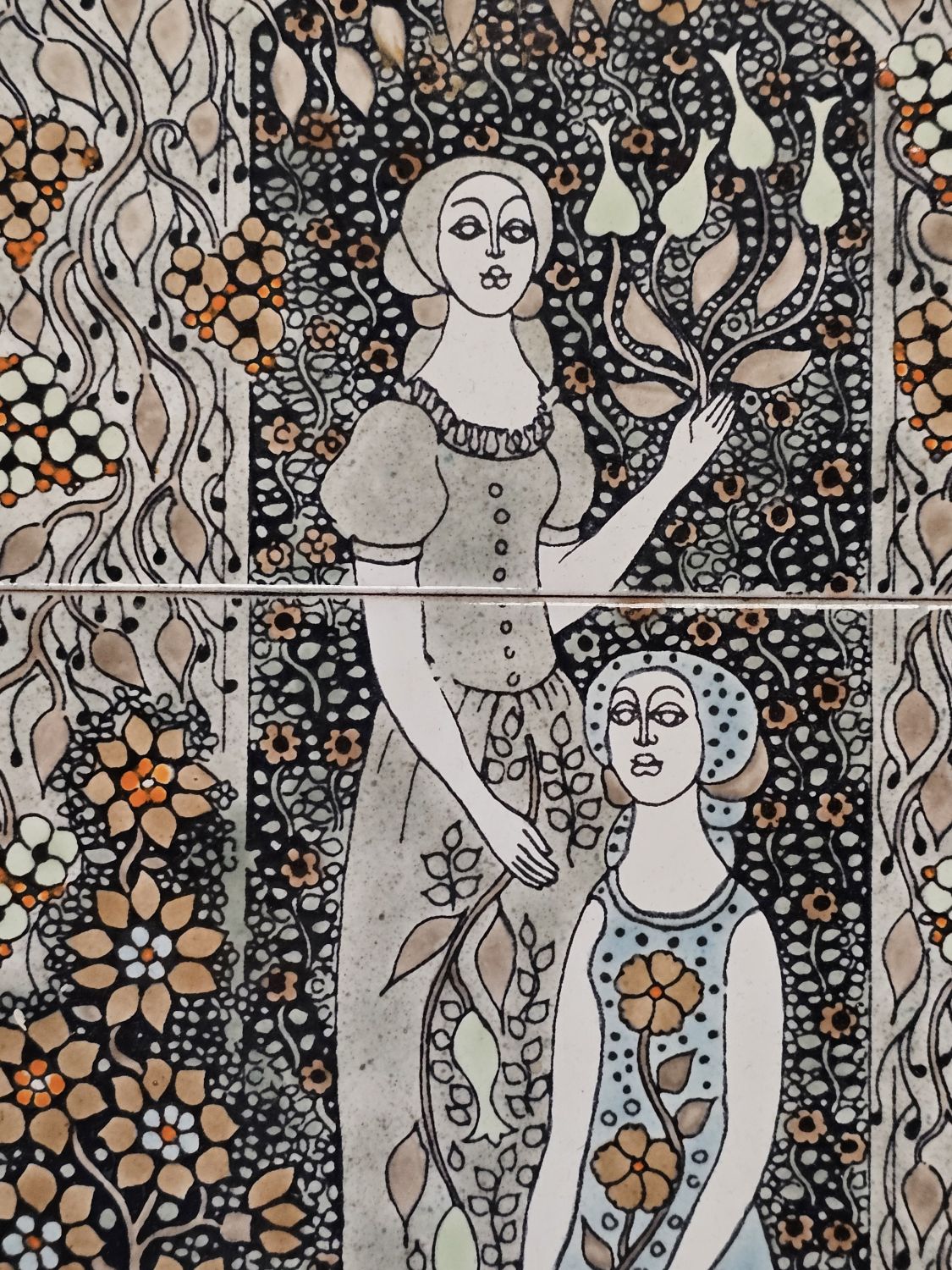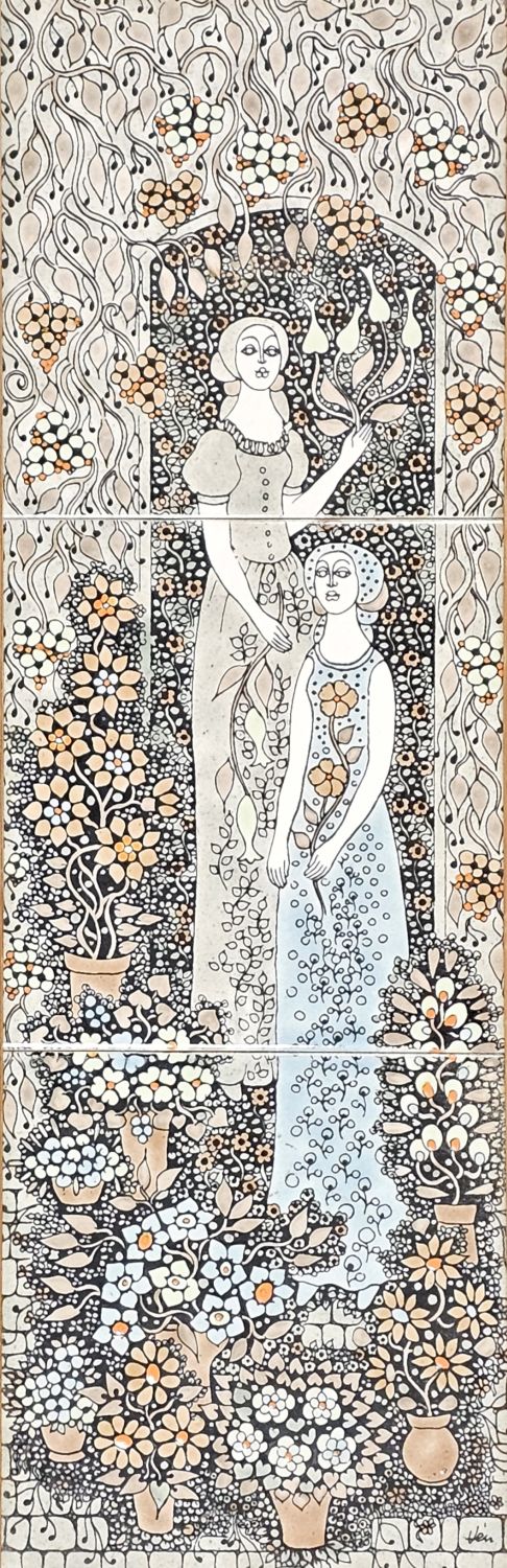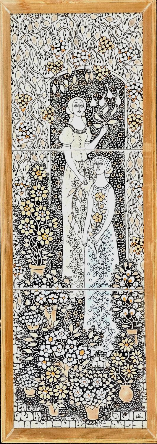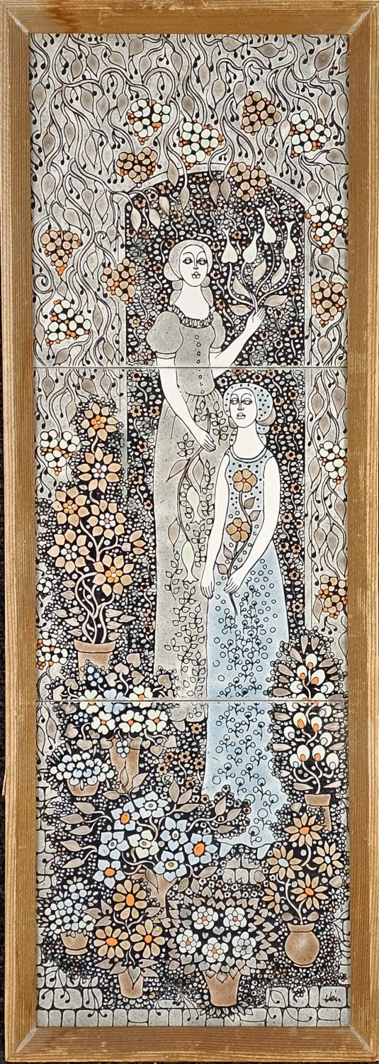 Vén Edit zománcfestett, hármas osztatú csempeképe az 1970-es évekből. Finom pasztell színek, kicsit fémes csillogó hatás.