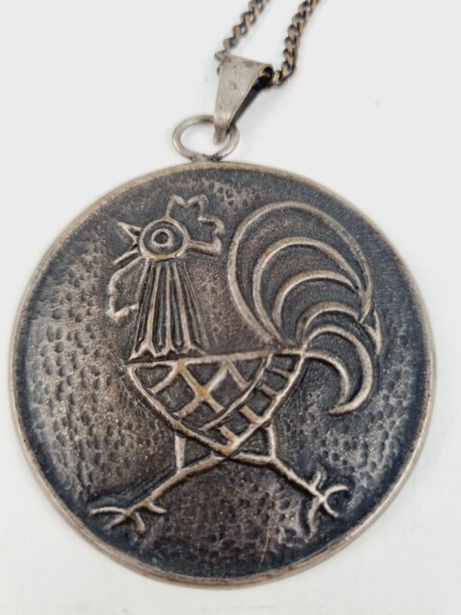 1960-as évekbeli iparművészeti alkotás,un.kakasos nyaklánc. A népi hagyományok szerint a kakas a bátorság, a védelem és a gazdagság szimbóluma. Korának megfelelő állapotú. Méretei 6x6x1 cm, a lánc hossza 40 cm.