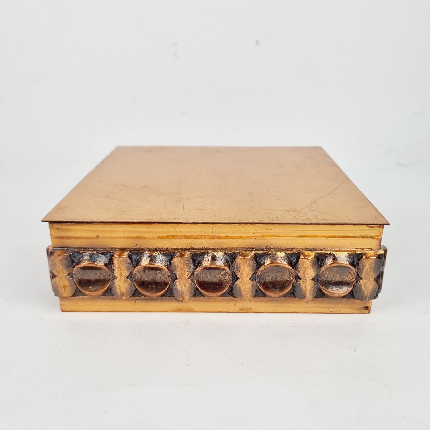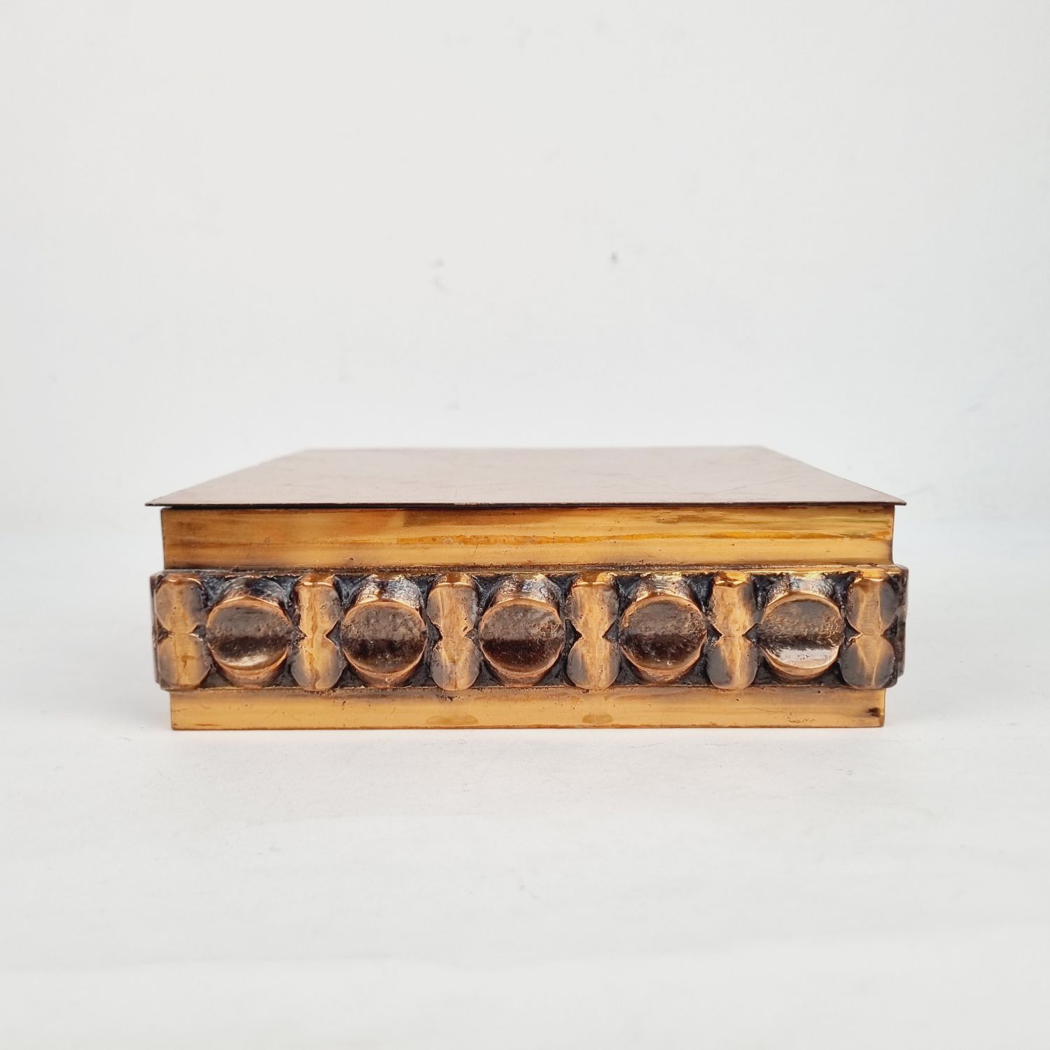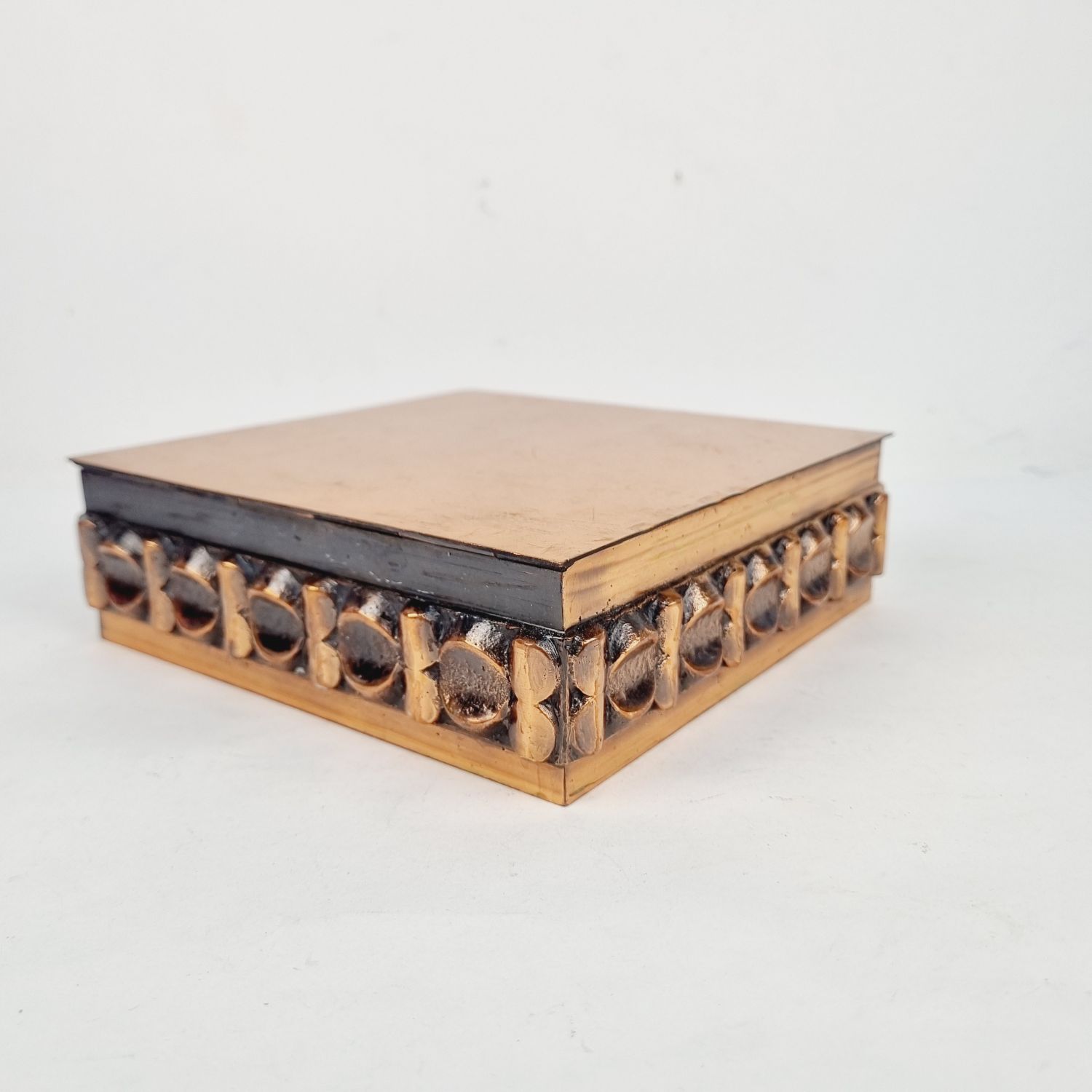 Iparművészeti díszdoboz az 1960-as évekből. Ötvös fémmunka vörösrézből. Brutalista stílusú, rusztikus enteriőrben izgalmas lakberendezési kiegészítő. Méretei: 6 x 16 x 16 cm.