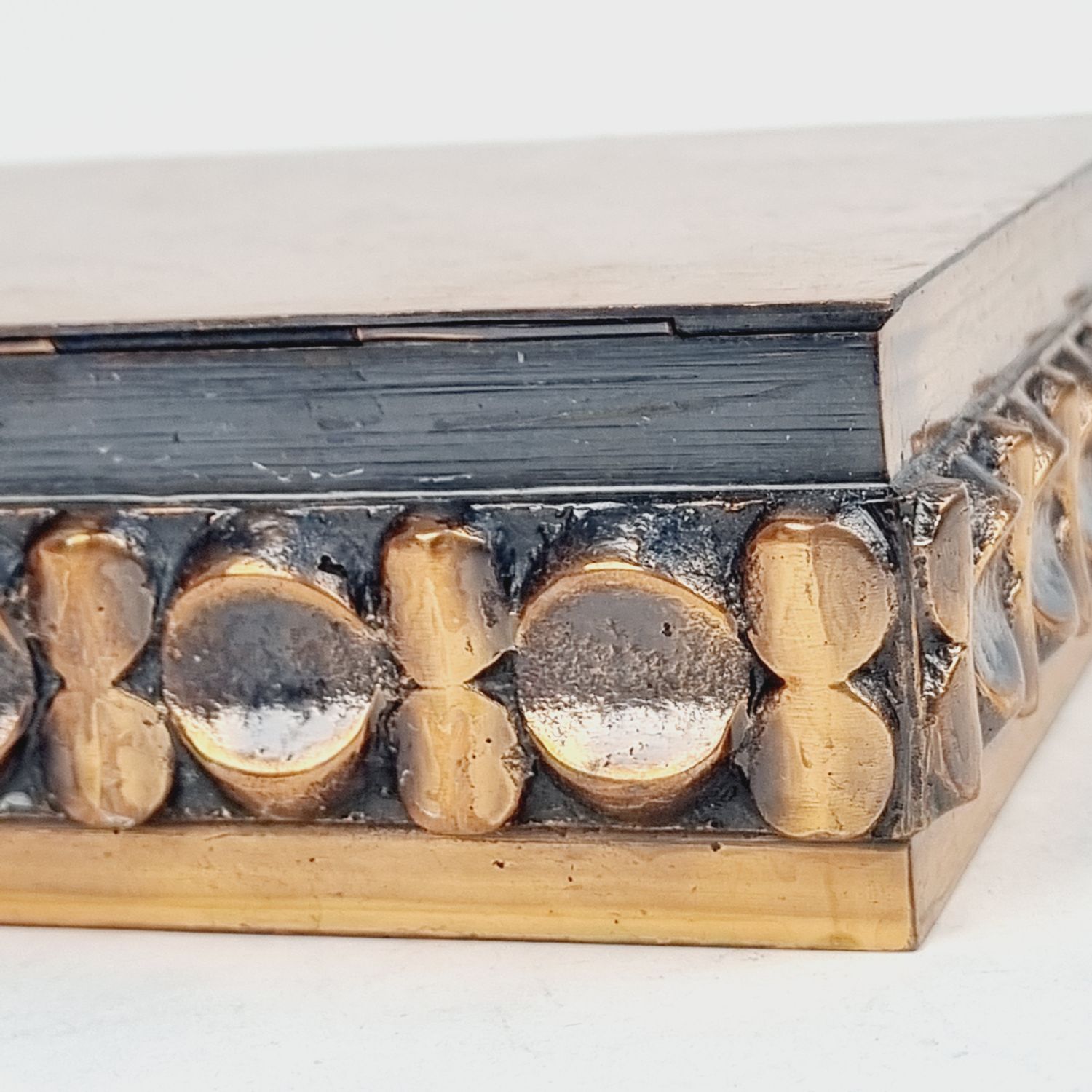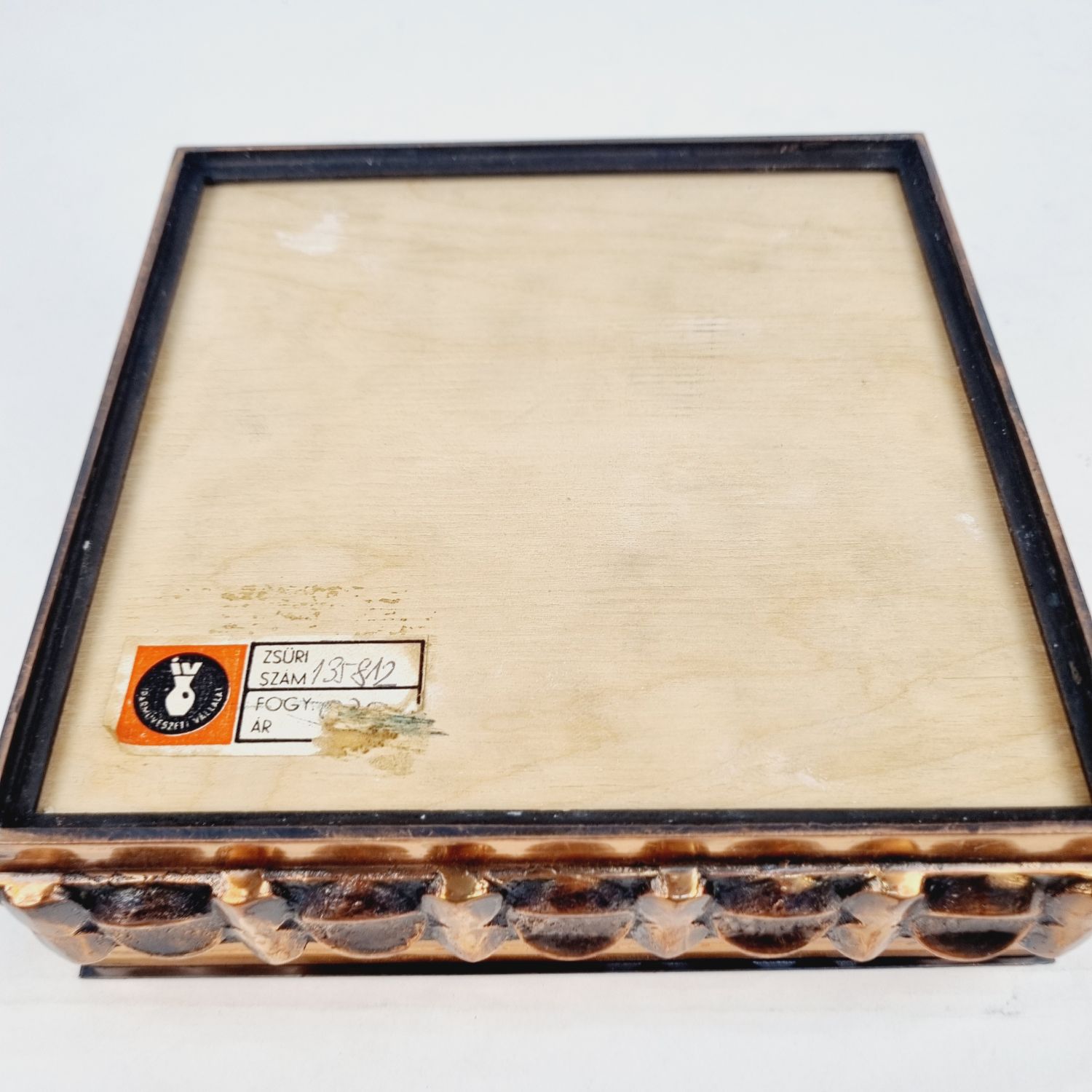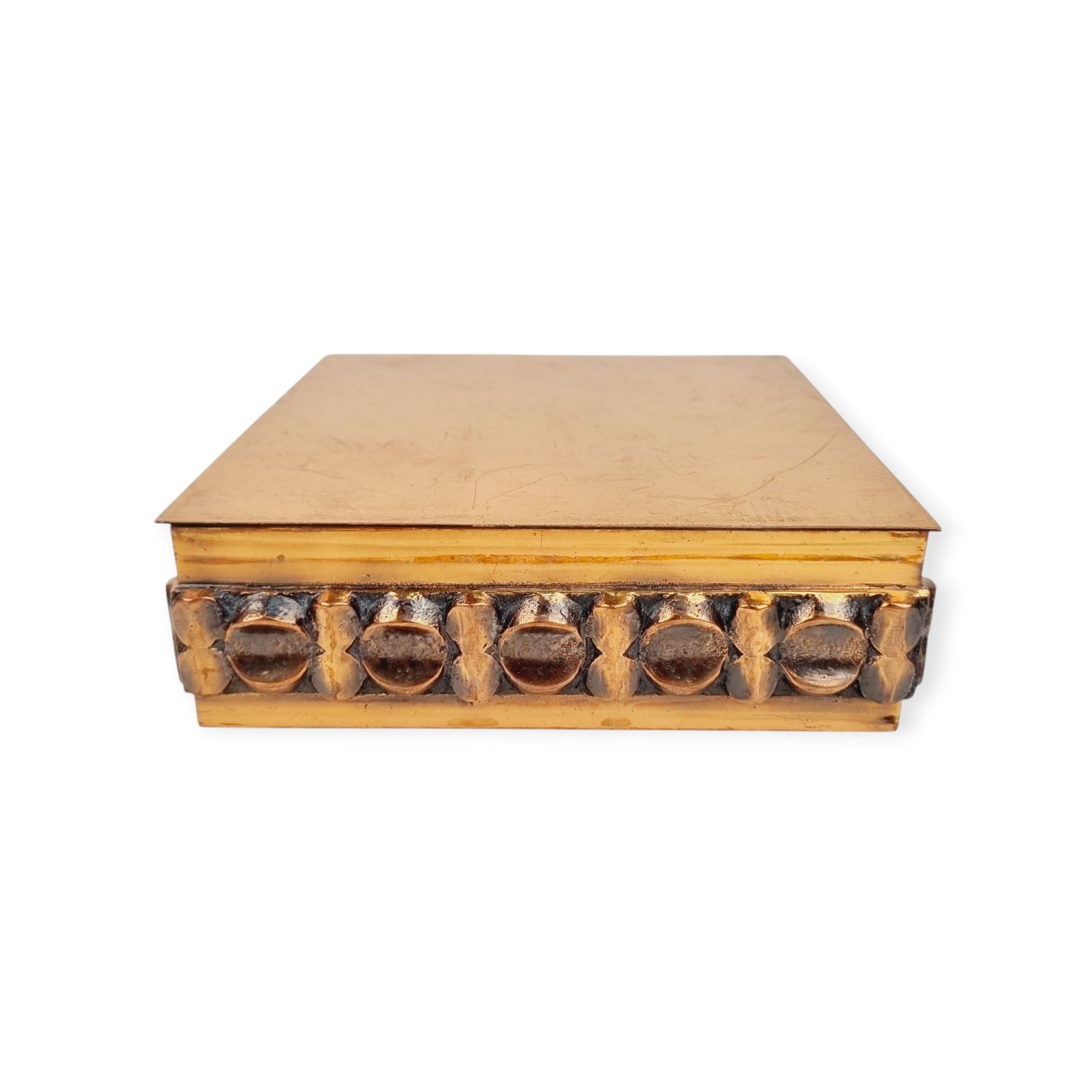 Iparművészeti díszdoboz az 1960-as évekből. Ötvös fémmunka vörösrézből. Brutalista stílusú, rusztikus enteriőrben izgalmas lakberendezési kiegészítő. Méretei: 6 x 16 x 16 cm.