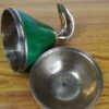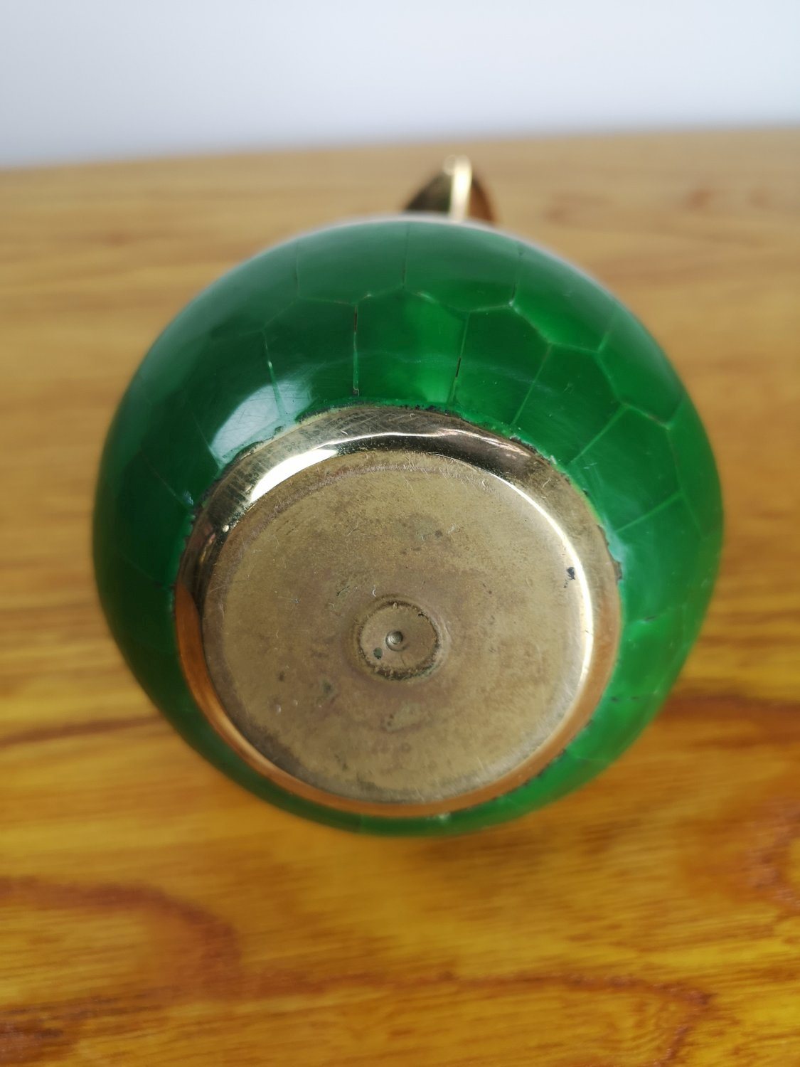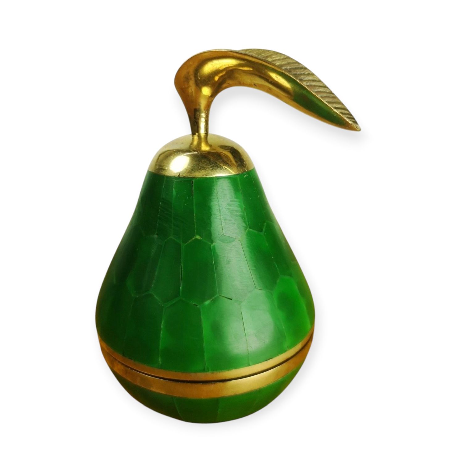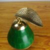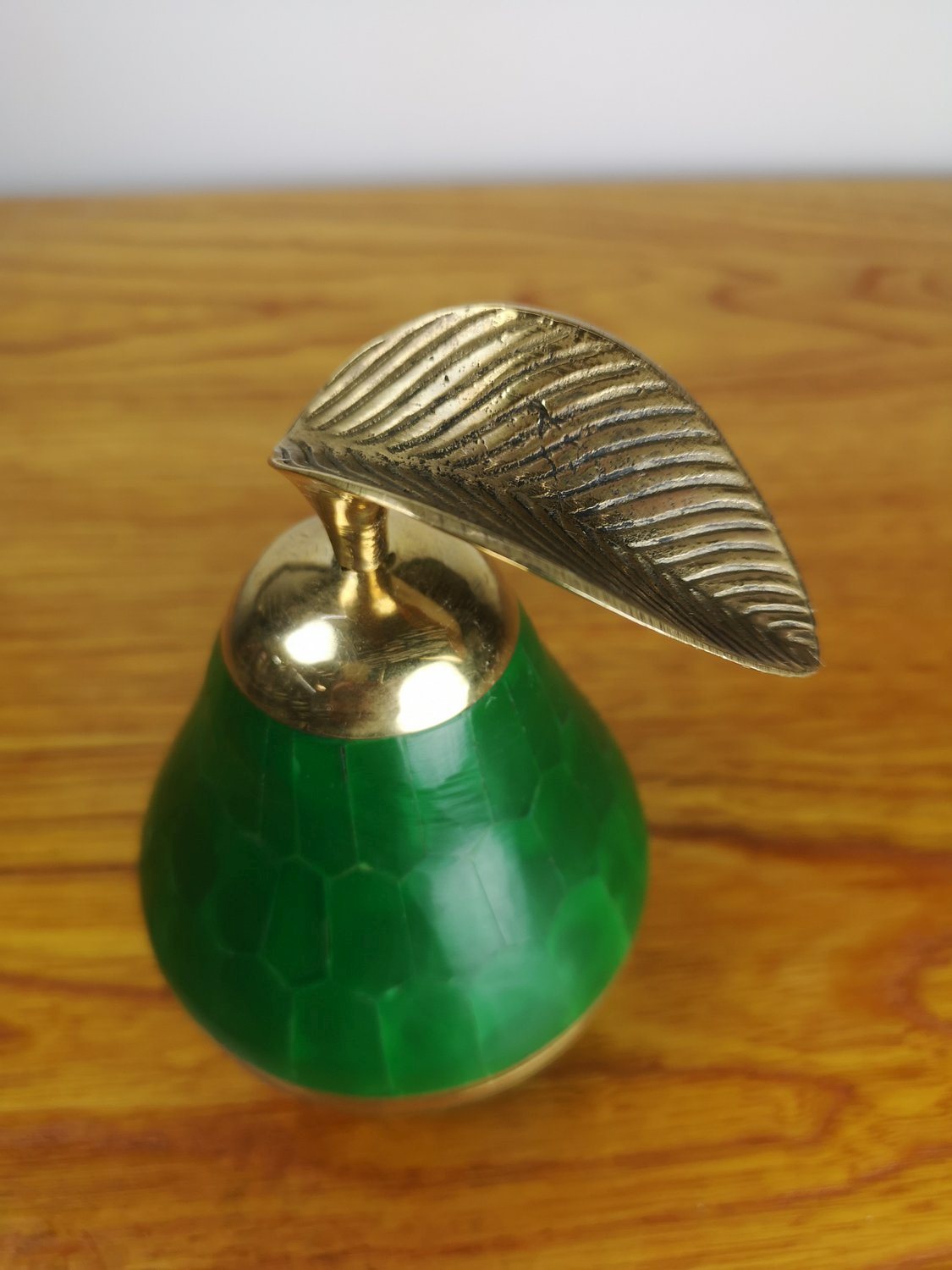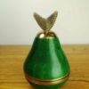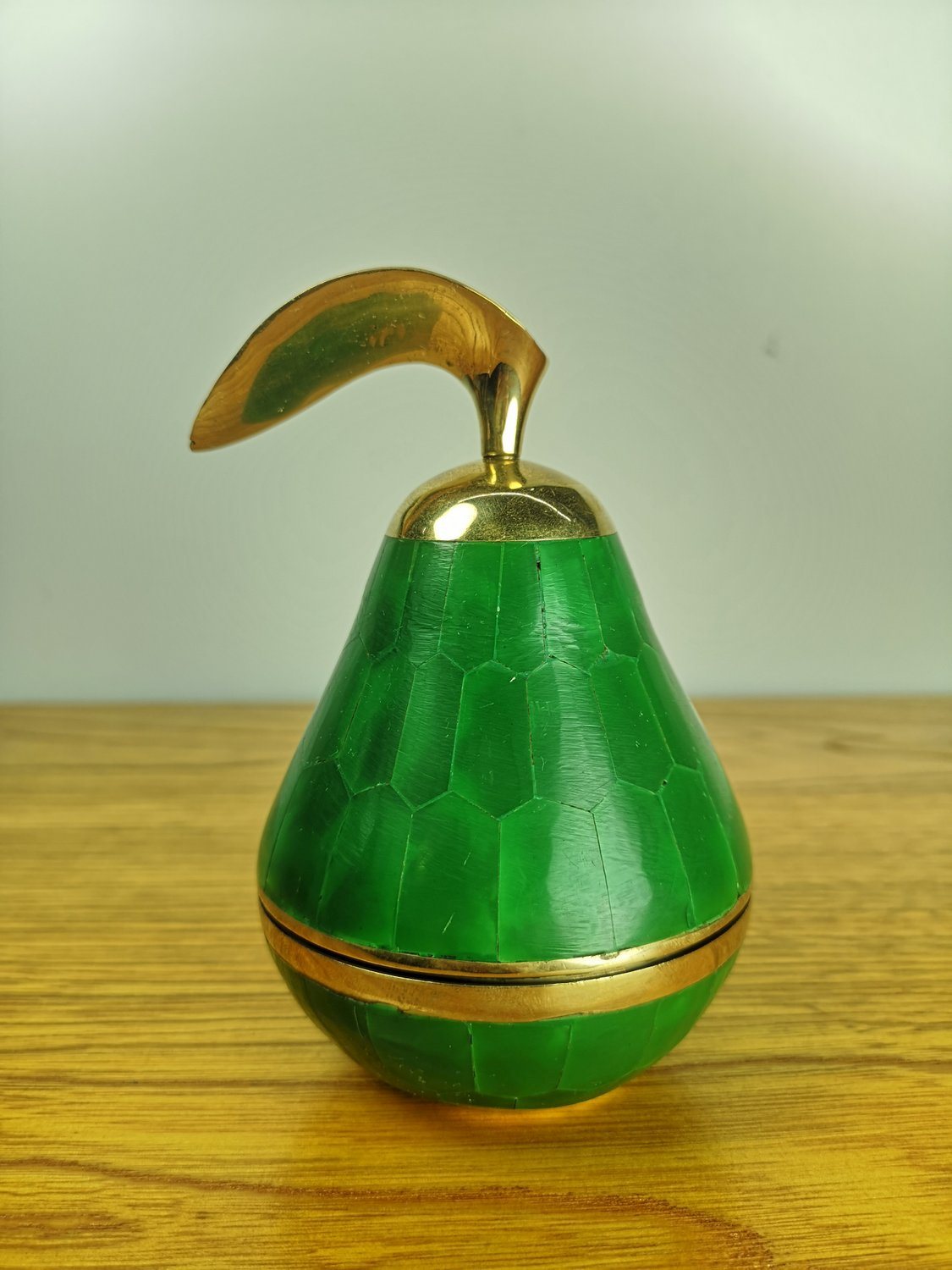 Gyümölcs formájú ékszertartó, az 1980-as évekből, oldalán élénk zöld műgyanta berakással. Arany színű levéllel és peremmel, szép állapotban elérhető. mérete: 15x10x10cm