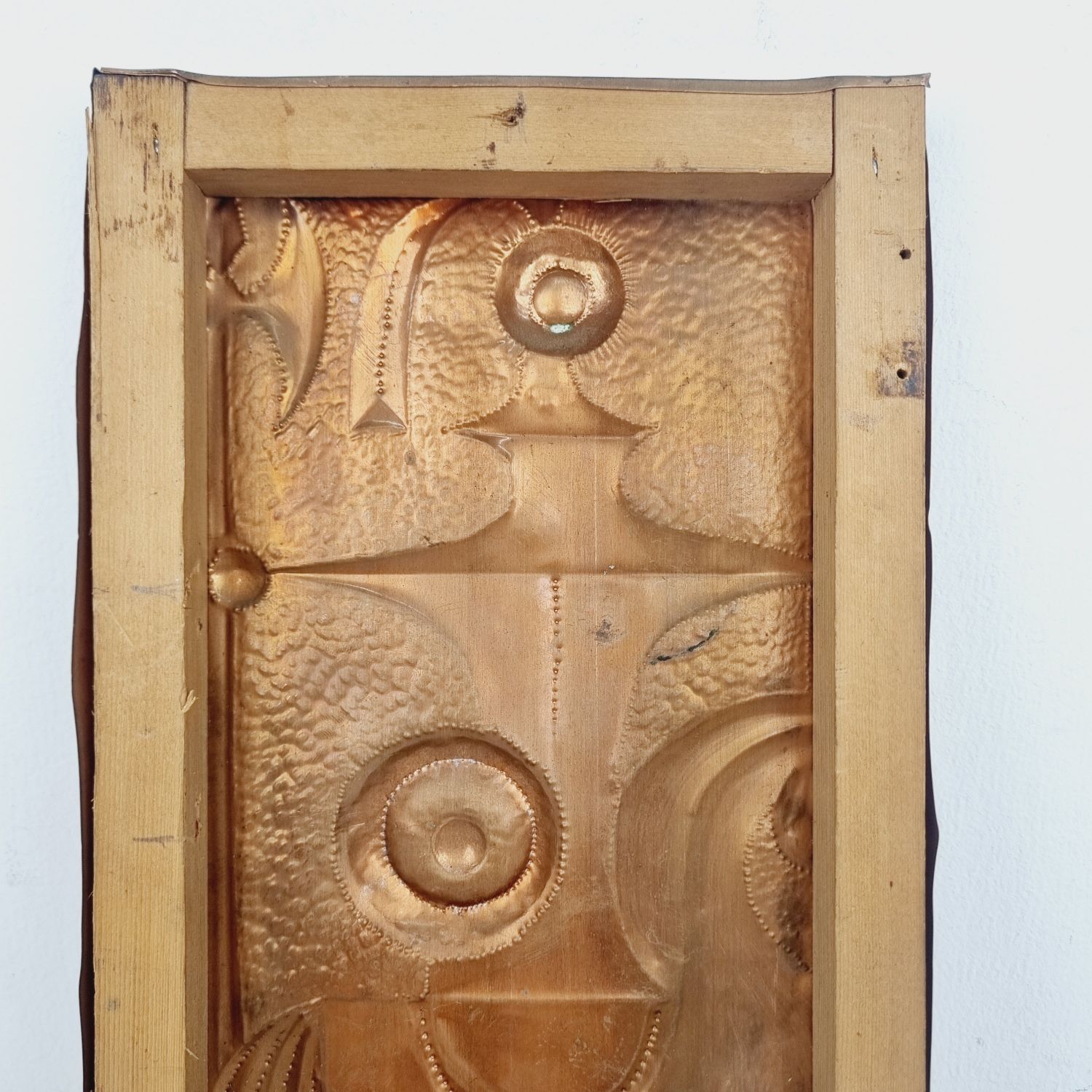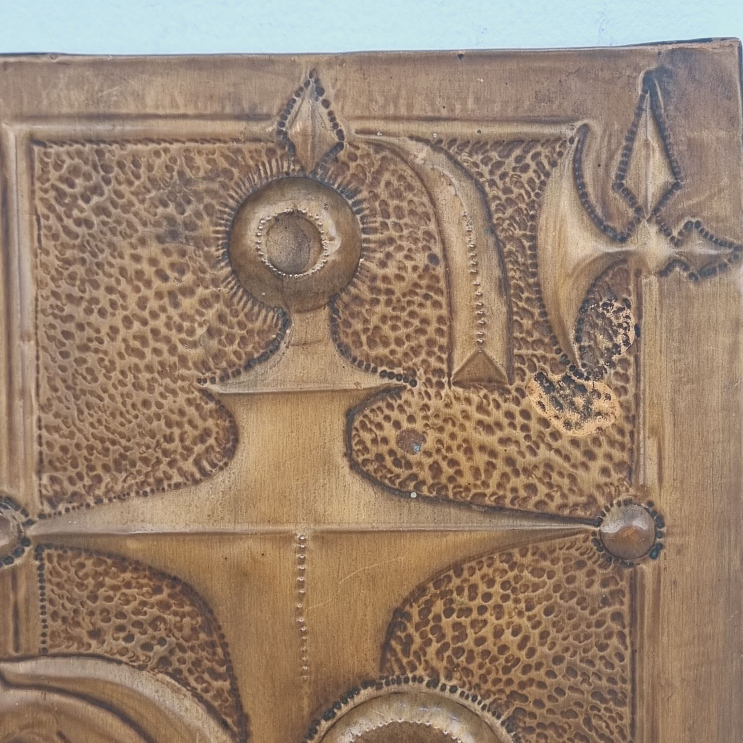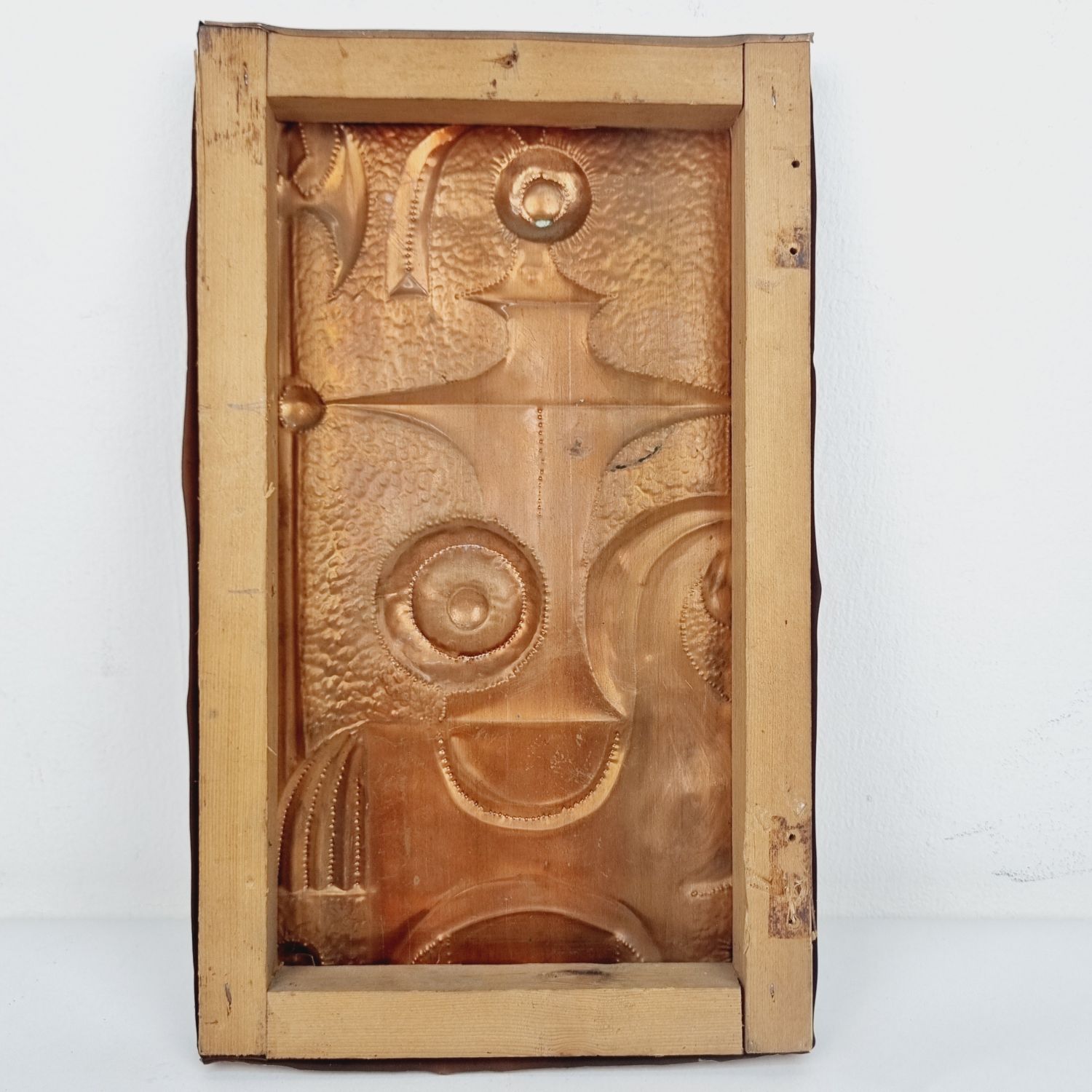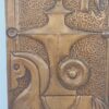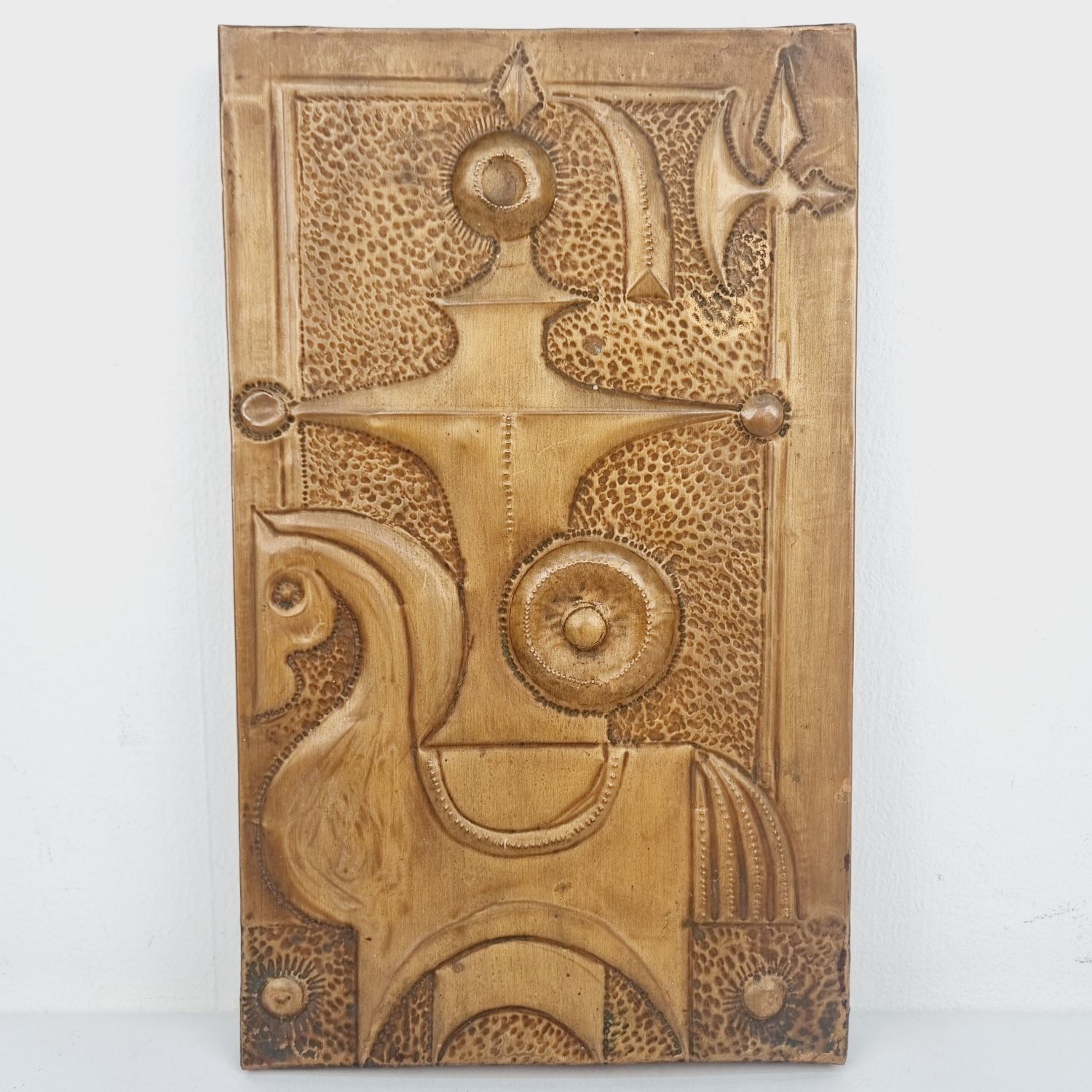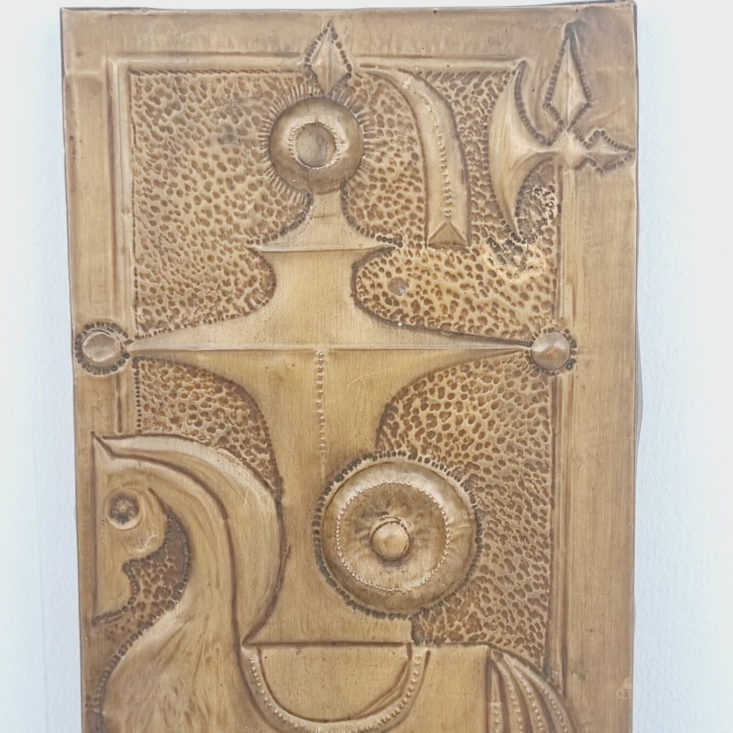Iparművész által tervezett fém dombormű,amely egy lovat és egy mitológiai lényt ábrázol stilizált formában. Az 1970s években készült, állapota korának megfelelő. Méretei: 25×15 x 1 cm