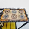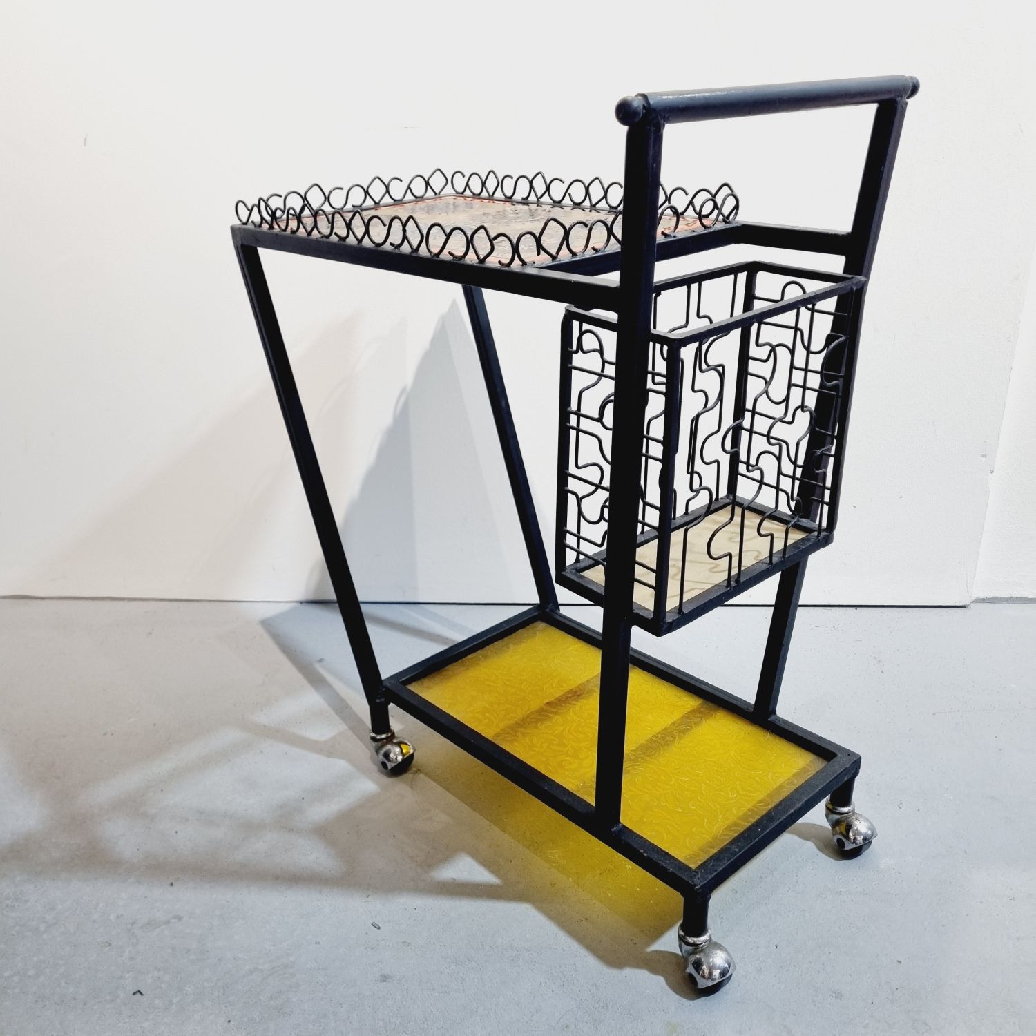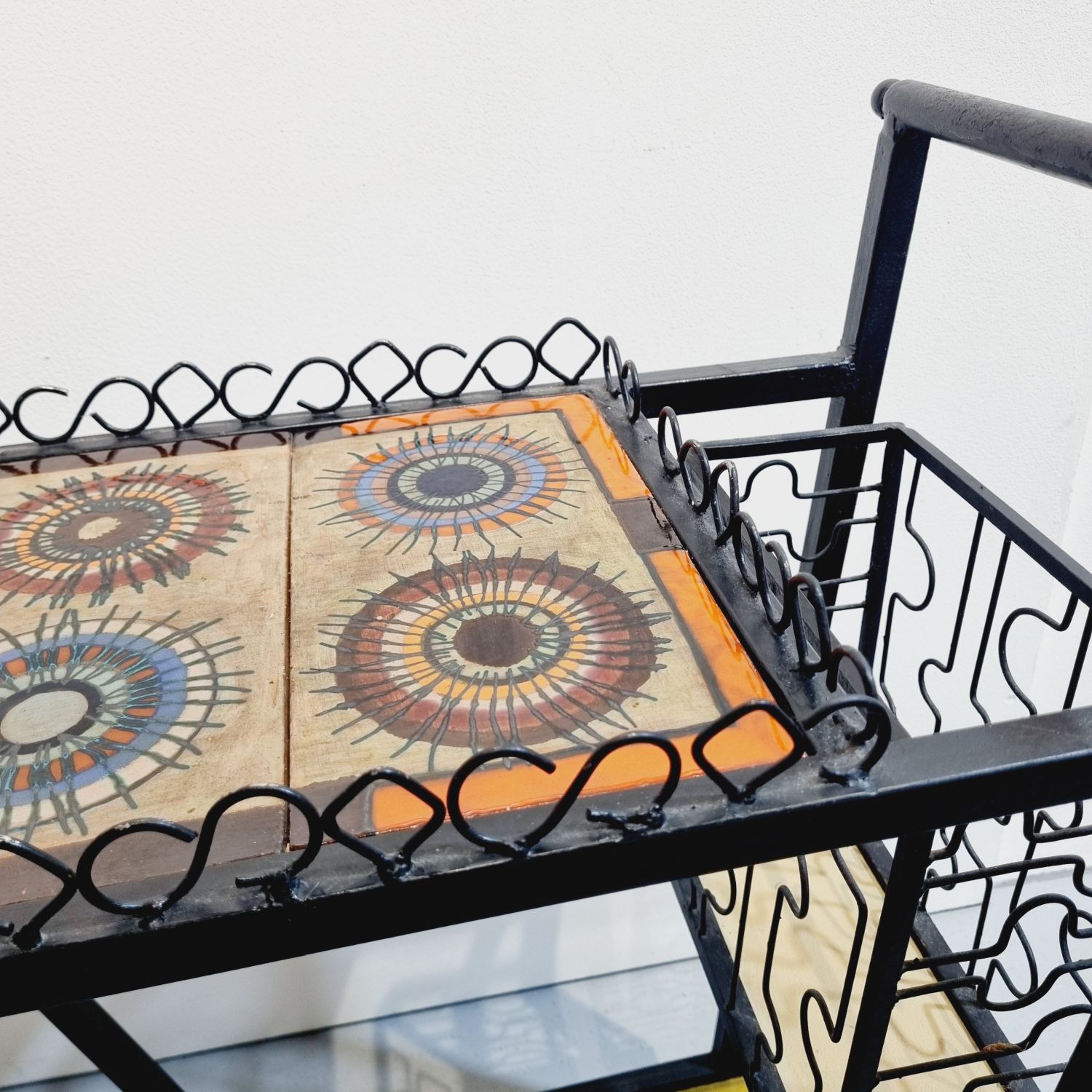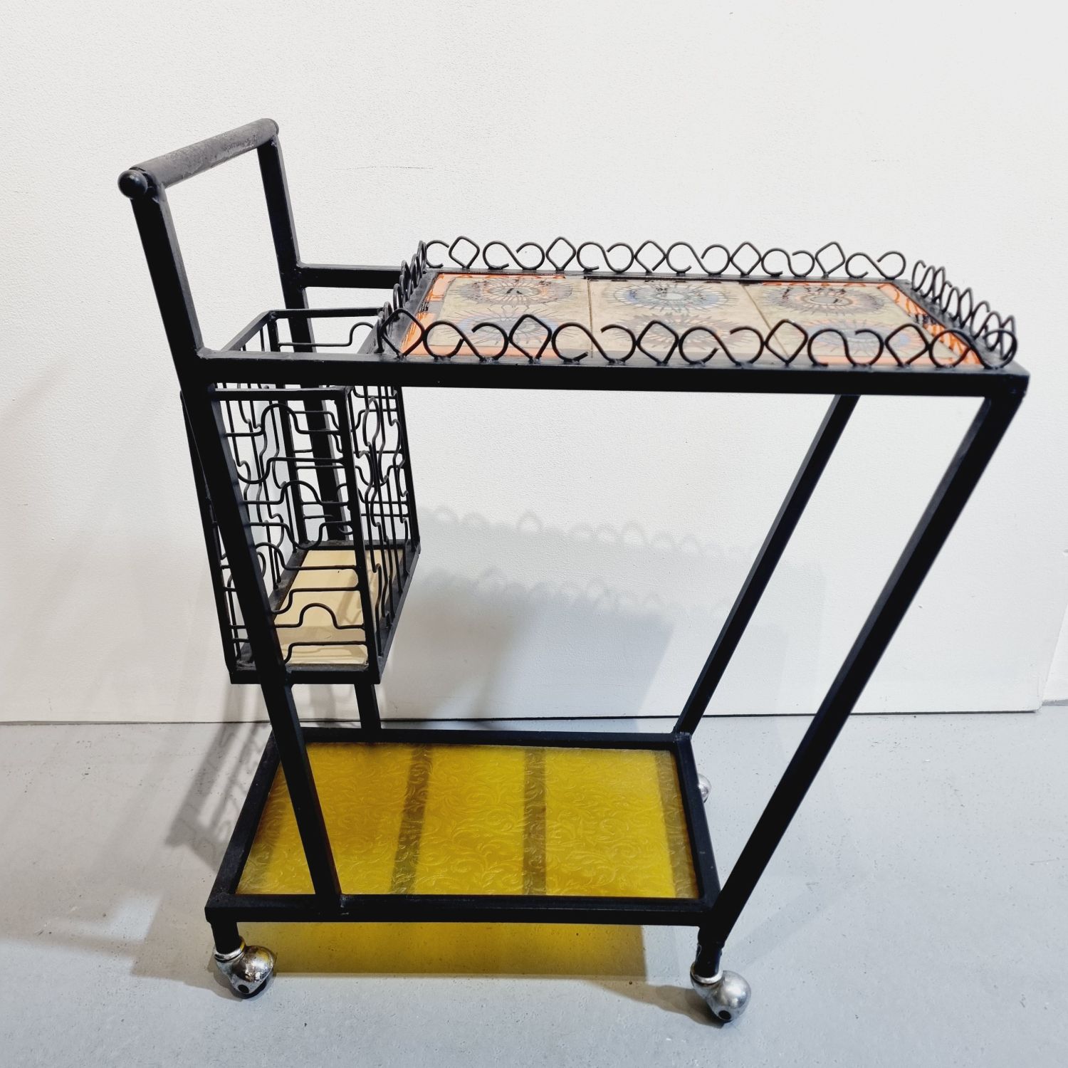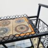 Vintage, mid century kovácsoltvas zsúrkocsi kerámia lappal