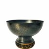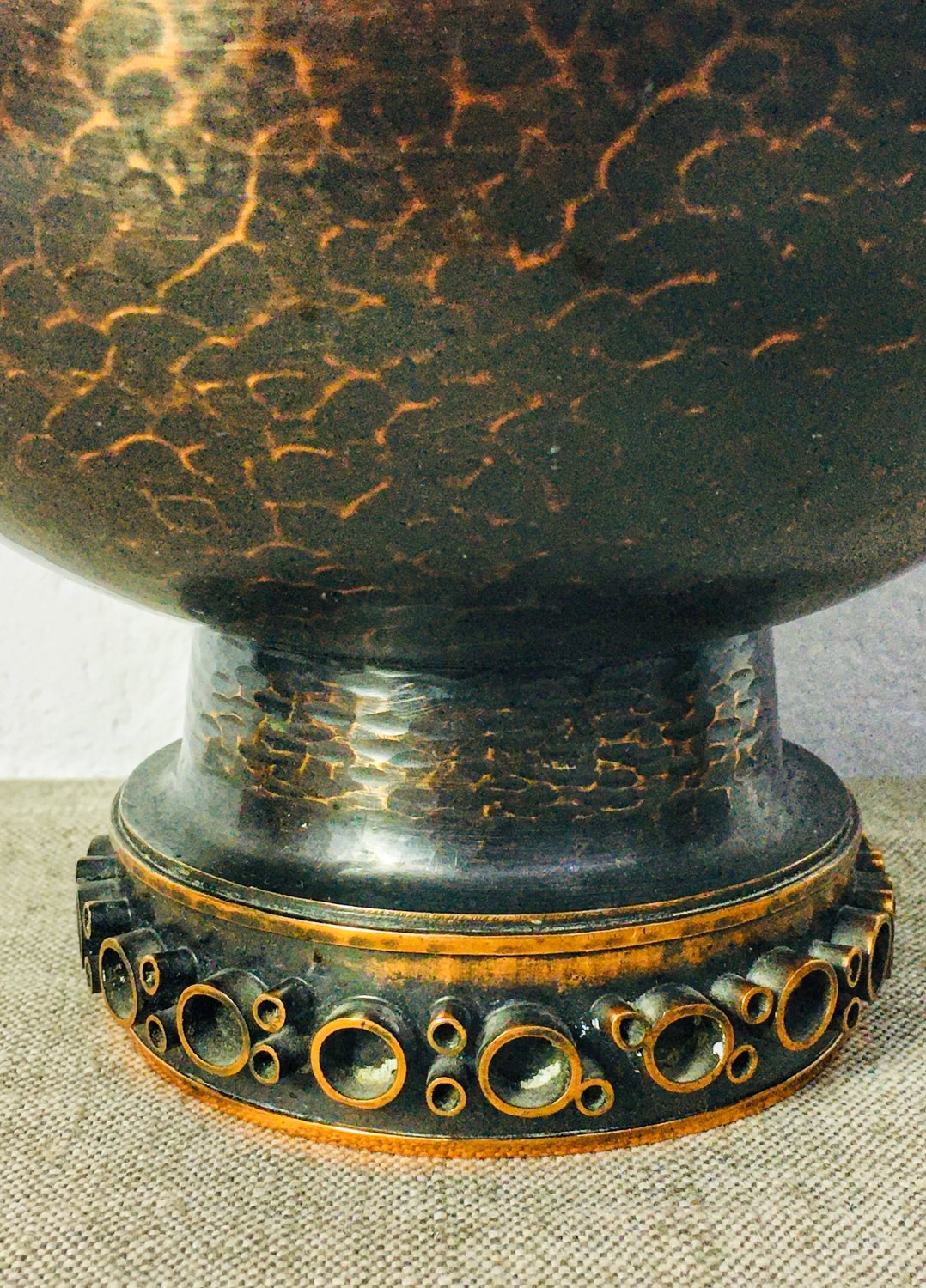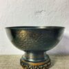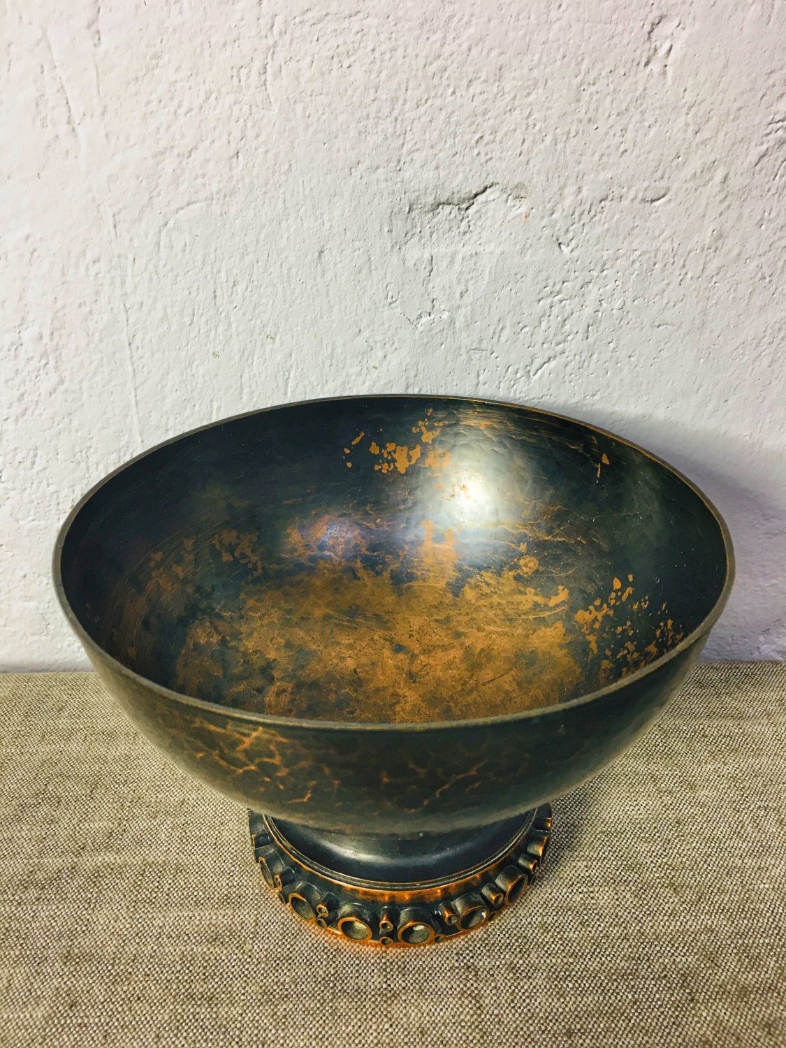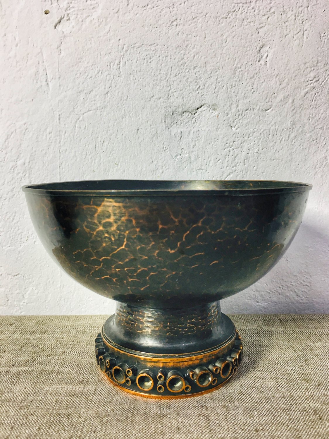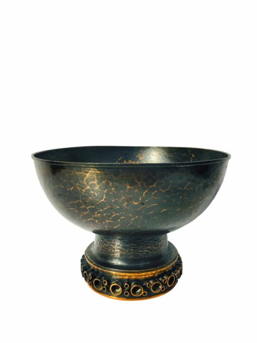 Vintage antik hatású patinázott vörösréz kínáló tál, talpán domború dízítéssel, amely stílusjegyei alapján az 1970-es években készült, Szilágyi Ildikó munkája. Korának megfelelő, jó állapotban.