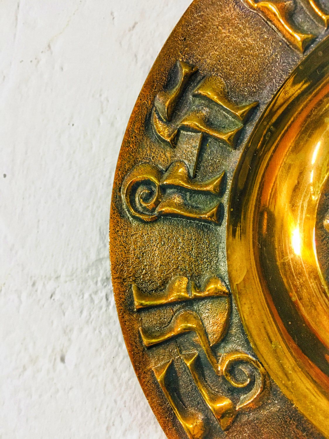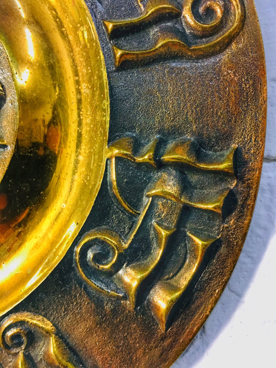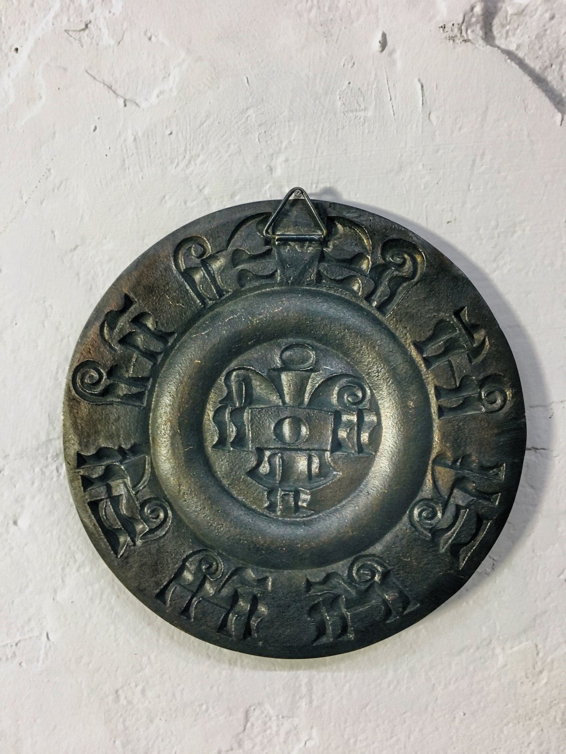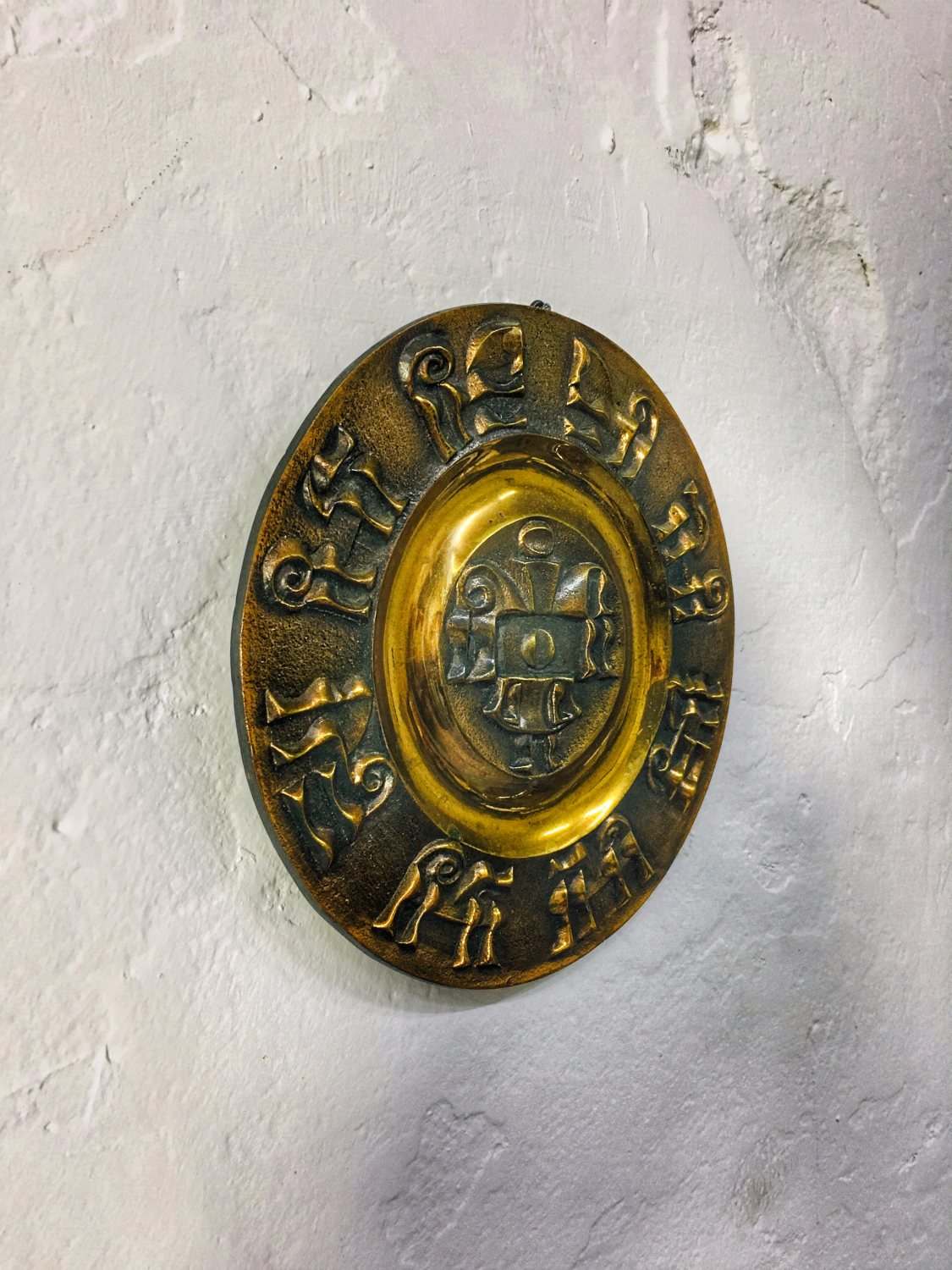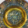 Iparművészeti réz falidísz / fali tál, felületén domború díszítéssel, ismeretlen művész mukája, stílusjegyei alapján 1960-as, 1970-es években készült.