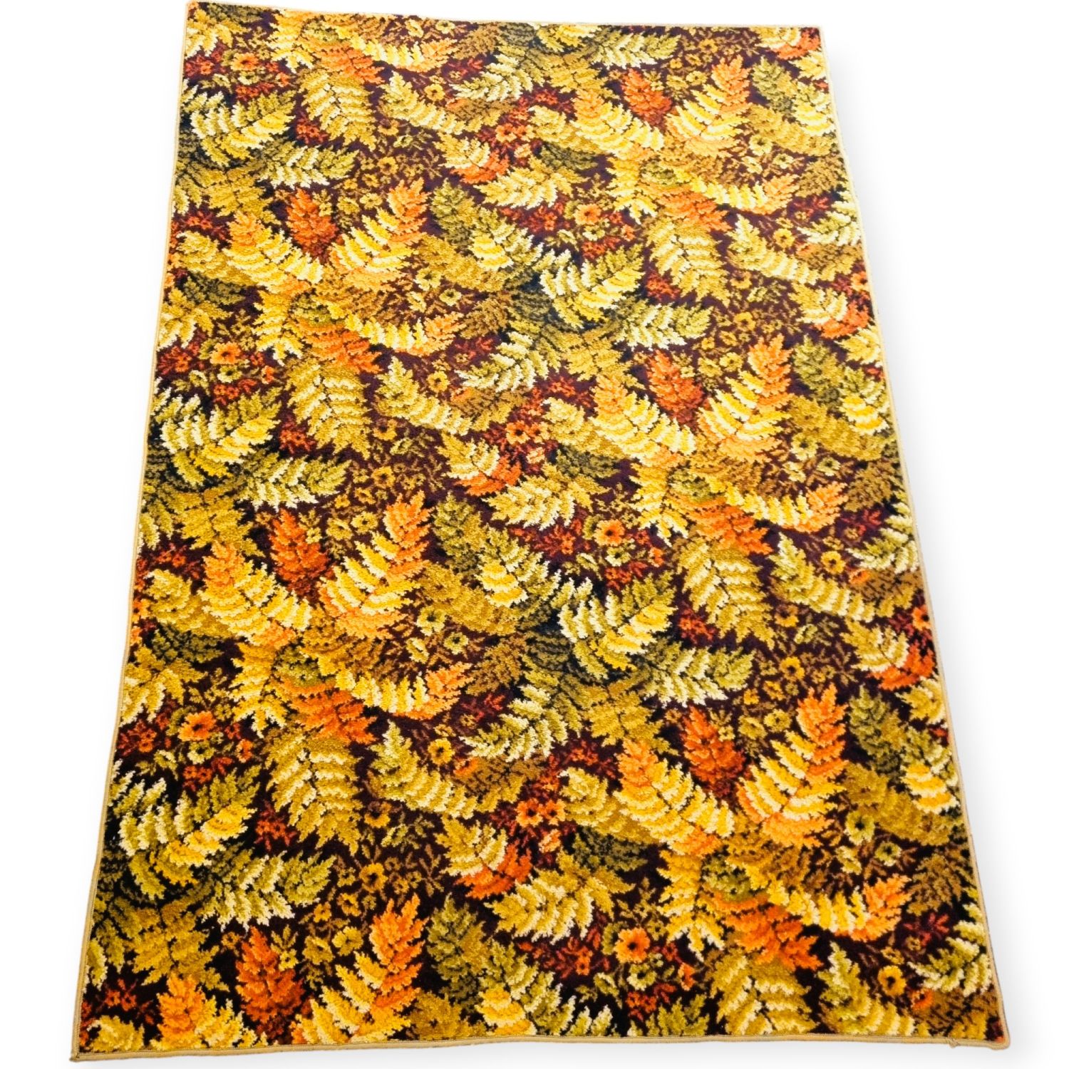 tollas páfránylevelek élénk sárga narancs és barna árnyalatban. Üde és exkluzív hatást kelt egy vintage stílusú szobabelsőben. Korának megfelelő állapotú. Méretei : 260 x 180 x 2 cm.