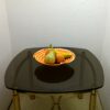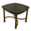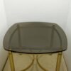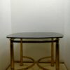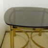 Elegáns réz szerkezetű dohányzóasztal, füstüveg lappal, lábán apróbb kopásoktól eltekintve, egyből lakásba illeszthető állapotú.