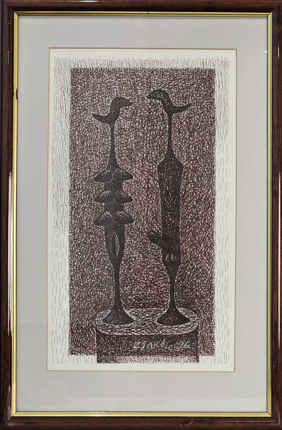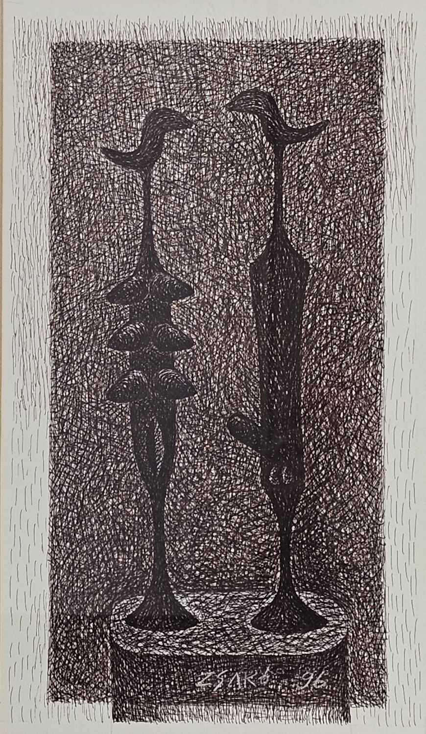 Zsakó István: Madárfejű pár c. grafika (tus, papír)