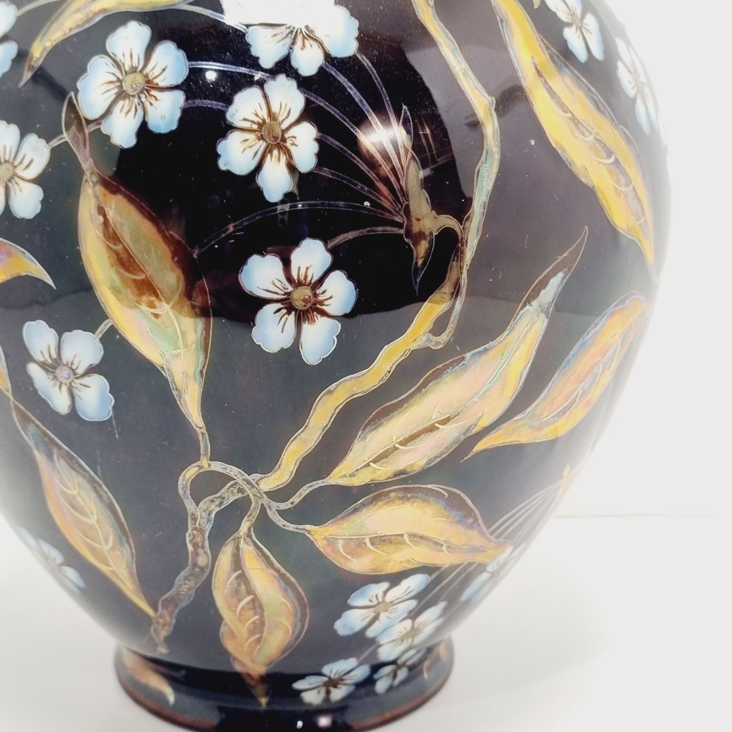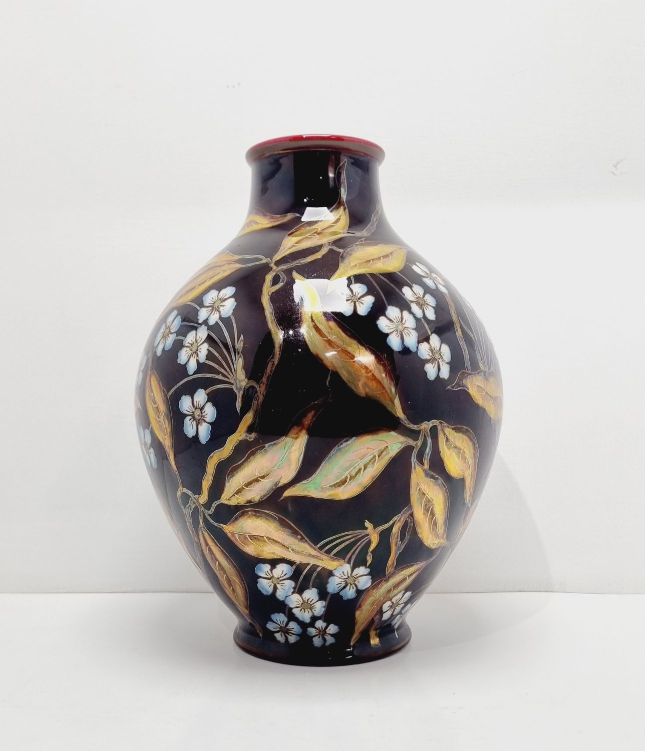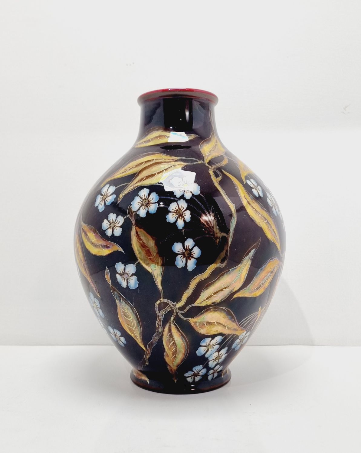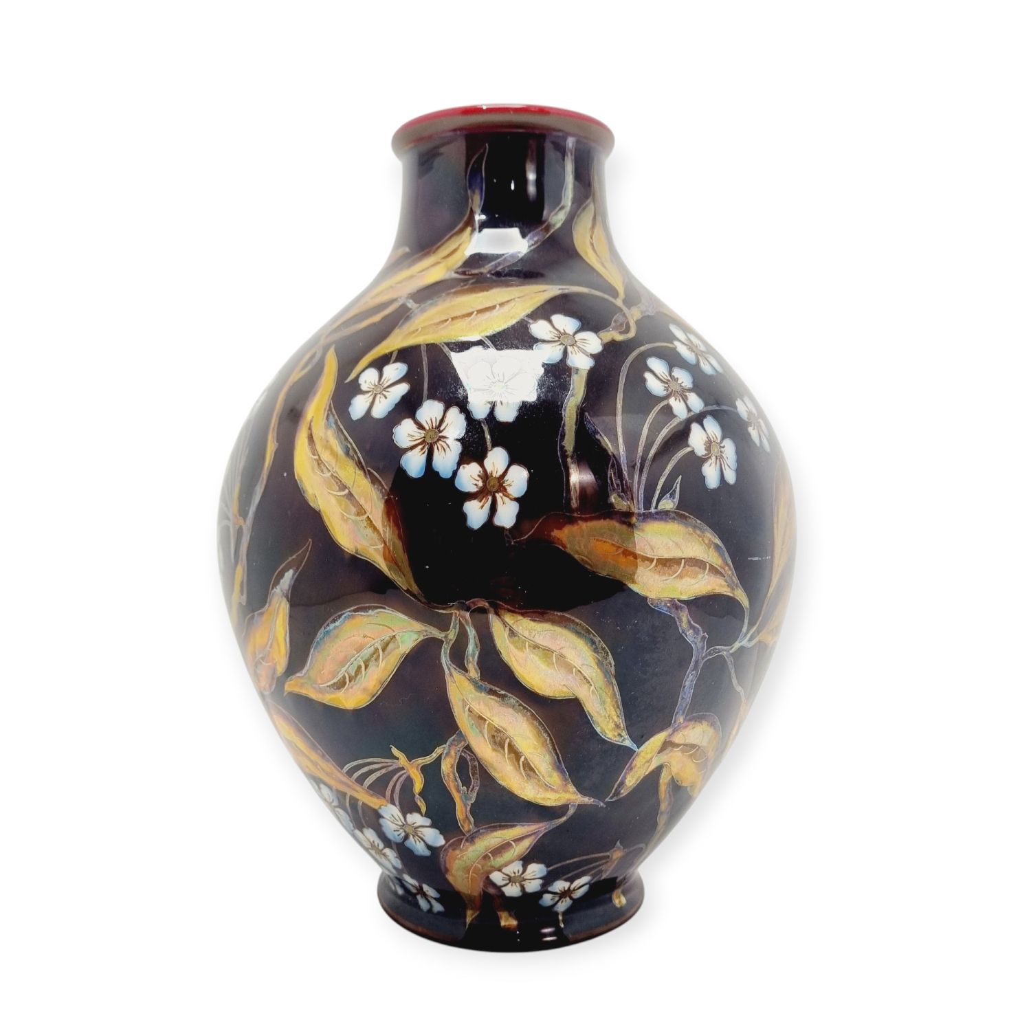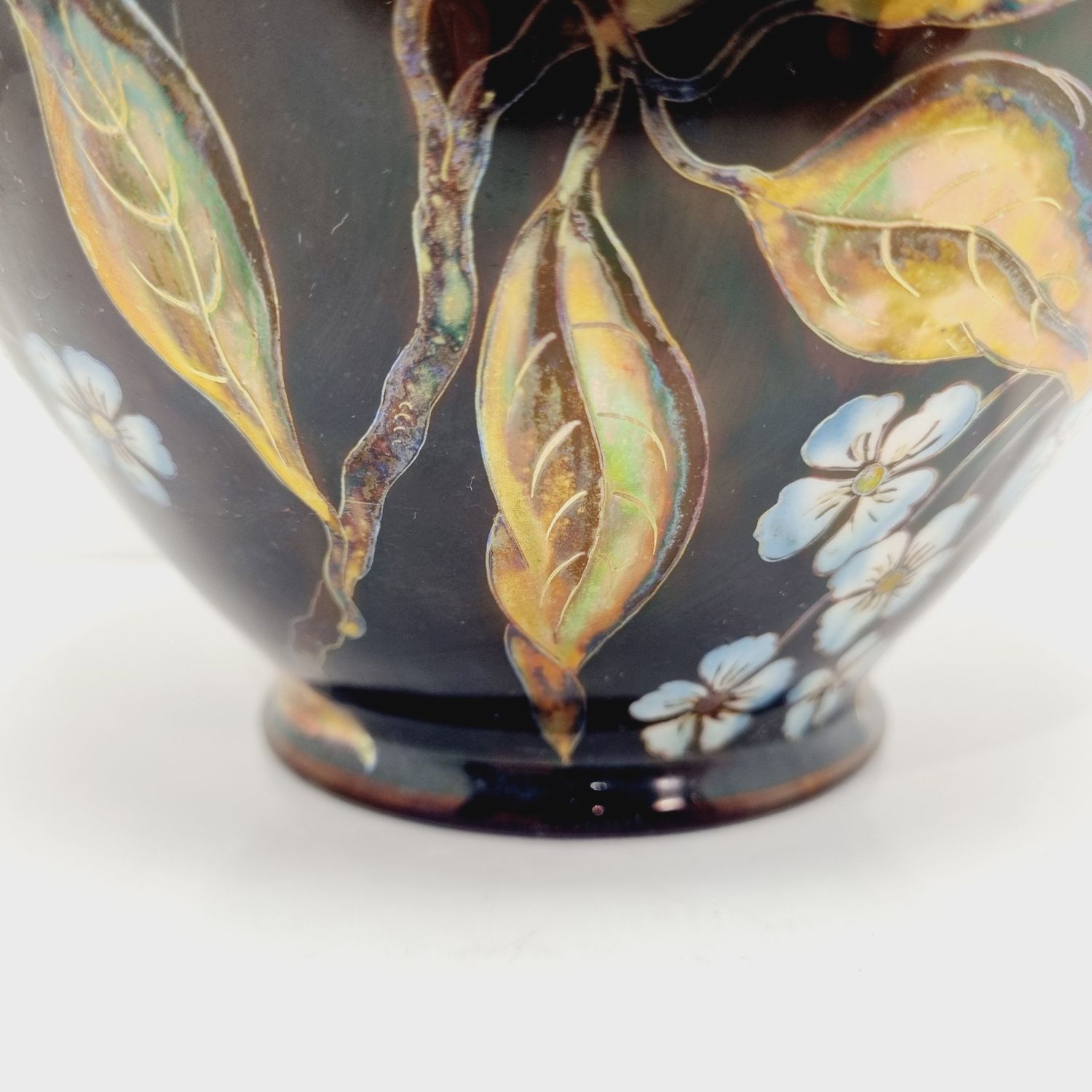 Zsolnay váza az 1930-as évekből. Kézzel festett kerámia, melynek felületén a levelek és a virágok irizáló, gyöngyházfényű hatást keltenek. Jelzett. Korának megfelelő állapotú. Ritka, gyűjtői darab. Méretei : 26 x 18 x 18 cm.