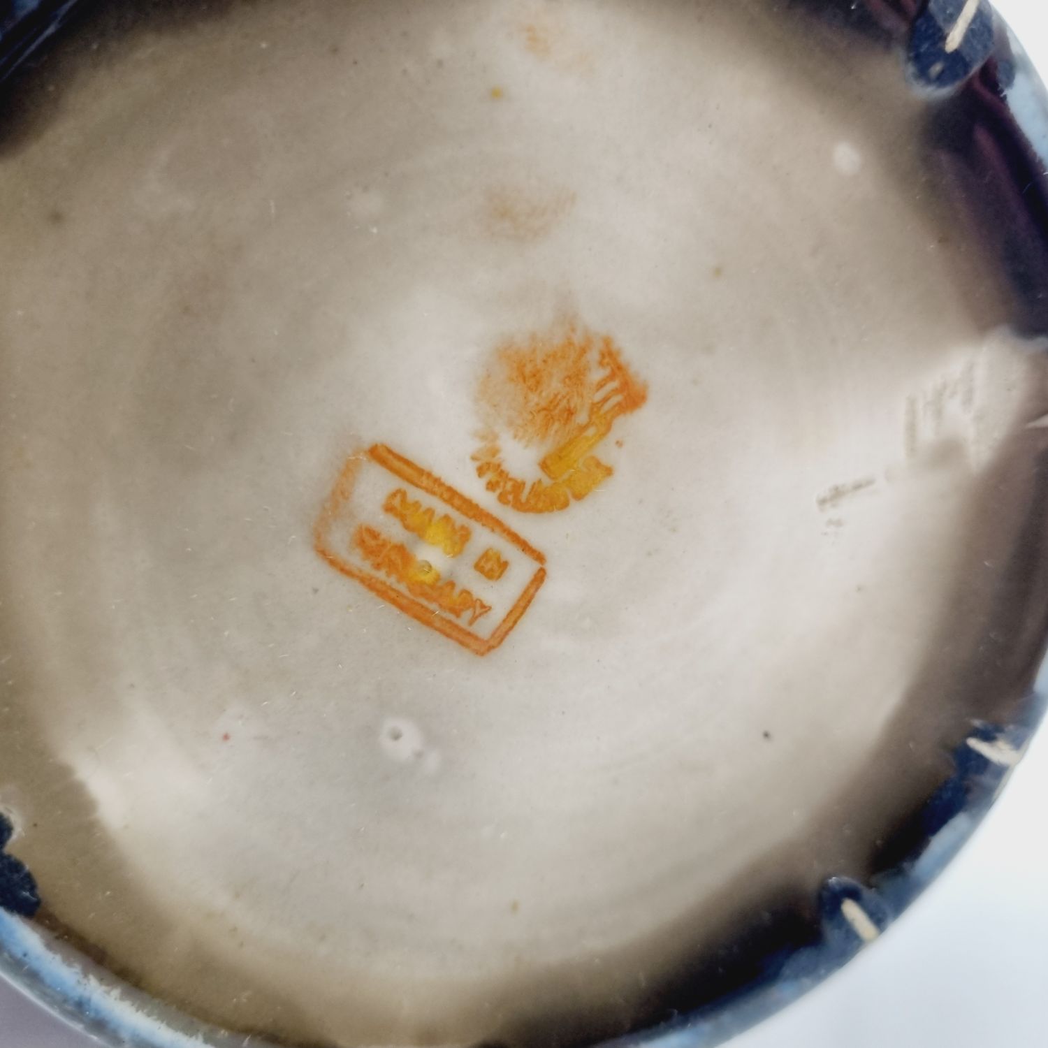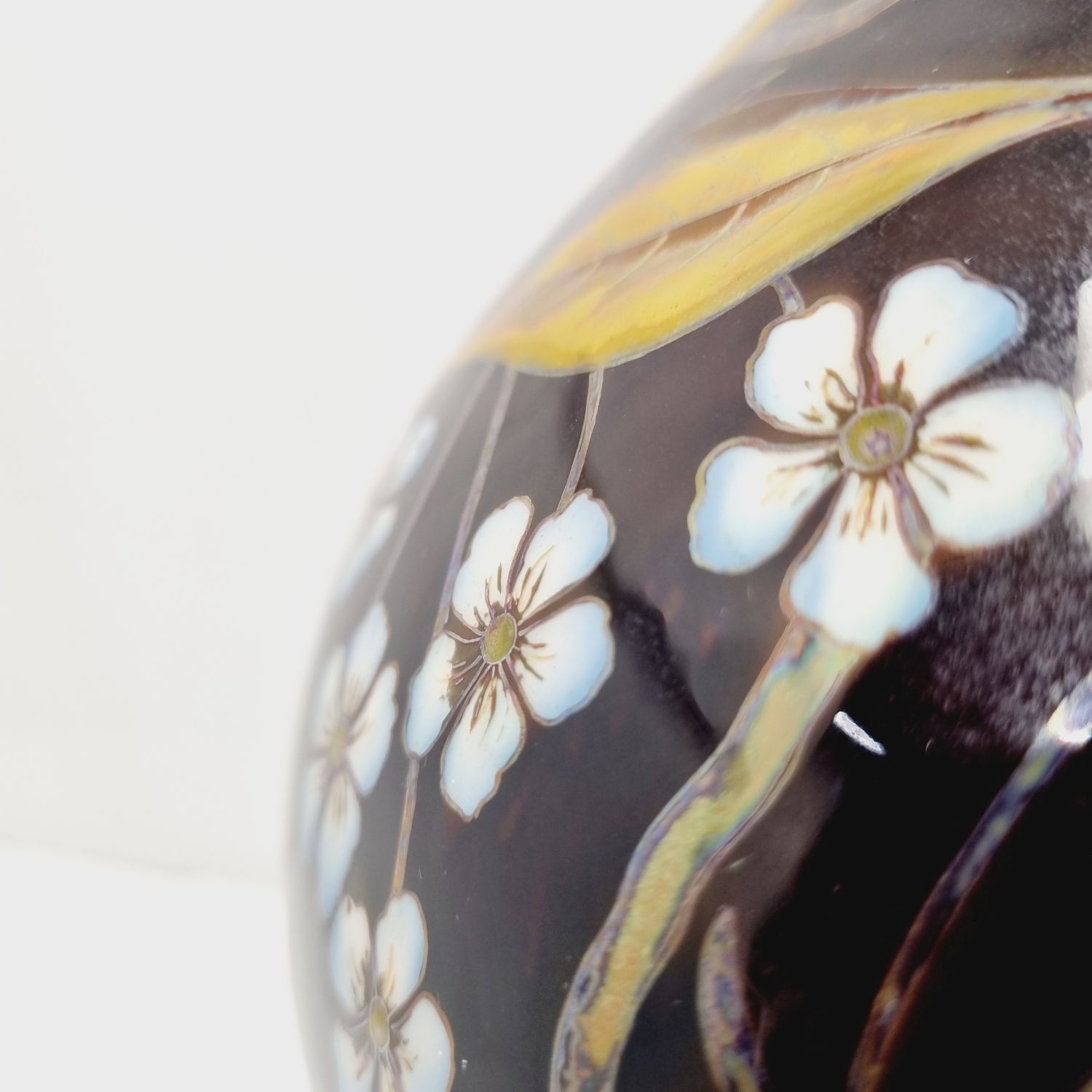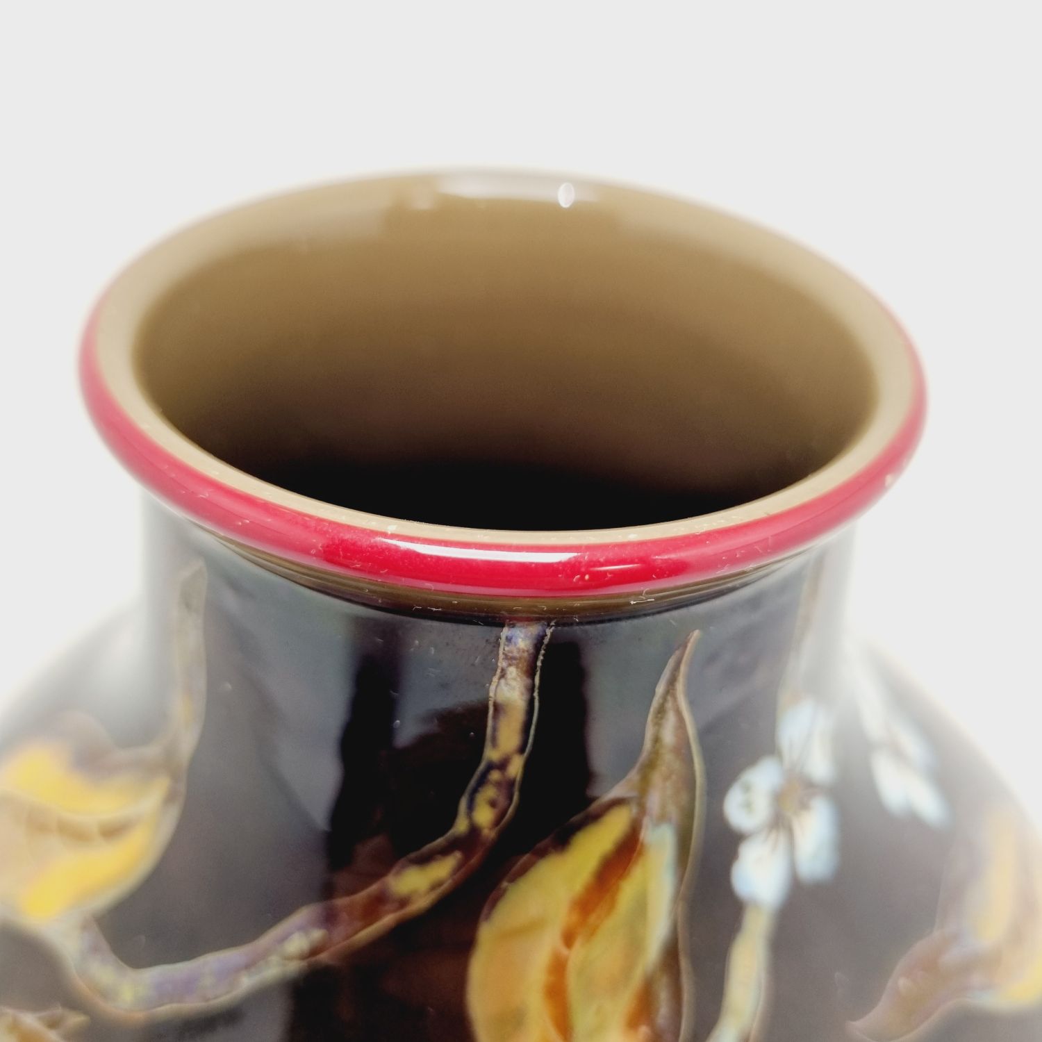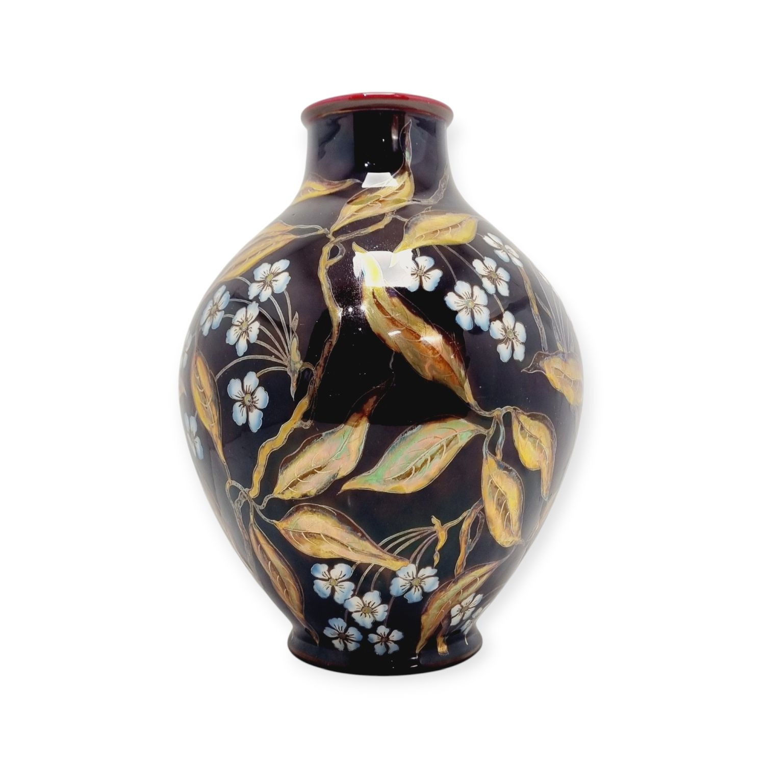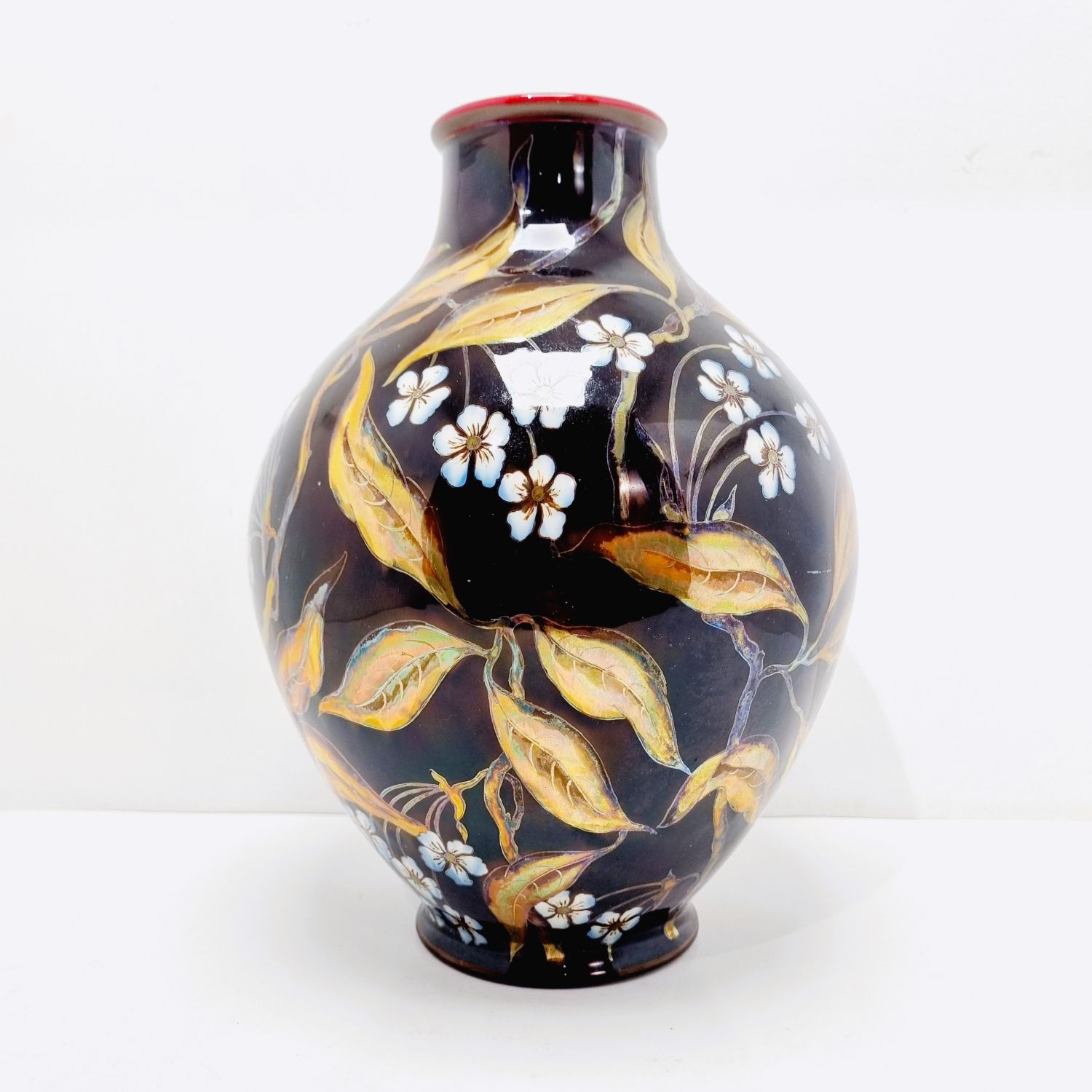 Zsolnay váza az 1930-as évekből. Kézzel festett kerámia, melynek felületén a levelek és a virágok irizáló, gyöngyházfényű hatást keltenek. Jelzett. Korának megfelelő állapotú. Ritka, gyűjtői darab. Méretei : 26 x 18 x 18 cm.