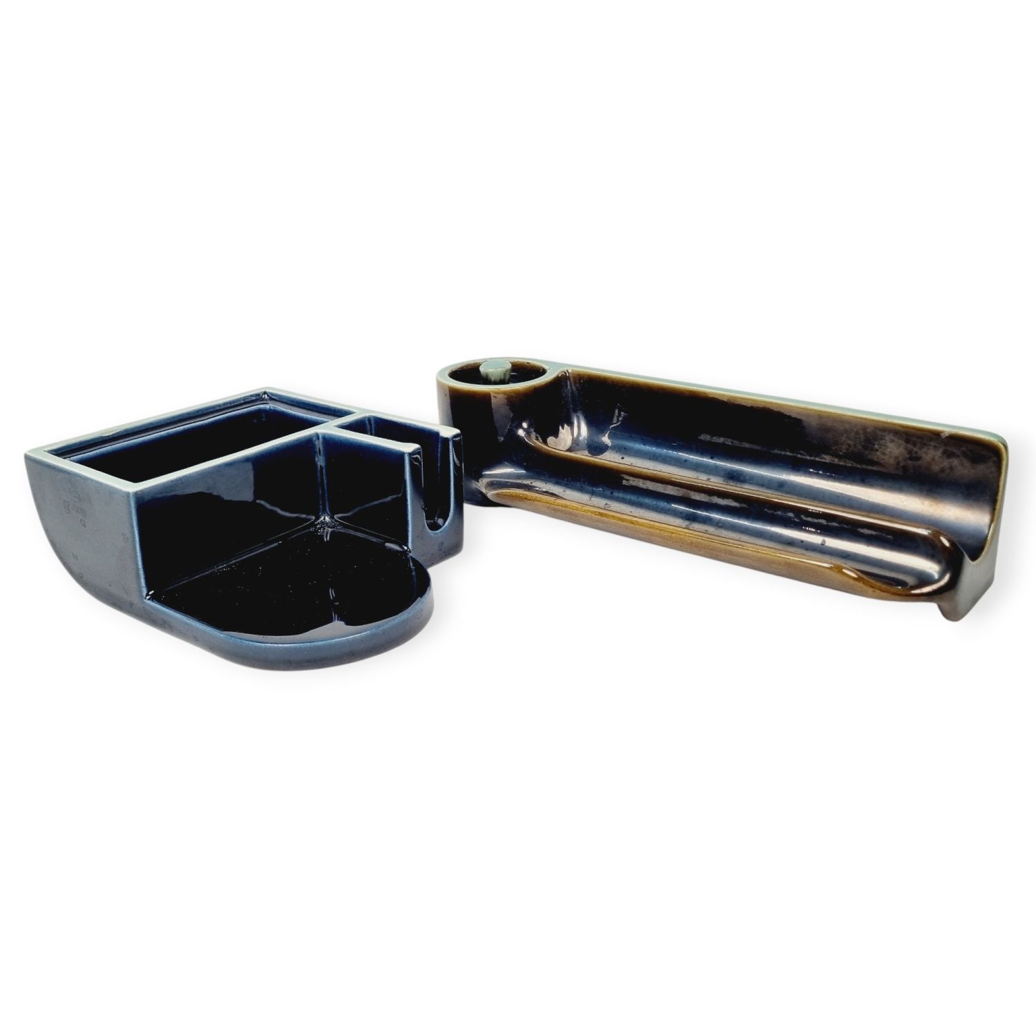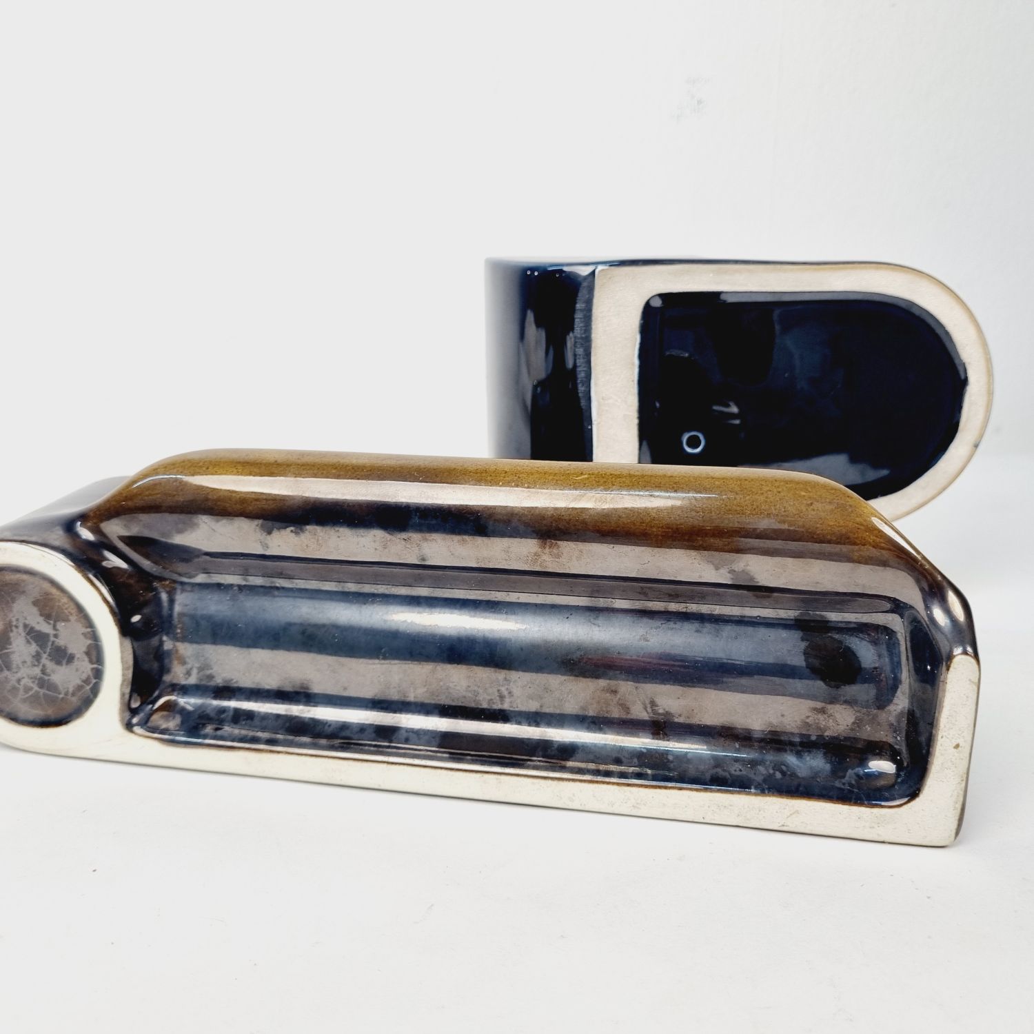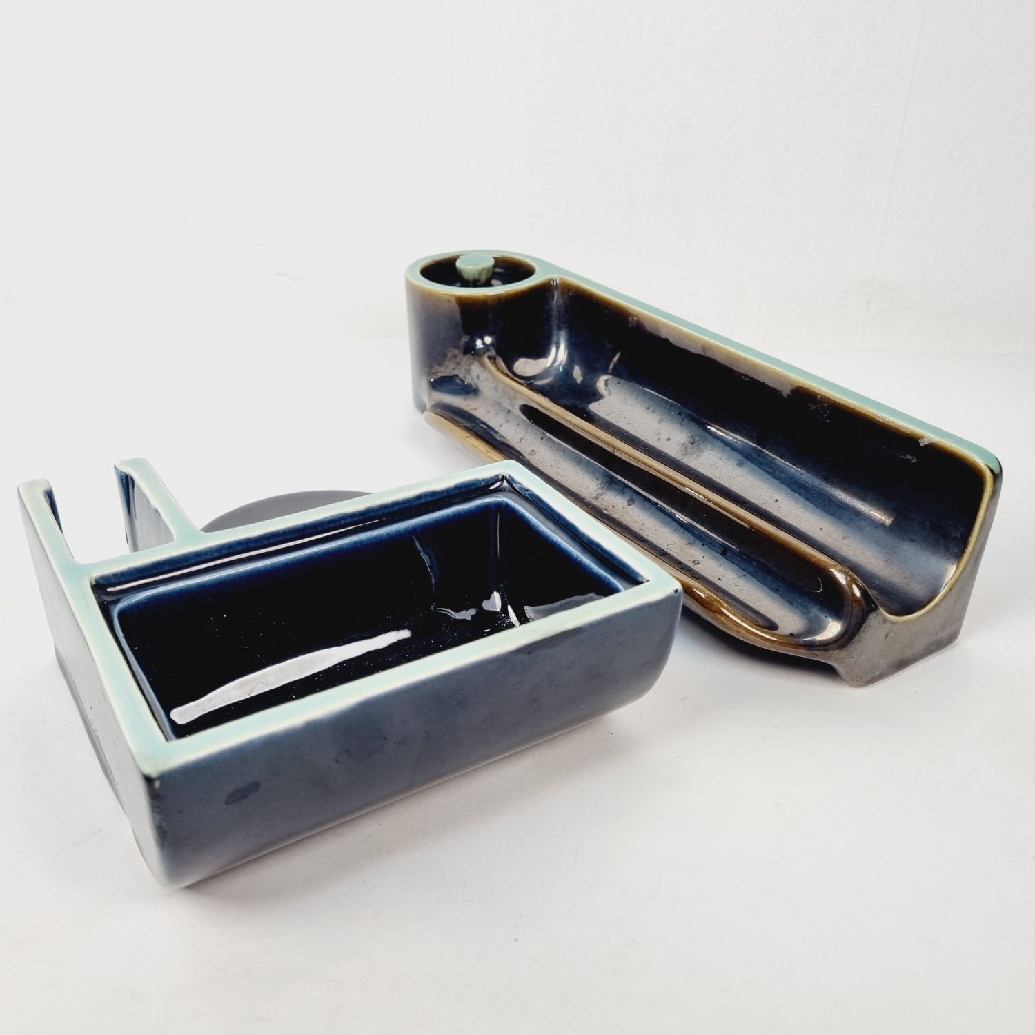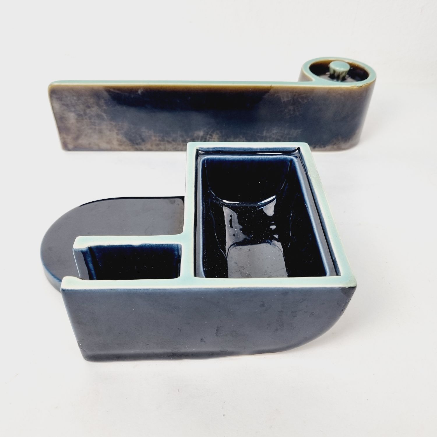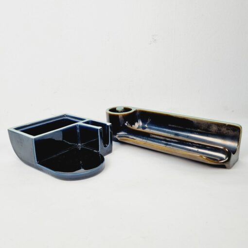 Zsolnay majolika íróasztal (dohányzó) készlet, Gorka Géza és Gádor István terve alapján. Több részből álló praktikus, modernista stílusú dekorációs kellék az 1938-40-es évekből. Hibátlan. Méretei: